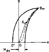 0 too 200 300 400 500 600 Fig. 68. Increase of inductance with a-c induction. increase and accounts for the flattening off in Fig. 68. Saturation of this sort may be avoided by limiting the value of the d-c flux. To illustrate the effect of these latter conditions, suppose that a reactor has already been designed for negligibly small alternating flux and operates as shown by the minor loop with center at G, Fig. 69. Without changing anything else, suppose that the alternating voltage across the reactor is greatly increased, so that the total a-c flux change is from zero to B. (Assume that the reactor still operates about point G.) The hysteresis loop, however, becomes the unsymmetrical figure OBmDO. The average permeability during the positive flux swing is represented by the line GBm, and during the negative flux swing by OG. The slope of GB is greater than that of the minor loop; hence, the first effect exhibited by the reactor is an increase of inductance. The increase of inductance is non-linear, and this has a decided ![]() Fig. 69. Change of permeability with a-c induction. 2 \16.7 83 or an increase of nearly 2; 1 over what would be anticipated from the measured value of inductance. This non-linearity could be reduced by increasing the air gap somewhat, thereby reducing Нас- Moreover, the average permeability increases, and so docs the inductance. It will be apparent that decreasing Нас further means approaching in value the normal permeability. This can be done only if the maximum flux density is kept low enough to avoid saturation. Conversely, it follows that, if saturation is present in a reactor, it is manifested by a decrease in inductance as the direct current through the winding is increased from zero to full-load value. In a reactor having high a-c permeability the equivalent length of core lc/}x is likely to be small compared to the air gap Ig. Hence, it is vitally important to keep the air gap close to its proper value. This is, of course, in marked contrast to reactors not subject to high a-c induction. If a choke is to be checked to sec that no saturation effects are present, access must be had to an inductance bridge. With the proper values of alternating voltage across the reactor, measurements of inductance can be made with various values of direct current through it. effect upon the performance of the apparatus. An inductance bridge measuring such a reactor at the higher a-c voltage would show an inductance corresponding to the average slope of lines OG and GBm-That is, the average permeability during a whole cycle is the average of the permeabilities which obtain during the positive and negative increments of induction, and it is represented by the average of the slopes of lines OG and GBm. But if the reactor were put in the filter of a rectifier, the measured ripple would be higher than a calculated value based upon the bridge value of inductance. This occurs because the positive peaks of ripple have less impedance presented to them than do the negative peaks, and hence they create a greater ripple at the load. Suppose, for example, that the ripple output of the rectifier is 500 volts and that this would be attenuated to 10 volts across the load by a linear reactor having a value of inductance corresponding to the average slope of lines OG and GBm. With the reactor working between zero and Вт, suppose that the slope of OG is 5 times that of GBm- The expected average ripple attenuation of 50:1 becomes 16.7:1 for positive flux swings, and 83.3:1 for negative, and the load ripple is 1 /500 500 \ - -+-) = 18 volts If the inductance reniains nearly constant up to normal direct current, no saturation is present, and the reactor is suitable for the purpose. If, on the other hand, the inductance drops considerably from zero direct current to normal direct current, the reactor very probably is non-linear. Increasing the air gap may improve it; otherwise, it should be discarded in favor of a reactor which has been correctly designed for the purpose. Filter reactors subject to the most alternating voltage for a given direct voltage are those used in choke-input filters of single-phase rectifiers. The inductance of this type of reactor influences the following: Value of ripple in rectified output. No-load to full-load regulation. Transient voltage dip when load is suddenly applied, as in keyed loads. Peak current through tubes during each cycle. Transient current through rectifier tubes when voltage is first applied to rectifier. It is important that the inductance be the right value. Several of these effects can be improved by the use of swinging or tuned reactors. In a swinging reactor, saturation is present at full load; therefore the inductance is lower at full load than at no load. The higher inductance at no load is available for the purpose of decreasing voltage regulation. The same result is obtained by shunt-tuning the reactor, but here the inductance should be constant from no load to full load to preserve the tuned condition. In swinging reactors, all or part of the core is purposely allowed to saturate at the higher values of direct current to obtain high inductance at low values of direct current. They are characterized by smaller gaps, more turns, and larger size than reactors with constant inductance ratings. Sometimes two parallel gaps are used, the smaller of which saturates at full direct current. When the function of the reactor is to control current by means of large inductance changes, no air gap is used. Design of such reactors is discussed in Chapter 9. The insulation of a reactor depends on the type of rectifier and how it is used in the circuit. Three-phase rectifiers, with their low ripple voltage, do not require the turn and layer insulation that single-phase rectifiers do. If the reactor is placed in the ground side of the circuit one terminal requires little or no insulation to ground, but the other terminal may operate at a high voltage t