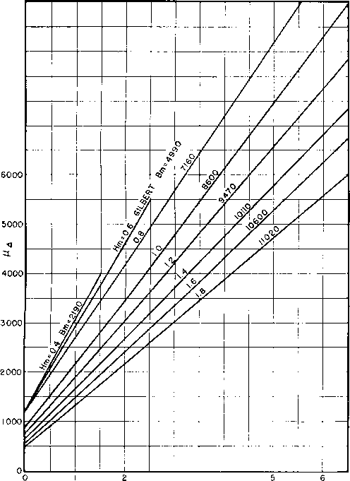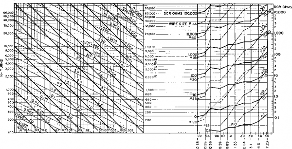 Fig. 67. Fixed air-gap curves. For B 5., air gap is not critical. fulness are indicated by the scale Ig/lc. Hence Fig. 66 is determined mainly by the d-c flux conditions in the core and represents the most LP for a given amount of material. Figure 67 illustrates how the exact value of air gap is of little consequence in the final result. The dotted curve connecting В and С is for a 6-rail gap. Point Y represents the maximum inductance that could be obtained from a given core for Nl/lc = 19. Point Y is the inductance obtained if a gap of either 4 or 8 rails is used. The difier- Г 5.3 = .53 X 10 In Fig. 66 the abscissa corresponding to LP/V = 53 X 10 is Nl/h = 25 for silicon steel. The ratio of air gap to core length Ig/lr is between 0.0005 and 0.001. A4/lc = 25 Л' = (25 X 7.5)/0.020 - 9,350 turns The total air gap is nearly 0.001 X 7И or 7.5 mils; the gap at each joint is half of this value, or 3.75 mils. The conditions underlying Hannas method of design are met in most applications. In receivers and amplifiers working at low audio levels, the alternating voltage is small and hence the alternating flux is small compared to the steady flux. Even if the alternating voltage is of the same order as the direct \oltage, the alternating flux may be small, especially if a large number of turns is necessary to produce the required inductance; for a given core the alternating flux is inversely proportional to the number of turns. D-c resistance of the coil is usually fixed by the regulation or size requirements. Heating seldom affects size. 38. Reactors with Large A-C Flux. With the increasing use of higher voltages, it often happens that the a-c flux is no longer small compared to the d-c flux. This occurs in high-impedance circuits where the direct current has a low value and the alternating voltage has a high value. The inductance increases by an amount depending on the values of a-c and d-c fluxes. Typical increase of inductance is shown ence in inductance between Y and У is 4 per cent, for a difference in air gap of 33 per cent. An example will show how easy it is to make a reactor according to this method. Example. Assume a stack of silicon-steel laminations having a cross section in. by Ji in., and with iron filling 92 pei- cent of the space. The length of the flux path Ic in this core is 7И in. It is desired to know how many turns of wire and what air gap are necessary to produce 70 henrys when 20 ma direct current are flowing in the winding. This problem is solved as follows: Ac = (0.875)2 у 92 0.71 sq in. V - 0.71 X 7.5 = 5.3 LP 70 X 4 X 10- in Fig. 68 for a reactor working near the saturation point. Increasing a-c flux soon adds to the saturation, which prevents further inductance VXI04