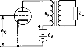![]() TRANSIENT CONDITIONS WHEN RECTIFIER IS STARTED T AEd ![]() VOLTAGE DIP AEo VOLTAGE RISE AEr TRANSIENT CONDITIONS WITH VARIABLE LOAD Fig. 101. Four transient conditions in choke-input filter circuit and curves. ic) Two-Stage Filters. In a filter лvith two identical stages, Fig. 84(6), the chart can be used if it is recognized that the ripple is that on the load side of the first choke. For example, if the filter consists of two stages both equal to that in the example given for the single-stage filter, the ripple would not be -100 db but -75 db, because of the fact that the rectifier output has (per Table VII) only 4 per cent ripple, which is -25 db. The regulation in a tлvo-stage filter, as far as capacitor effect is concerned, depends upon the inductance of the first choke as in the single-stage filter. Therefore the chart applies directly to the inductance and capacitance of one stage. The peak ripple current likewise depends u})on the inductance of the first choke, regardless of the location of the bleeder resistor. Transients, Ьолуеуег, are more complicated, owing to the fact that the two stages interact under transient conditions. 57. Rectifier Efficiency. Losses in a rectifier consist of transformer, tube, and filter losses. Filament power should be counted as loss, especially when a tube rectifier is compared with a rotating machine 1 See Proc. LR.E., 22, 213 (February, 1934). or metal disk rectifier. In spite of this loss, a high-voltage polyphase rectifier of the mercury-vapor or pool type may have 95 per cent efficiency at full load. In contrast, the rectifier for a radio receiver rarely has more than 60 per cent efficiency. Reasons for this low figure are the high tube and reactor IR drops and low transformer efficiency. The filament power, too, is a greater portion of the total. 58. Rectifier Tests. Even though the transformers, chokes, tubes, and capacitors have been tested before assembly of the rectifier, performance tests of the rectifier are desirable. These generally include tests of output, regulation, efficiency, ripple, and input kilovolt-amperes or power factor. Accurate meters should be used, and polyphase rectifiers should have balanced supply voltages. Wiring is tested at some voltage higher than normal, preferably with transformers, tubes, and capacitors disconnected to avoid damage during the test. Ordinary care in testing is sufficient except for regulation tests. If the regulation is low, the difference in meter readings at no load and full load may be inaccurate. Differential measurements are sometimes used, such as a voltmeter connected between the rectifier and a fixed source of the same polarity and voltage. Artificial loading of a high-voltage rectifier is often a problem. Water rheostats have been used for this purpose. Load tests, preferably in combination with the transmitter or other apparatus which the rectifier is to supply, are safeguards against field troubles. Operating tests are essential when the load is keyed or modulated, so that overheating or inadequate transformer operation may be detected. Ripple is measured either with a special hum-measuring instrument or with a capacitance-resistance network arranged to block the direct current from the measuring circuit. Capacitance and resistance values in the measuring circuit should be so chosen as to avoid influencing the ripple or loading the rectifier transformer. Sometimes capacitance dividers are used for this purpose. The problem of proper alues becomes particularly critical with high-voltage low-current rectifiers. The effect of stray capacitance is especially important. 5. AMPLIFIER TRANSFORMERS An amplifier is a device for increasing voltage, current, or power in a circuit. The original wave form may or may not be maintained; the frequency usually is. An amplifier may be mechanical, electromechanical, electromagnetic, or electronic in form, or it may be a combination of these. In this chapter the transformer-coupled electronic ampbfier is considered. The amplifier consists of a vacuum tube, or similar device, with transformers, capacitors, and resistors. Input voltage or current is impressed on some element of the tube; this causes higher voltage or current to appear in the output circuit. 59. Amplifier Potentials. Electronic amplifiers are characterized by the use of tubes having three or more elements. In triodes or three-element tubes, the addition of the third element, the grid, alters the CATHODE ANODE ![]() CATHODE GRID ANODE ![]() POSITIVE GRID VOLTAGE NEGATIVE GRID VOLTAGE VOLTAGE GRADIENT IN DIODE VOLTAGE GRADIENTS IN TRIODE Fig. 102. Diode and triode voltage gradient. voltage gradient between cathode and anode as shown in Fig. 102. The grid either aids or opposes the flow of electrons from cathode to anode, depending on whether the grid voltage is positive or negative respectively, compared to the cathode, which is shown at zero voltage in Fig. 102. As the grid voltage is made more and more negative, electron flow is diminished and finally stops. At this point the anode current is zero; the condition is called anode current cut-off. If the grid voltage is made more and more positive, eventually further increase in grid voltage causes no additional anode current increase. This condition is called grid saturation. Tetrodes and pentodes have respectively two and three grids. The voltage gradient between cathode and anode is more complex than that indicated in Fig. 102. The advantages to be gained from the additional grids are mentioned below. 60. Transformer-Coupled Amplifiers. Amplifier circuits in which transformers are used can be represented by a circuit similar to that of Fig. 103(a). Here a triode is shown with a voltage во impressed upon the grid, which comprises the grid bias (a constant negative direct voltage) and a superimposed alternating voltage e. Anode ![]() Fig. 103. (a) Transformer-coupled amplifier; (b) equivalent circuit. voltage Ев is supplie
