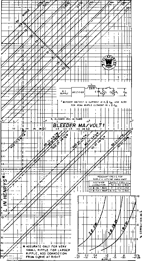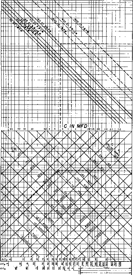 Главная » Журналы » Transformer elementary form 1 ... 11 12 13 14 15 16 17 ... 38 1. Ripple Voltage. With large rectifier commutation angles, or with grid-controlled rectifiers, a surge occurs once each ripple cycle. In the limit, this surge equals the rectifier peak voltage. 2. Initial Starting Surge. This surge adds to output d-c voltage. Under the worst conditions it raises the voltage at this point to twice normal and occurs every time rectifier plate voltage is applied. 60 CYCLES ![]() KEYED WAVE, NO FILTER ZERO KEYED WAVE WITH FILTER ![]() Fig. 99. Keyed wave shape with and without key-click filter. 3. Keying or Modulation Transient. Surge value depends upon constants L, С, and Rl, and is limited by considerations of wave shape. This occurs each time the key is opened or closed, or load is varied. 4. Short-Circuit Surge. If load Rl is suddenly short-circuited, it causes full d-c voltage to appear across the filter reactor until the circuit breaker opens. This occurs occasionally. Rectifiers are sometimes arranged so that, if the short circuit persists, the circuit breaker recloses 3 times and then remains open. 5. Interruption of Reactor Current. This surge voltage is limited only by losses and capacitance of the circuit, and it may be large, as shown by Fig. 73. Unless the reactor is designed to produce this voltage, it occurs only through accident. Conceivably, surges 1, 2, and 3 may occur simultaneously and add arithmetically. A reactor insulated to лvithstand surges 1 plus 2 plus 3 also would withstand surge 4. A reasonable value of peak surge voltage comprising these factors is 2/4 times the full d-c working voltage. If surges 1 and 5 are too much for reasonable insulation, the reactor is protected by a gap or other means. If a rectifier is disconnected from the supply line while the load is off, interruption of plate transformer peak magnetizing current may cause high voltages to appear at random in the windings in much the same way as reactor current interruption causes high voltages. This is especially true if the transformer operates at high core induction. The effect is partly mitigated by the arc energy incident to the opening of the disconnecting switch. But unless the plate transformer is insulated specifically to prevent dangerously high voltages, protective elements may have to be added in a rectifier subject to switching at light loads. The necessity for such protection may be estimated from exciting volt-ampere data plus the curves of Fig. 73. Insufficient attention sometimes is given to the manner in which power supply lines are brought into buildings. This is particularly important where a rectifier is supplied by o\erhead high-voltage lines. Because of their relatively high surge impedance, lightning and switching surges occurring on such lines may cause abnormally high voltages to appear in a rectifier and break down the insulation of transformers or other component parts. The likelihood of such surges occurring should be taken into account before the transformers are designed. Underground cable power lines impose much less severe hazards: first because they are protected from lightning strokes, and second because they have much lower impedance (about one-tenth that of overhead lines). Surges on these cables have much lower values compared to those on overhead lines carrying the same rated voltage. Protection against these surges varies with the type of installation. The best protection of all is provided by an indoor power system with an underground cable connecting it to the rectifier. Good protection is afforded by oil-insulated outdoor surge-proof distribution transformers, stepping down to the rectifier a-c power supply voltage, with an underground cable between the distribution transformer and rectifier. No protection at all is provided when overhead lines come directly into the rectifier building. With the trend to dry-type insulation, it is desirable to use lightning arresters on overhead lines where they enter the building. Because of their low impulse ratio, dry-type transformers require additional arresters inside the building. When a line surge is discharged by a lightning arrester, there is no power interruption. 56. Rectifier Filter Charts. From the preceding sections, it can be seen that various properties of rectifier filters, such as ripple, regula- tion, and transients, may impose conflicting conditions on rectifier design. To save time in what otherwise would be a laborious cut-and-try process, charts are used. In Fig. 100 the more usual filter properties are presented on a single chart to assist in arriving at the best filter directly. This chart primarily satisfies ripple and regulation equations 46 and 53 for a choke-input filter. Abscissa values of the right-hand scale are bleeder conductance in milliamperes per volt, and of the left-hand scale, filter capacitance in microfarads. Ordinates of the lower vertical scale are inductance in henrys. Lines representing various amounts of ripple in the load are plotted in quadrant I, labeled both in db and rms per cent ripple. In quadrant II, lines are drawn representing different types of rectifiers and supply line frequencies. A similar set of lines is shown in quadrant IV. Two orthogonal sets of lines are drawn in quadrant III. Those sloping downward to the right represent resonant frequency of the filter L and C, and also load resistance Вь- The other set of lines is labeled л/L/C, which may be regarded as the filter impedance. It can be shown that the transient properties of the filter are dependent upon the ratio of У L/C to R- The L scale requires a correction to compensate for the fact that ripple is not exactly a linear function of L but rather of - Xc. The curves in the lower part of quadrant IV give the amount of correction to be added when the correction is greater than 1 per cent. Instructions for Using Chart 1. Assume suitable value of bleeder resistance or blee