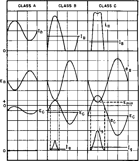 Главная » Журналы » Transformer elementary form 1 ... 12 13 14 15 16 17 18 ... 38 (58) Although transformer-coupled amplifiers are used sometimes for voltage amplification, they are used mostly where power output is required of the amplifier and where a good reproduction of the grid voltage is required in the plate circuit. 61. Tuned Amplifiers. Figure 104 shows the circuit for an amplifier in which the output voltage appears across a parallel-tuned circuit. ![]() Fig. 104. Tuned amplifier. This circuit is shown coupled to a load Z. This type of amplifier may be used where large outputs are required, but the voltage вр is not necessarily a reproduction of e, and they are not related as in equation 58. 62. Amplifier Classification. Amplifiers can be divided into classes, depending upon the mode of operation. A class A amplifier is one in which the grid bias and alternating grid voltage are such that anode current fiows continuously. In a class В amplifier the grid bias is almost equal to the cut-off value, so that plate current is nearly zero when no exciting grid voltage is applied. When full alternating grid Altage is applied, plate current flows for approximately one-half of each cycle. A class С amplifier has a grid bias greater than the cut-off value, so that the plate current is zero when no alternating grid voltage is applied and it flows for appreciably less than one-half of each cycle when an alternating grid voltage is applied. These classes are illustrated in Fig. 105, in which the alternating plate current, plate voltage, grid voltage, and grid current are shown with the steady or average values which are, respectively, Ib, Eb, Ec, and Iq. Relative plate and grid voltage amplitudes for these three types of amplifiers are shown in Fig. 105, and other properties are summarized in Table XI. Class A amplifiers are characterized by comparatively high no-signal anode current. Usually the grid never swings positive. Anode cur- PLATE CURRENT PLATE VOLTAGE GRID VOLTAGE GRID CURRENT ![]() Fig. 105. Amplifier voltages and currents. Table XI. Amplifier Classes Amplifier Class Anode efficiency a. Theoretical maximum 50% b. Practical value for low distortion Output proportional to eg Grid current Ig None Anode current Is Fairly В 78.5% * Up to 30% 40-67% Small eg = Of Ib low 100% с 70-85% t Eb (grid saturated) Large (may ~ Is) eg=Q,lB=0 constant eg = max, I в high eg = max, I в high * These values are for push-pull amplifiers. t With a high-Q tank circuit, the efficiency depends on excitation power. ![]() ![]() rent remains comparatively constant, when averaged over a whole a-c cycle. In class В amplifiers, the grid is biased at a greater negative potential so that current is nearly cut off in the absence of a signal. Positive swings of grid voltage result in anode current being drawn; this causes a dip in the residual voltage on the plate of the amplifier. Negative grid swings cause no plate current to flow but do cause a positive plate voltage swing. In class С amphfiers, the grid is biased more negatively still, with the result that plate current flows for less than half a cycle, and mostly when the plate voltage on the tube is at a relatively low value. Grid current in this class of amplifier reaches values comparable to the plate current. Output voltage wave form is maintained by a tuned plate circuit. Operation may sometimes be im-proл^ed by the use of two tubes connected push-pull, as shown in Fig. 106. This is the most common connection for class В amplifiers; also, it is frequently used in class A amplifiers. Intermediate between class A and class В amplifiers are those known as class AB with grid bias and efficiency intermediate between class A and class В amplifiers. Such amplifiers are further subdivided into class ABi and class AB2. Class ABi amplifiers draw no grid current, but the bias voltage is somewhat higher than the class A value and the plate current may be discontinuous during the cycle when grid signal is applied. Class AB2 amplifiers draлv grid current but are not biased as close to cut-off as class В amplifiers. Both class ABi and AB2 amplifiers are commonly used with the push-pull connection. Tube properties such as plate resistance r, amplification factor and mutual conductance may be calculated from data published for each tube in the form of characteristic curves. Operating conditions such as plate- and grid-voltage swings, power output, plate dissipation, and efficiency also arc found from these curves. Theoretical discussions of such data may be found in books on amplifiers. 63. Decibels; Impedance Matching. In amplifier work, the ratio of two voltages -EJi and E2 at the same impedance 1еЛе1 is often stated in decibels (db) according to the definition Fig. 106. Push-pull amplifier. ![]() (60) where L and С are the inductance and capacitance per unit length. If such a line terminates in a pure resistance load equal in ohmic value to Zo, all the power fed into the line appears in the load without attenuation or reflection. This is called matching the impedance of the line. It is very desirable to save audio power and avoid reflections; therefore impedance matching of lines is the usual practice wherever possible. The notion has been extended to include the loading of vacuum tubes, but this is stretching the meaning of the term matching. A vacuum tube has its optimum load impedance, but the value depends upon the conditions of tube operation and is not necessarily the same as the tube internal impedance. Power transmission lines operating at 60 cycles are rarely long enough to act as appreciable source impedances. When a short-circuit or low-impedance fault occurs on the load side of a power transformer, the load current is limited mainly by the transformer short-circuit impedance. In a vacuum-tube amplifier, the load current delivered into a short-circuited load is limited mainly by the vacuum-tube internal resistance rather t