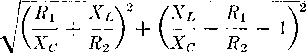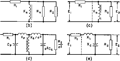 0.4 0.6 0,8 1.0 2.0 4.0 6.0 8.0 10.0 Fig. 108. Transformer characteristics at low frequencies. The equivalent voltage ratio E2/E1 has maxima of 0.5, 0.667, and 1.0 for cases (ct), (6), and (c), respectively, at the median frequency, or for Xn/Ei = 00 in Fig. 108. The higher ОСЬ, the nearer the transformer voltage ratio approaches median-frequency value. The lower the value of loading resistance R2, the lower the equivalent voltage ratio is. The factors 0.5, 0.667, and 1.0 multiplied by the turns ratio, a, give the actual voltage ratio at median frequency. At lower frequencies, the factors diminish. The transformer loaded by the lowest resistance has the best low-frequency characteristic. A transforaier having an open-circuit secondary has twice the voltage ratio and gives the same response at twice the low end frequency of a line-matching transformer of the same turns ratio. Figure 108 is of direct use in determining the proper value of primary OCL. Permissible response deviation at the lowest operating frequency fixes Xjs/Ri and therefore Хдг. At the corresponding frequency, this represents a certain value of primary OCL. As this inductance determines the size and weight of the transformer, the importance of Fig. 108 is evident. If the primary and equivalent (1:1) secondary winding resistance each are 5 per cent of Ei, the total effect will be a decrease of 10 per cent in the median-frequency voltage ratio, in the case of the line-matching transformer, with corresponding decreases at lower frequencies. On the other hand, the primary resistance of an open secondary transformer has no effect upon the median-frequency voltage ratio but has some effect at lower frequencies, whereas the secondary resistance has no effect either at median or at lower frequencies. Hence it is important in the open secondary case, for the sake of low-frequency response, to keep the primary winding resistance low, but the secondary winding resistance may be any value. The maximum number of secondary turns may be determined by the smallest practicable wire size rather than by winding resistance. As the frequency increases, the primary inductive reactance Xn also increases until it has almost no effect upon frequency response. This is true for median frequency in Fig. 108. It is also true for higher frequencies; in other words, the OCL has an influence only on the low-frequency end of the frequency response curve. The ratio of R2 to Ri still limits the voltage ratio, however. If the amplifier works at one frequency only, OCL is determined by the deficiency in voltage gain that can be tolerated in the amplifier design. This can be found in Fig. 108. ![]() In equation 63 the term Xl/Xc may be written 4:tfLC = f/f/, where 1/(2тг\/LC) = fr, the resonance frequency of the leakage inductance and wdnding capacitance, considered as lumped and without resistance. Also Xl/R2 = Xcf/R2fr- Assign to the ratio Xc/Ri a value В at frequency fr. Then at any frequency /, Xc/Ri = Bfr/f. In the three cases considered at the low frequencies, R2 = Rl, R2 - E2 Ё1 (63a) (63b) In an amplifier with a band of operating frequencies, e.g., the audio band, a well-designed transformer has uniform voltage ratio for a frequency range extending from the frequency at which Xr ceases to exert any appreciable influence, upward to a zone designated as the high-frequency end of the transformer frequency range. 66. High-Frequency Response. The factors that influence the high-frequency response of a transformer are leakage inductance, winding capacitance, source impedance, and load impedance. Hence a new equivalent diagram, Fig. 107(d), is necessary for the high-frequency end. Winding resistances are omitted or combined as in Fig. 107(b). Winding capacitances are shown across the windings. If primary and secondary leakage inductances and capacitances are combined, Хдг is omitted as if it were infinitely large, and is dropped as before, the circuit becomes that shown in Fig. 107(e). is the leakage reactance of both windings, Xc the capacitive reactance of both windings, and 7?2 the load resistance, all referred to the primary side on a 1:1 turns-ratio basis. At any frequency, the equivalent voltage ratio in the circuit of Fig. 107(e) can be found by the ratio of impedances, as for the low-frequency response. The scalar value is ![]() (63c) Equations 63a, b, and с are plotted in Figs. 109, 110, and 111. If Xc/Ri has certain values at frequency fr, the frequency characteristic is relatively flat up to frequencies approaching fr. In particular, performance is good at 5 = 1.0 in all three figures.