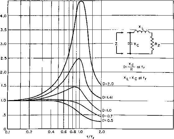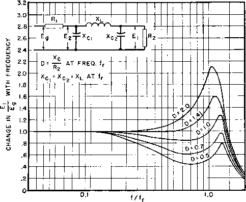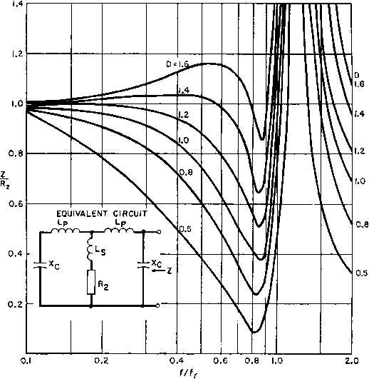 Fig. 125. Rise in plate current due to transformer impedance change at high frequencies. high power output. Plate resistance is very high in pentodes and beam tubes, of the order of 10 times the load resistance. Pentodes are essentially constant-current devices. The value of load impedance is thus an indication of the output voltage, at least for low frequencies. Response of a low-frequency transformer-coupled pentode amplifier can be taken from Fig. 118. At high frequencies, leakage inductance of the transformer intervenes between the pentode and its load, so that the primary voltage and secondary or load voltage are not identical. In Fig. 127 the change of output voltage for a constant grid voltage at high frequencies is shown. In this figure, the equivalent circuit is a pi-filter, which is ![]() 100 - 300 400 PLATE VOLTS Fig. 126. Plate characteristics of type 6L6 beam tube. desirable for pentode transformers, and is approximated when the transformer ratio is 1:1. Harmonic content of pentodes is high, especially in single-side amplifiers. Large phase angle and low load impedance produce undesirable distortion. It is best to use values of Хдт/Дз greater than 2 in Fig. 118 at the lowest frequency to avoid distortion. ![]() Fig. 127. Pentode frequency response with pi-filter output circuit. Semiconductor amplifiers known as transistors have emitter, collector, and base electrodes; these are analogous, respectively, to grid, plate, and cathode in a vacuum tube. Emitter and collector currents are of the same order of magnitude in grounded-base transistors, but collector impedance is much larger than emitter impedance. To match impedances, transformer coupling is often used between stages of transistor amplifiers. Junction transistors resemble pentode amplifiers in having nearly constant collector current over a large range of collector voltage. Hence junction transistor transformer operation closely resembles that of pentode vacuum-tube transformers, and the foregoing discussion is generally apphcable to both. 71. Calculation of Inductance and Capacitance. Transformer-coupled amplifier performance is dependent at low frequencies upon transformer OCL and at high frequencies upon leakage inductance ![]() where N = turns in winding Ac core area in square inches Ig = total length of air gap in inches Ic = core length in inches M = permeability of core (if there is unbalanced direct current in the winding, this is the incremental permeability). For concentric shell- or core-type windings the total leakage inductance referred to any winding is l{)mMT(2nc -f a) where N = turns in that winding MT = mean length of turn for whole coil a = total winding height b = winding width с = insulation space n = number of insulation spaces = number of primary-secondary interleavings (see Fig. 57, p. 75). Winding capacitance is not expressible in terms of a single formula. The effective value of winding capacitance is almost never measurable, because it depends upon the voltages at the various points of the winding. The capacitance current at any point is equal to the voltage across the capacitance divided by the capacitive reactance. Since many capacitances occur at different voltages, in even the simplest transformer, no one general formula can suffice. The major components of capacitance are from 1. Turn to turn. 2. Layer to layer. 3. Winding to winding. 4. Windin s to core. and winding capacitance. Calculation of these quantities is essential in design and useful in tests for proper operation. Inductance formulas are repeated here for convenience, along with capacitance calculations. 3 2NA OCL =--- (henrys) (38) 1 ... 14 15 16 17 18 19 20 ... 38 |