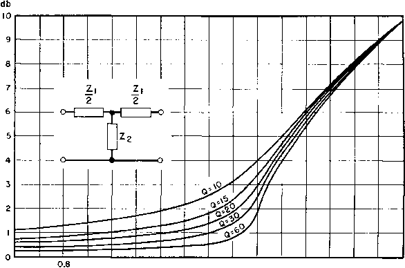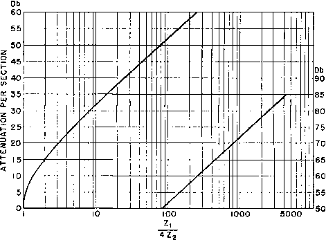 Главная » Журналы » Transformer elementary form 1 ... 16 17 18 19 20 21 22 ... 38 were the cathode grounded. This circuit is used when the output impedance Zl is variable or of low power factor so that normally it would be difficult to produce in it full output from the tube. The circuit has a low internal effective impedance as far as the output is concerned. It is approximately equal to the normal plate resistance Гр divided by the amplification factor of the tube. This is equivalent to saying that the effective internal impedance is approximately the reciprocal of the mutual conductance Qm, for class A or В amplifiers. Cathode followers have been used to drive grids of class В modulator tubes, which are highly variable loads. The circuit produces nearly constant output voltage but at the expense of increased grid swing. If the tube feeds a low impedance load, output may be increased by coupling the load through a transformer. Frequency response in cathode output transformers is usually fiat over a very wide range because of the low effective source impedance. 75. Wave Filter Principles. In preceding sections dealing with transformer frequency response, means for extending frequency range have been considered. In broadcast transmitters this is a vital problem. But in other applications amplifiers are used over a limited frequency range. It is sometimes desirable to allow certain frequencies which are present to pass through the amplifier at full amplitude but to suppress as nearly as possible certain other frequencies. The means usually employed to accomplish this result is a wave filter. In any such filter, the band of frequencies \vhich it is desired to transmit is known as the transmission band, and that which it is desired to suppress is known as the attenuation band. At some frequency, known as the cut-off frequency, the filter starts to attenuate. Transition between attenuation and transmission bands may be gradual or sharp; the filter is said to have gradual or sharp cut-off accordingly. When a filter is used in conjunction with a transformer-coupled amplifier, the frequency response of both filter and amplifier must be coordinated. In a later section it will be shown how transformer response may be improved through the use of wave filter principles. To avoid introducing losses and attenuation in the transmission bands, reactances as nearly pure as practicable are used in the elements of a wave filter. For example, in the low-pass filter T-section of Fig. 135, the inductance arms shown as L/2 and the capacitance С are made with losses as low as possible. Capacitors ordinarily used in filters have low losses, but it is a problem to make inductors which 1 See Feedback, by E. K. Sandeman, Wireless Engr., 17, 350 (August, 1940). have low losses. Values of inductor Q ranging from 10 to 200 are common, depending upon the value of inductance and the frequency of transmission. Therefore in wave filters the loss is mostly in the ![]() T SECTION TY SECTION Fig. 135, Low-pass filter sections. inductors. It can be shown that for pure reactance arms the values of reactance are such that in the transmission band 0 > > -1 (83) where Zi is the reactance of the series arm and Z2 is the reactance of the shunt arm. In the T-section of Fig. 135, Zj is 27г/[ (L/2) -f- (L/2) ] ![]() Fig. 136. Attenuation per section with pure reactance arms. = 27r/L and Z2 is the reactance of C. The attenuation for sections of filter like Fig. 135 is shown in Fig. 136, for a pure reactance network 1 See Transmission Networks and Wave Filters, by T. E. Shea, D. Van Nostrand Co., New York, 1929, p. 187. starting at the cut-off frequency. The attenuation is shown in decibels, and the abscissas are one-fourth of the ratio of series to shunt reactance in a full section. It is important, in the transmission band, to terminate the sections of filter in the proper impedance. Like a transmission line, a wave filter will deliver its full energy only into an impedance which is equal to its characteristic impedance. Many wave filters are composed of several sections which simulate transmission lines. A properly constructed filter exhibits the same impedance at either end when terminated at the opposite end with an impedance equal to its characteristic impedance. The impedance seen at any one point in the filter is called its image impedance; it will be the same in either direction provided that the source and terminating impedances are equal. In general, however, the image impedance will not be the same for all points in the filter. For example, the impedance looking into the left or T-section of Fig. 135 (if it is assumed to be terminated properly) will not be the same as that seen across the capacitor C. For that reason, another half-series arm is added between С and the termination to keep equal input and output impedances. The terminating sections at both the sending and receiving ends of a filter network are half-sections, whereas the intermediate sections are full sections. A full T-section of the type shown in Fig. 135 includes an inductance L equal to L/2 -[- L/2. The image impedance seen at the input terminals of the T-section of Fig. 135 is known as the mid-series impedance, and that seen across capacitor С is known as the mid-shunt impedance. Likewise, in the pi-section shown at the right in Fig. 135, the mid-shunt image impedance is seen at the input or output terminals. The mid-series impedance is seen at a point in the middle of coil L. This section terminates properly in its characteristic impedance at either end. Note that adjacent sections have С/2 for the shunt arm, so that a full section would again be composed of a capacitor С and an inductance L. The choice of T- or pi-sections is determined by convenience in termination, or by the kind of image impedance л^аг1а11оп with frequency that is desired. If these precautions are not observed, wave reflections are likely to cause a lo
