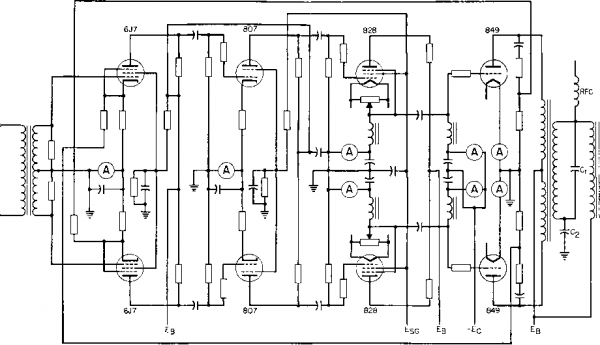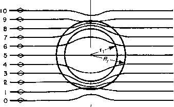Fig. 155. Hum pick-up in input transformers. plate transformers. Without shielding, such currents may interfere with operation of nearby receivers. Likewise, voltages to ground on telephone lines are kept from interfering with normal voice frequency voltages between lines. The extent of static shielding depends upon the amount of discrimination required. Usually a single, thin, grounded strip of metal between windings is sufficient, with ends insulated to prevent a short circuit. Magnetic flux in the interwinding space causes eddy currents to flow in such shields, and even shields with insulated ends indicate a partial short circuit on test. This effect reduces the OCL of the transformer. If volts per layer are small compared to total winding voltage, a layer of wire is an effective shield. INVERTED HYBRID (□) NO RESPONSE IN R4 FROM Eq. response IN RgSRs (C) RESPONSE IN RgaR, BUT NOT IN RFROM £3 3 Ез У R, 2 3 ЕЗ (b) RESPONSE IN R I, Rg.a R4 - FROM E3 (d) EQUIVALENT CIRCUIT, т R4 REPRESENTS SECONDARY LOAD Fig. 156. Hybrid coil operation. The start turn is grounded and the finish left free, or vice versa. A wire shield has none of the short-circuit effect of a wide strip shield. Usually a transformer that requires static shielding has a low-voltage winding; the shield can be placed close to this winding, needs little additional insulation, and occupies but a small fraction of the total coil space. If shields are placed between high-voltage windings, as in modulation transformers, the shields must be insulated from each winding with thick insulation. This materially increases the coil mean turn length, transformer size, and difficulty in obtaining good high-frequency response. Shields have questionable value in such transformers and usually are omitted. 84. Hybrid Coils. Hybrid coils are used to isolate an unwanted signal from certain parts of a circuit, and allow the signal to be used in other parts of the circuit. In the hybrid coil shown in Fig. 156(a) the lower windings or primary sections are balanced with res ect to each other, and the two resistors R2 and R3 are equal. Voltage Eq applied between the primary center tap and ground causes equal currents to flow in opposite directions through the two halves of the primary winding, and therefore produces zero voltage in the secondary winding. By this means, signal Eq arrives at resistors R2 and R3 undiminished, but there is no voltage in R4, connected across the secondary coil. Figure 156(b) shows what happens in this circuit if the voltage is applied across R3 instead of across Ri. In this case, the voltage E appears across resistors Ri, R2, and R, that is, in all parts of the circuit. An inverted hybrid coil is shown in Fig. 156(c). Here voltage Eg is applied across the upper coil, which is now the primary. The secondary sections are assumed to be balanced. Therefore, there is zero voltage between the center point of the secondary winding and ground, and though a signal appears at R2 or R there is no signal across Ri. Thus a hybrid coil works in both directions. It has been assumed that R2 and R3 are equal and that the two primary half-windings are of equal number of turns. This is not necessarily true, for, if the resistance of R2 is twice that of Rs, the number of turns connected to R2 should be twice those connected to Rs. However, it is important that, through the range of frequency in which the hybrid coil is desired to function, the balance between the two halves be maintained closely. The most exact balance is achieved for R2 = Rs by winding the two halves simultaneously with two different wires. This method gives good isolation of the undesired signal. Other methods introduce some ratio error which reduces the isolation. For the same reason, it is necessary to balance the circuit with regard to capacitance and leakage inductance. That is, if a capacitance exists across Rs, such as line capacitance for example, an additional equivalent amount should be added across R2 in order to achieve the balance desired. Likewise, any inductive apparatus, adding either series or parallel inductance in one circuit, should be compensated for by inductance of like character in the other circuit. Adding series inductance, for example, in series with Rs will not compensate for shunt inductance across R2, or vice versa, as the two have opposite effects with regard to frequency and therefore balance is attained only at one frequency. Assume a perfect transformer having no exciting current and no leakage inductance between the two halves, and a transformer with equal turns in the two halves of the primary winding. Assume currents in the directions shown in Fig. 156(d). Then Jl = /2 + /3 (88) Ег = I2R2 + hRi (89) Es = hRi + E2 (90) On the assumption of equal turns in the two half-windings, Ei - E2. If the magnetizing current is assumed to be zero, the ampere-turns and hence the volt-amperes in the two primary halves are equal. The secondary load can be considered as reflected into the primary winding as resistor h = {E, -h E2)/Ri (91) (/3 - h)E2 = (/2 + h)Ei (92) If equations 88 to 92 are combined, an expression for Z3 can be found: E + 4ЙА + ад Z3 = - = -- (9d) 7з 4Й1 + 4Й2 + й4 If the secondary circuit is open, = 00, and equation 93 becomes 3 = 41 -h R2 (94) 85. Amplifier Tests. Tests for hum, distortion, linearity, and frequency response can be made with meters in the output circuit when voltage of a known frequency and wave form is applied to the input. Hum and distortion are conveniently measured by instruments specially made for the purpose. Linearity is measured by varying the input voltage and measuring corresponding output voltage. Frequency response is measured at a fixed input or output voltage, but frequency is varied. Normal production testing of amplifiers requires no more than such overall tests. But, in the development of the amplifier, excessive hum, distortion, or other defects may be indicated, and tests must be a