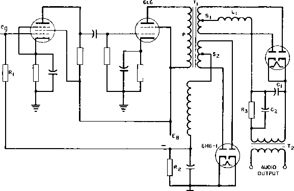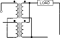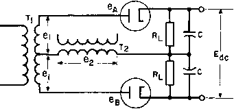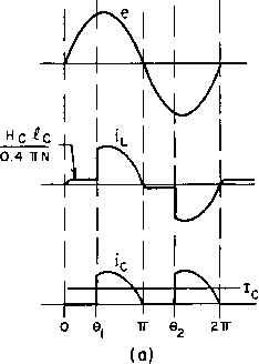 Главная » Журналы » Transformer elementary form 1 ... 23 24 25 26 27 28 29 ... 38 which slides over exposed turns of the winding. Brush resistance prevents excessive transition current and permits smooth voltage control; yet it offers little additional series resistance to the load. The same idea can be applied to two-winding transformers for secondary voltage adjustment. A typical unit of this kind is shown in Fig. 196. When autotransformers are used on three-phase supply lines, they may be connected the same as two-winding transformers in star, delta, open-delta, or Scott connections. The last two connections are less subject to objectionably high regulation in autotransformers and, if they supply three-phase anode transformers, cause no serious primary voltage unbalance for voltage ratio p close to unity. 106. Static Voltage Regulators. Automatic regulators of various kinds have been devised for keeping comparatively small amounts of power at a constant voltage. Figure 197 shows one circuit for a res- ![]() A-c SUPPLY LINE VOLTAGE OUTPUT VOLTAGE Fig. 197. Resonant-circuit voltage regulator. onant-reactor voltage regulator. Inductance Li is linear. Inductance L2 and capacitor C2 are parallel-resonant at the supply line frequency and rated voltage. The pair draws very little current, so that the reactive voltage in Li is low. Output current flows through its secondary winding which is of such polarity as to maintain rated voltage. Inductance La is partially saturated at this voltage. If line voltage falls below rated value, less current is drawn by L2, and the L2C2 combination becomes untuned. Total current to the parallel circuit is then capacitive, and this capacitive current, drawn through Li, raises the output voltage. Conversely, if line voltage rises above rated value, the L2C2 combination becomes untuned on the inductive side, and the output voltage falls below the line value. Output voltage variations of =bl per cent are obtained with =ь10 per cent line voltage variations in this manner, and with load changes from zero to full load. Constant supply frequency is a condition for resonance at rated voltage; with the good frequency control of modern power systems this condition is generally fulfilled. Load power factor variations cause output voltage to change. Some regulators are provided with taps to minimize this effect. Output wave form contains a noticeable third harmonic, because the large magnetizing current of L2 must flow through appreciable impedance in Li. Owing to the partial saturation of reactor L2, it tends to operate at a high temperature and requires good ventilation. Practical regulators are in use with ratings from 25 v-a to several kva. UNREGULATED D. C. SUPPLY SERIES R -WW ANODE VOLTAGE V-R REGULATED TUBE D. C. OUTPUT 0 5 10 15 20 25 ANODE MILLIAMPERES Fig. 198. Voltage regulator characteristic. Electronic voltage regulators make use of a gas-filled regulator tube, which has a v-a characteristic such as that shown in Fig. 198. Current drawn by this tube changes between wide limits with virtually no change in voltage. A series resistor is ordinarily used to limit the current. When output current in excess of the V-R tube rating is desired, it may be used as a voltage reference for a current amplifier. Some voltage regulators amplify the difference between a voltage reference and the output voltage of a rectifier or generator. This difference is called the error voltage. The amplifier output reduces the generator field if generator output voltage is high and increases the field if the output voltage is low. Likewise, motor speed may be regulated by the difference between tachometer output and a voltage reference. Or the angular position of a motor may be controlled elec-tricall as desired b remote means. These means are discussed in books on servomechanisms. If a thyratron amplifier is used as part of a servo system, one thyratron may produce an effect opposite to that of the other, such as reversing current in the load. This amplifies the power controlled by error voltage. In many modern regulator and servo systems, magnetic amplifiers are used. These devices are described in Chapter 9. 107. Demodulators. Demodulators or detectors measure phase or amplitude variations which are used to convey intelligence or control ![]() ![]() e, Br Fig. 199. Phase-difference demodulator, another device. A circuit often used for phase detection is shown in Fig. 199. Transformer Ti has a balanced secondary with Ci volts per side. In frequency or phase demodulators, the circuit is called a discriminator, and uses air-core transformers. This circuit is used in phase demodulation to produce a d-c voltage proportional to phase shift. In this case 62 leads ei by 90° for zero output. This condition is shown in the upper vector diagram. If e should lead the upper ei by less than 90°, would increase and Св decrease, causing a net d-c voltage to appear across the output. If 62 should lead the lower Ci by less than 90° the d-c output voltage would change polarity. The plate voltage of one diode is the vector sum of ei and e, and is 90° out of phase with the plate voltage of the other diode {which is the vector difference of e and 62). If the phase angle ф between Ci and 62 changes either positively or negatively, output voltage Ea is very nearly proportional to ф, up to ф = ±60°. For positive phase shift, the output Eac is negative; for negative phase shift, Eac is positive. For good linearity, load resistances Rl should be large compared to the diode resistances. Modifications of this circuit made to eliminate the vector difference 1 See Principles of Servomechanisms, by G. S. Brown and D. P. Campbell, John Wiley & Sons, New York, 1948. voltage or to reduce the degree of amplitude modulation are known as balanced and ratio detectors. As used in servo control, the demodulator produces d-c output which changes polarity when one voltage reverses with respect to th