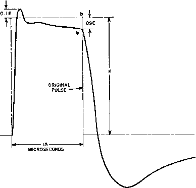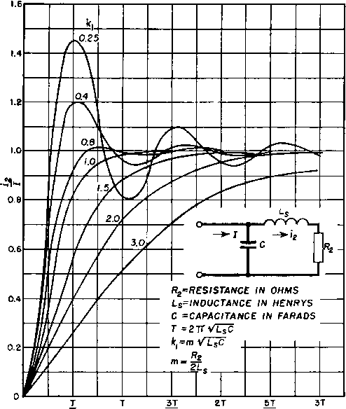 Главная » Журналы » Transformer elementary form 1 ... 28 29 30 31 32 33 34 ... 38 Vl,/Cd > 2Ri (132) Terms are defined in Fig. 235. The quantity у/Ь^Св regarded as the open-circuit imped- ance of the transformer. Its value must be more than twice the load resistance (on a 1; 1 ratio basis) to prevent oscillations after the trailing edge. This requires low distributed capacitance. Likewise the negative backswing may prove objectionable in certain apparatus. Certain conditions for aiiding ail backswing are those represented in Fig. 235 by /с = 5 and A = 0; these require good core material, low exciting current, low distributed capacitance, and a loaded transformer. 127. Total Response. By means of the curves луе can now construct the pulse shape delivered to load R. Suppose that a transformer with the following properties is required to deliver a flat top pulse of 15 microseconds duration. Primary leakage inductance (secondary short-circuited) = 1.89 X 10~ henry Primary open-circuit inductance =0.1 henry Primary/secondary turns ratio Vp/.Vg = 1:3 Source resistance R\ = 800 ohms Load resistance (primary equivalent) R2 = 5,000 ohms Primary effective capacitance C2 = 448 fijii From the expressions given in Fig. 230 m = 2.34 X 10 7 = 1.8 microseconds ki = 0.68 tion to the transformer, as will be explained later. For linear resistive loads, the terms are interchangeable with l and of Fig. 233, and with C2 of Fig. 229, all referred to the primary winding. In transformers with oscillatory constants the backswing becomes positive again on the first oscillation. In some applications this would appear as a false and undesirable indication of another pulse. The conditions for no oscillations arc all included in the real values of the equivalent circuit angular frequency, i.e., by the inequality 4:RiCr) LeCf) The front of the wave follows a curve betAveen those marked ki = 0.4 and /ci = 0.8 in Fig. 230. Value Ea is reached in 0.57 or 0.85 microsecond, and an overshoot of about 10 per cent occurs in 1.2 microseconds. The top of the wave slopes down to a voltage determined by the product rRx/Le = 0.12, and by a curve between those for Я-, - x and i?2 = 21 in Fig. 234. Voltage E at Ъ is evidently 0.9£/ . The trailing edge is found from Fig. 235. Here T = 42.2 X 10-* Vo. 1/448 X 10-2 2 X 5,000 = 1.5 5,800 800 X 0.09 = 0.65 Load voltage reaches zero in 0.05T or 2.11 microseconds. The negative loop has maximum amplitude of 33 per cent at 0.27 or 8.44 microseconds beyond the pulse edge 6. The pulse deliired to load i?2 is shown in Fig. 236, in terms of E instead of Ea. ![]() Fig. 236. Output voltage of pulse transformer. So far we have assumed that the pulse source is disconnected at the end of the pulse. In some applications the source remains connected. This would result if switch S (Fig. 233) were left closed, and battery E were short-circuited. Under these conditions the leakage inductance remains in the circuit, and an additional transient occurs. The transient has a shape similar to one of the curves of Fig. 231 but is inverted and superposed on the backswing voltage due to OCL. In the example just given, this superposed oscillation has an amplitude of 10 per cent of E, with a total result similar to the oscillogram of Fig. 237. Superposed backswing oscillations are discussed more fully in Section 134. Because of the distributed nature of leakage inductance and ![]() Fig. 237. Oscillogram of voltage pulse. capacitance, higher-frequency superposed oscillations may sometimes occur even when the load is disconnected at the end of a pulse. By their very nature, the conditions for these oscillations are difficult to state with certainty, but if oscillations occur on the front edge they are likely to appear on the trailing edge, superposed on the voltage back-swing. 128. Step-Down Transformers. The circuits of Figs. 229 and 233 for step-up pulse transformers arc essentially the same as those of Figs. 107(e) and 107(c), respectively, for audio transformers. Low-frequency response corresponds to the top of tiie pulse and high-frequency response to the front edge. In stcp-doлvn pulse transformers the top is unchanged, but the front edge corresponds to Fig. 113. Step-down transformer analysis shows that the form of equation is similar to that for step-up transformers, except that the damping factor for the sine term is greater by the quantity R2/L. Also, the decrement, although still composed of two terms, has the resistances R- and J?2 in these two terms reversed with respect to the corresponding terms for the step-up transformer. Except for this, the front-edge curves are little different in shape from those of step-up transformers. AVhere = ita the cunes are virtually the same as in Fig. 231. Pentode amplifiers, with their constant-current characteristics, can be represented by the circuit of Fig. 238. Here / is the current entering the primary winding from the tube, and is constant over most of the voltage range. The transformer is usually step-down for the reasons of impedance mentioned in Section 70 (Chapter 5). Front-edge response of the.se transformers is the same as in Fig. 230 if the rise in load current is expressed as a fraction of final current I, and the decrement is changed to R2/2Ls. It is reproduced in Fig. 239 with this change in constants. Flatness of top is approximately that of the curve R2 = 0.1i?i in Fig. 234. Trailing edge is the same as in Fig. 235. Fig. 238. Step-down transformer equivalent circuit. It is evident that many practical cases are represented by the figures. If transformer constants are outside the curve values, the pertinent equation should be plotted to obtain the response. 129. Frequency Response and Wave Shape. Because of the prevalent thinking of engineers in terms of frequency response rather than wave shape, it is sometimes necessary to correlate the two concepts. The matter of phase shift enters, for the reason that the relative phase of t