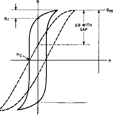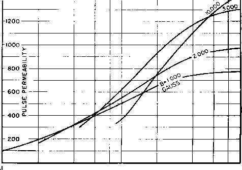 MAGNETIZING FORCE H Fig. 240. Pulso В-П loops. For a typical loop such as obcd, the slope of the loop (and hence the permeability) rises gradually to the end of the pulse Ъ which corresponds to point b in Fig. 236. Since magnetizing current starts decreasing at this point, H also starts decreasing. Cvirrent in the windings does not decay to zero immediately but persists because of winding capacitance, and sufficient time elapses for permeability to increase. Therefore, flux density В may also increase during a short interval after point h. The trailing edge of the pulse voltage soon reaches zero, and this corresponds to point с on the loop. At some interval later, the maximum backswing amplitude is reached, which corresponds to point d on the loop. At this point the slope or permeability is several times as great as at point b. For any number of pulses of varying amplitudes but of the same width, there are corresponding loops having respective amplitudes c. A curve drawn through point b of each loop is called the normal permeability curve, and this is ordinarily given as the permeability curve for the material. The permeability ix for a short pulse width is less than the 60-cycle or d-c permeability for the same material. Values of pulse permeability for 2-mil grain-oriented steel are given in Fig. 24L The permeability values include the irreducible small gap which exists in type С cores; the cores on which the measurements were made had a ratio of gap to core length Ig/lc 0.0003, but the data are not criti- Г1400 ![]() .4 .6 ,8 ю г pulse width in microseconds e 10 Fig. 241. Effective permeability versus pulse width. cally dependent on this ratio. The effect of penetration time is clear. Flux densities attained in pulse transformers may be low for small units where very little source power is available, or they may be high (several thousand gauss) in high power units. This is true whether the pulse width is a few microseconds or 1,000 microseconds. The nickel-iron alloys in general have lower saturation densities, but higher permeabilities below saturation than either grain-oriented or ordinary silicon steel. Depending on the flux density chosen, the increase of permeability with the use of a nickel-iron alloy may vary from zero to 300 per cent. This increase holds also for long-time pulses, during which permeability may approach the 60-cycle value. In order to overcome the net d-c pulse magnetization which is in the same direction throughout each pulse, an air gap may be inserted in the core to prevent it from returning only to the residual magnetism value Br at the end of each pulse, and thereby limiting its useful pulse flux density range ДЛ to the difference between maximum flux density Bn and residual Br (see Fig. 242). This gap increases the effective length of the magnetic path and reduces OCL from the value it has лvith symmetrical magnetization. The reduction is less with core materials of low permeability. To maintain the advantage of high permeability in nickel-iron alloys, the core is reset. This is done by ДВ WITHOUT GAP OR RESETTING ![]() ДВ WITH RESETTING Fig. 242. Flux density range in pulse transformer cores. arranging the circuit so that, during the period of backswing, sufficient negative current flows through the windings to overcome coercive force He and drop the flux density to the negative value of residual magnetism. Then nearly twice the previous maximum flux density (ДБ in Fig. 242) is available for the pulse. Where resetting is possible, it is advantageous to use nickel-iron alloys; where resetting is not racticable, grain-oriented silicon steel is preferable. 131. Windings and Insulation. Pulse transformers generally have single-layer concentric windings with solid insulation between sections. For high load impedance, a single section each for primary and secondary as in Fig. 166 is favorable, as the effective capacitance is lowest. For low load impedance, more interleaving is used to reduce leakage inductance. To reduce capacitance to a minimum, pie-section со- axial windings may be used. In these, coil capacitance is kept low by the use of universal windings, and intersection capacitance between windings is low because the dielectric is air. Such coils are more difficult to wind, require more space, and therefore are used only when necessary. Coil sections can be wound with the same polarity as in Fig. 166 (p. 219) or with one winding reversed. Effective capacitance between F and S is given below for three turns ratios. Capacitance is. based on 100 fifii measurable capacitance. Turns Ratio Effective Capacitance Referred to Primary N\/N% Same Polarity Reversed Polarity 1:5 533 1200 1:1 0 133 5:1 21 48 From this it can be seen that the polarity exemplified in Fig. 166 is preferable for reducing effective capacitance, but that the percentage difference is greatest for turns ratios near unity and less as the ratio increases. Attention to the insulation so far has centered around capacitance. The insulation also must withstand the voltage stress to which it is subjected. It can be graded to reduce the space required. Low-frequency practice is adequate for both insulation thickness and end-turn clearances. Small size is achieved by the use of solventless varnish. Small size with consequent low capacitance and low loss results in higher practicable impedance values and shorter pulses. In order to utilize space as much as possible, or to reduce space for a given rating, core-type construction is often used. Low capacitance between high-voltage coils is possible in such designs. It is advantageous in reducing space to split the secondary winding into nonsymmetrical sections. Although the leakage inductance is higher with non-symmetrical windings, there is less distributed capacitance when the high-voltage winding has the smaller length. Lower capacitance obtains with two coils than with a shell-type transformer of the same interleaving. In core-ty