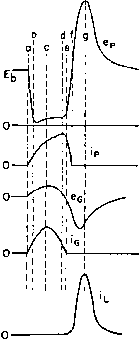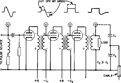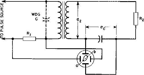 ![]() oscillator tube Fig. 250. Blocking oscillator. pulse amplifler, or it may be used to modulate a VHF oscillator. A typical blocking oscillator circuit is shown in Fig. 250. The grid is dri\en hard, and grid current usually is comparable in magnitude to anode current. Grid and anode winding turns are approximately equal. The oscillator operates as follows. If the grid is only slightly negative, the tube draws plate current and because of the large number of grid turns the transformer drives the grid positive, increases the plate current, and starts a regenerative ![]() INSTANT a-PULSE STARTS. ANODE CURRENT RISES. INSTANT b-SUDDEN RISE IN ANODE CURRENT INDUCES ANODE WINDING VOLTAGE PEAK, PROBABLY AT SATURATION VALUE. INSTANT с-DUE TO COUPLING К < I, GRID VOLTAGE PEAKS LATER. GRID CURRENT PEAKS SIMULTANEOUSLY. INSTANT d-ANODE CURRENT MAXIMUM ANODE VOLTAGE STARTS TO FALL INSTANT e-GRlD VOLTAGE AND CURRENT ZERO INSTANT f-ANODE VOLTAGE AND CURRENT ZERO. INSTANT g-VOLTAGE BACKSWING REACHES PEAK. CAUSES PEAK LOAD CURRENT i. Fig. 251. Blocking oscillator voltages and niirents. reflected from the grid, and the charge accumulated on the bias capacitor becomes great enough to decrease plate current rapidly in a degenerative action. Plate current soon cuts off, and then the plate voltage overshoots to a high positive value and the grid voltage to a high negative value. Grid voltage decays slowly because of the discharge of the bias capacitor into the grid leak. The next pulse occurs when the negative grid voltage decreases sufficiently so that regenerative action starts again. Hence the repetition rate depends on the grid bias R and С Either the negative or the positiAe pulse voltamay be utilized. Instantaneous voltages and currents are shown in Fig. 251 for a load which operates only on the positive pulse. The geniMal shapes of these currents and voltages approximate those in a practical oscillator, except for superposed ripples and oscillations whicli often occur. The negative pulse has a much squarer wave shape than the positive action. During this period, the grid draws current, charging the bias capacitor to a voltage depending on the grid current flowing into the bias resistor-capacitor circuit. The negative plate voltage swing is determined by grid saturation, so that large positive swings of grid voltage result in virtually constant plate voltage. This continues for a length of time determined by the constants of the transformer, after which the regenerative action is reversed. Because of lowered plate voltage swing, the plate circuit can no longer dri e the low impedance pulse, and consequently it is used where good wave shape is required. No matter how hard the grid is driven, plate resistance cannot be lowered below a certain value; so a limit to the negative amplitude is formed. There is no such limit to the positive pulse, and this characteristic may be used for a voltage multiplier. If the transformer has low OCL, the leakage inductance may be high enough to perform like an air-core transformer. That is, there are optimum values of coupling for maximum power transfer, grid drive, and negative pulse shape, but they are not critical. Comparison of peak voltages in Fig. 251 shows that the usual 180° phase relationship between grid and plate swings do not hold for such a blocking oscillator, if the term phase has any meaning in this case. The front-edge slope of the negative pulse is determined by leakage inductance and capacitance as in Fig. 230, with two exceptions: the pulse is negative and the load is non-linear; hence there are no oscillations on the inverted top. The slope of this portion can be computed from Fig. 234, provided tube and load resistances are accurately known. The positive pulse can be found from Fig. 235 if these curves are inverted. Pulse width, shape, and amplitude also are affected by the ratio of grid turns to plate turns in the transformer. Voltage rise is steeper as this ratio is greater, with the qualification that grid capacitance increases as the square of the grid turns; the ratio is seldom greater than unity. The exact ratio for close control depends on tube data which may not be available and must be determined experimentally. The situation parallels that of the class С low-Q oscillators mentioned in Chapter 6. The circuit of Fig. 250 is called a free-running blocking oscillator. When it is desired to synchronize or otherwise control the pulse repetition rate, an external trigger pulse is applied to the blocking oscillator grid or cathode. 137. Line-Type Radar Pulsers. Figure 252 is the schematic diagram of a line-type pulser or modulator. This pulser is of the variety known as d-c resonant charging, with hold-off diode. The operation of the pulser is as follows: During the charging period of each cycle, the diode permits direct current to flow through the charging reactor to the pulse-forming network and through the primary of the pulse transformer to ground. The rate of charging is governed largely by the inductance of the charging reactor and pulse-forming network capacitance. The inductances in the pulse-forming network and the leakage inductance 1 ... 30 31 32 33 34 35 36 ... 38 |
