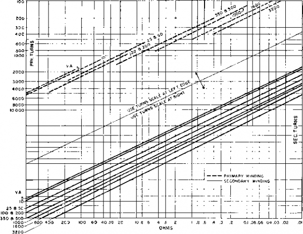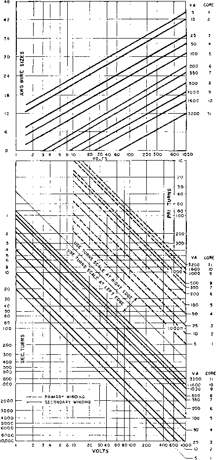 (/) Equal PR losses in primary and secondary. (g) Solventless resin impregnated coils. [h) Open-type assemblies like those of Fig. 15. (г) Grain-oriented silicon-steel cores. It was found that 40°C rise in the four smallest sizes resulted in excessive voltage regulation. For example, a small filament transformer would deliver correct filament voltage at room ambient temperature of 25 °C, but at 105°С this voltage dropped to less than the published tube limit. Hence the winding regulation in the two smallest transformers was limited to 15 per cent, and in the next two larger sizes to 10 per cent. In still larger sizes, the 40°C temperature limit held the regulation to less than 10 per cent. In using the chart, ratings rarely fall exactly on the v-a values assigned to each core. Hence a core is generally chosen with somewhat greater than required rating. Lower regulation and temperature rise than maximum then result. Wire size in quadrant I also increases in discrete sizes, and if the chart indication falls between two sizes the smaller size should be used. Instructions for Using Fig. 63. 1. Choose a core from Table VIII which has a v-a rating equal to or greater than that required. 2. From rated primary and secondary voltages, find number of turns for both windings in quadrant IV. 3. From rated primary and secondary currents, find wire size for both windings in quadrant 1. 4. Project turns across to quadrant III to obtain winding resistances. Table VIII. Transformer Size, Rating, and Regulation
