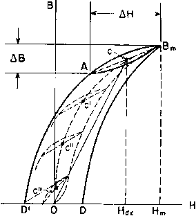 30 20 108 6 4 3 г I .8 .6 4 3 AMPERES O.t .06 .04 .03 .02 .01 Ш OHMS 1000 600 400 гоо юо бо 4o зо го ю 6 4 з г i .8 .6 .4 .з г aio8.06.04.03 .ой .oi ![]() Fig. 63. Low-voltage 60-cycle transformer design chart. ![]() Ж Fig. 63. (Continued) Departures from the assumed conditions preclude direct application of Fig. 63, but the chart is still useful as a starting point in design. For some common modifications, the following notes apply: 1. For each additional secondary winding reduce core maximum rated volt-amperes by 10 per cent. Choose wire size from quadrant II. 2. For 50-cycle transformers, reduce core maximum rated v-a 10 per cent. 3. When permissible temperature rise is higher than 40°C, core maximum volt-amperes equal (v-a in table) X Vemperature rise/40°C. Example. A transformer is required for 115/390 volts, 60 cycles, to deliver 77 volt-amperes. This rating falls between the maxima for cores 4 and 5. Using core 5 at 115 volts, we read, from Fig, 63, for the primary, 440 turns of No. 22 wire and 3 ohms d-c resistance; for the secondary, 1,700 turns of No. 27 wire and 40 ohms d-c resistance. 37. Reactors. Reactors are used in electronic power equipment to smooth out ripple voltage in d-c supplies, so they carry direct current in the coils. It is common practice to build such reactors with air gaps in the core to prevent d-c saturation. The air gap, size of the core, and number of turns depend upon three interrelated factors: inductance desired; direct current in the winding; and a-c \olts across the winding. The number of turns, the direct current, and the air gap determine the d-c flux density, whereas the number of turns, the volts, and the core size determine the a-c flux density. If the sum of these two flux densities exceeds saturation value, noise, low inductance, and non-linearity result. Therefore a reactor must be designed with knowledge of all three of the conditions above. Magnetic flux through the coil has two component lengths of path: the air gap Ig, and the length of the core Ic. The core length Ic is much greater geometrically than the air gap Ig, as indicated in Fig. 57, but the two components do not add directly because their permeabilities are different. In the air gap, the permeability is unity, whereas in the core its value depends on the degree of saturation of the iron. The effective length of the magnetic path is Ig(Ic/fJ-), where p. is the permeability for the steady or d-c component of flux. Reactor design is, to a large extent, the proportioning of values of air gap and magnetic path length divided by permeability. If the air gap is relatively large, the reactor inductance is not much affected by changes in ju,; it is then called a linear reactor. If the air gap is small, changes in fi due to current or voltage variations cause inductance to vary; then the reactor is non-linear. When direct current flows in an iron-core reactor, a fixed magnetizing force Hdc is maintained in the core. This is shown in Fig. 64 as the vertical line Hdc to the right of zero Я in a typical a-c hysteresis loop, the upper half DBD of which corresponds to that in Fig. 21. Increment ДЯ of a-c magnetization, superposed on Hdcj causes flux density increment Д5, with permeability equal to the slope of dotted line ABrn. B is twice the peak a-c induction Вас- It will be recalled from Fig. 19 that the normal induction curve OBm. is the locus of the end points of a series of successively smaller major hysteresis loops. Since the top of the minor loop always follows the left side of a maj or loop, as Hdc is reduced in successive steps the upper ends of corresponding minor loops terminate on the normal induction curve. Dotted-hne slopes of a series of minor loops are shown in Fig. 64, ![]() Fig. 64. Incremental permeability with different amounts of d-c magnetization. the midpoints of which are (7, C, C , and C . Increment of induction дБ is the same for each minor loop. It will be seen that the width of the loop AH is smaller, and hence }xa is greater, as Hdc is made smaller. Midpoints C, C, etc., form the locus of d-c induction. The slope of straight line ОС is the d-c permeability for core magnetization Hdc- It is much greater than the slope of AB. Hence incremental permeability is much smaller than d-c permeability. This is true in varying degree for all the minor loops. The smaller AB is, the less the slope of a minor loop becomes, and consequently the smaller the value of incremental permeability /хд. The curve in Fig. 65 marked д is the normal permeability of 4% siHcon steel for steady values of flux, in other words, for the d-c flux in the core. It is 4 to 20 times as great as the incremental permeability /ла for a small alternating flux superposed upon the d-c flux. The ratio of ix to /ид gradually increases as d-c flux density incr ases. Because of the low value of jua for minute alternating voltages, the effective length of magnetic path Ig + (Ic/pa) is considerably greater for alternating than for steady flux. But the inductance varies inversely as the length of a-c flux path. If, therefore, the incremental permeability is small enough to make 1с/}ла large compared to Ig, it follows that small 12,000 10,000 8,000 6,000 4,000 2,000