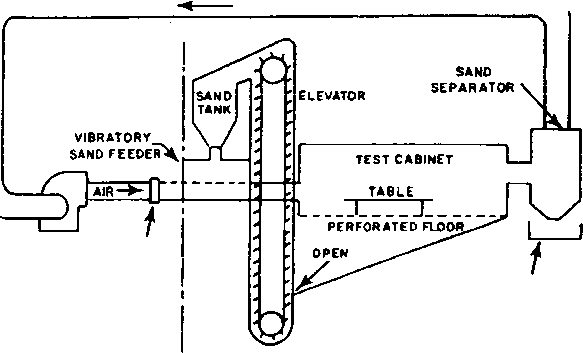 Главная » Журналы » Preparation instrucnons requirements 1 ... 13 14 15 16 17 18 19 ... 43 MIL-STD-SlOE U JULY 1989 RETURN AIR ![]() VARIABLE TEMP. SPEED CONDiTiONiNG FAN COIL SAND COLLECTOR NOTE= THE LAYOUT OF THIS SYSTEM IS NOT DRAWN TO SCALE; IT IS INTENDED TO ILLUSTRATE THE ARRANGEMENT OF THE COMPONENTS.THE SPEC! FICATIONS OF ALL COMPONENTS ARE NOT PROVIDED IN THIS TEST DESCRIPTION. THEY MUST BE CALCULATED BY THE ORGANIZATION SUPPLYING THE COMPONENTS. INDUSTRIAL VENTILATION. A MANUAL OF RECOMMENDED PRACTICE WILL PROVIDE DATA AND GUIDANCE FOR DESIGNING THE REQUIRED EQUIPMENT FIGURE 510. 3-2. Blowing sand test facility (horizontal flow) №ПЮО 510.3 5l0.3-ii c. Dehvnidif ication, heatins, шпа coo I ing of ehasber test voluas air for CHsntFol ef test conditions sliall be achieved by aaethods that do not alter the chemical composition of the aiir, aand, or water vapor within the chanber test volume air. d. Test facility design considerations. (1) The vibratory or Screw type sarid feeder shall be controlled tc emit the sand at the specified concentrations. The feeder shall be located in such a manner as to 1пвш^ that the sand is uniformly in suspension in the air stream when it strikes the test item, to sinulate the sane effects as in the field. NOTE: Uniform sand distribution is usxially easier to obtain when the sand-air mixture is directed domward, as in figure 510-3-1. (2) Becatee of the extremely abrasive characteristics of blowing sand at high velocity, it is not reconnended that the sand be recirculated through the fan or air conditioning equlpnent. Instead, it should be separated from the air downstream from the test chanber in a sand separator, collected in a separate receiver, and reintroduced into the sand tank or hopper. Тпл fan should recirculate only the Bwid-iree conditioning air. NOriE: The sand collected in the separator may be reused for other tests if, after analysis, it still conforms to the requirements of I-3.2d(2) of this method. II-l.2 Controls a. Test parfgrgt-ffrgi uiiess otherwise specified in the requirements docunent, tenperature and relative hunidity measin!>ements made during testing shall be continuous if measurements are in analog form, or at intervals of one every 15 minutes or less if measurements are in digital form. Al 1 instrisnentation used with the test chanber shall be capable of meeting the accuracies, tolerances, etc., of General Requirements, 5.1.1 and 5.1.2. Any slgnlfleant change cf the test item tenperature or chanber conditicr.s shall result in the t-est it m being reestablished at the required environmental conditions before continxjation. b. Relative hWtdtW Relative huaiidity in the test section shall be less than 30 percent throughout the condix;t of the test. c. Test variables. The test variables (tenperature, air velocity, and dust ccncentratioa) shall be omtinuouely monitored during the test. Hunidity shall be verified Just before or during each test. II-1.3 Test interruption. (See Gteneral Requlremente. 5.2.4). a. Undertestnterruption. The abrasion, penetration, and collection of dust are cumulative effects that are not affected by interruption. The test item shall be reestablished at the prescribed tenperature and the test continued from the point of interruption. b. Overtest interruption. Any interrvption that results in more extreme exposure of the test item than required by the equipraent specif ications should be followed by a conplete physical examination and operational check (where possible) before continuation of testing. If a problem is encountered, the test should be reinitiated with a new test item. II-2 PREPARATION FOR TEST 11-2.1 Preliminary steps. Before starting any test: a. Determine from the test plan which test procedure is required. c. Operate the test chanjber without the test item to make sure it is working properly. II-2.2 Pretest standard anfcient checkout. All test items require a pretest checkout at standard ambient conditions to provide baseline data. Conduct the pretest checkout as follows: Step 1. Position the test item in the test chanber as near the center of the test sections as practicable. The test item shal 1 have a mininun clearance of IS cm (6 inches) from any wall of the test chanber and from any other test item (if more than one item is being tested). Orient the test item so as to expose the most critical or vulnerable parts to the sand or dust Stream. NOTE: The orientation of the test item may be changed during the test if required by the test plan. Step 2. Prepare the test item in its operational configuration in accordance with General Requirements, 5.2.2. Step 3. Stabilize the test item at standard anbient conditions (Qeneral Reqvu.remente, S.la). Step 4. Condxxrt a conplete visual examination of the test item with special attention to sealed areas and minute openings. IfEraOD 510.3 Step 5. DociJssnt the z>es\ilts. Step 6. Conduct an operational checkout in accordance wath the approved test plan. Step 7. Becord results for conpliance with General Beqiiirements 5.2.1. Step a. !f the t-est it-era operates satisfactorily, proceed to step 1 of the test procedure. If not, resolve the problem and restart at step I of pretest checkout. II-3 PPOCSPUBES i 1-3.1 ?i4>cedure I. - BiowinK dust. The 1о11о п.пв test ргосеаш^ provides the basis for collecting the necessary information concerning the test item in a dust-laden environment. Step 1. With the test item in the chanber. adjxjst the test section tenperature to 23°C (73°F) and the relative hunidity to less than 30%. (Maintain less than 30% relative hunidity throughout the test.) Step 2. Adjust the air velocity to the required value, determined from the test plan. Step 3. Adjust the dust feed control for a dust concentration of 10.6 +7 g/nf (0.3 + 0.2 g/ft). Step 4. Ibintain the conditions of вЬтрв 1 ttai 3 for at least six hows. Step 5. Stop the dust feed, reduce the test section air velocity to that req
