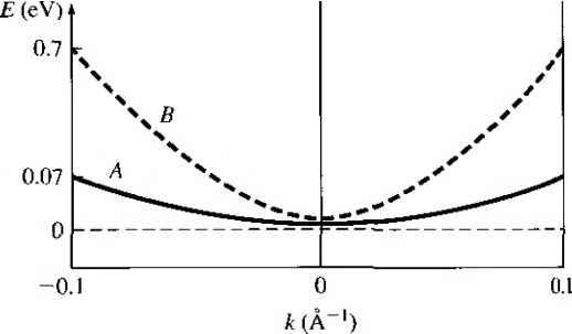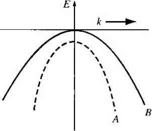 Главная » Журналы » Absorbing materialorganic polymer 1 ... 8 9 10 11 12 13 14 ... 55 Problems 3.9 Using the parameters in Problem 3.5 and letting a = 5 A, determine the width (in eV) of the allowed energy bands that exist for {a)0 < ka < тт, (Ь)л: < ka < 2jr, (c) In <ka < Зтг, and {d) Зл < ka < Ал, 3.10 Repeat Problem 3.8 using the parameters in Problem 3.6. 3.11 Repeat Problem 3.9 using the parameters in Problem 3.6. 3.12 The bandgap energy in a semiconductor is usually a sUght function of temperature. In some cases, the bandgap energy versus temperature can be modeled by E, = £,(0)---- where Eg (0) is the value of the bandgap energy at Г = 0 K. For silicon, the parameter values are £(0) = 1.170 eV, = 4.73 x 10 eV/K and p = 636 K. Plot E, versus rover the range 0 < 7 < 600 K. In particular, note the value at Г = 300 К. Section 3.2 Electrical Conduction in Solids 3.13 Two possible conduction bands are shown in the E versus к diagram given in Figure 3.34. State which band will result in the heavier electron effective mass; state why. 3.14 Two possible valence bands are shown in the E versus к diagram given in Figure 3.35. State which band will result in the heavier hole effective mass; state why, 3.15 The E versus к diagram for a particular allowed energy band is shown in Figure 3.36. Determine (a) the sign of the effective mass and (/?) the direction of velocity for a particle at each of the four positions shown. ЗЛ6 Figure 3.37 shows the parabolic E versus к relationship in the conduction band for an electron in two particular semiconductor materials. Determine the effective mass (in units of the free electron mass) of the two electrons. 3.17 Figure 3.38 shows the parabolic E versus к relationship in the valence band for a hole in two particular semiconductor materials. Determine the effective mass (in units of the free electron mass) of the two holes. 3.18 The forbidden energy band of GaAs is 1.42 eV. (a) Determine the minimum frequency of an incident photon that can interact with a valence electron and elevate the electron to the conduction band, {b) What is the corresponding wavelength? 3.19 The E versus к diagrams for a free electron (curve A) and for an electron in a semiconductor (curve B) are shown in Figure 3.39. Sketch (a) dE/dk versus к and ![]() ![]() В ![]() Figure 3.34 I Conduction bands for Problem 3.13. Figure 3.35 I Valence bands for Problem 3.14. CHAPTERS Introductiontothe Quantum Theory of Solids