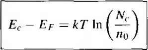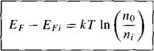 Главная » Журналы » Absorbing materialorganic polymer 1 ... 12 13 14 15 16 17 18 ... 55 ![]() 4 6 Position of Fermi Energy LeveJ which yields Ki L39 X 10-* cm Comment If the temperature remains less than 7 = 550 K, then the intrinsic carrier concentration will contribute less than 5 percent of the total electron concentration for this donor impurity concentration. Equations (4.60) and (4.62) are used to calculate the majority carrier electron concentration in an n-type semiconductor and majority carrier hole concentration in a p4ype semiconductor, respectively. The minority carrier hole concentration in an n-type semiconductor could, theoretically, be calculated from Equation (4.62). How- ever, we would be subtracting two numbers on the order of 10 cmfor example, to obtain a number on the order of 10 cm , which from a pracrical point of view is not possible. The minority carrier concentrations are calculated from nopQ the majority carrier concentration has been determined. fit once TEST YOUR UNDERSTANDING E4.11 Consider a compensated GaAs semiconductor at T 300 К doped at - 5 X iO cm and N = 2 x 10 cm \ Calculate the thermal equilibrium electron and hole concentrations. r-Ol 91T = i \- 9i01 1 = suy) Е4Л2 Silicon is doped atN= 10 cm and Л^ = 0. {a) Plot the concentration of electrons versus temperature over the range 300 T < 600 K. (b) Calculate the temperature at which the electron concentration is equal to LI x 10 cm~ \ iZl SUV) I POSITION OF FERMI ENERGY LEVEL We discussed qualitatively in Section 4.3.1 how the electron and hole concentrarions change as the Fermi energy level moves through the bandgap energy. Then, in Section 4.5, we calculated the electron and hole concentrations as a function of donor and acceptor impurity concentrations. We can now determine the position of the Fermi energy level as a function of the doping concentrations and as a function of temperature. The relevance of the Fermi energy level will be further discussed after the mathematical derivations. 4.6Д Mathematical Derivation The position of the Fermi energy level within the bandgap can be determined by using the equations already developed for the thermal-equilibrium electron and hole concentrations. If we assume the Boltzmann approximation to be valid, then from Equation (4.П) we have o - /V,. exp [-(Ec - Ef)/kT].We can solve for Ec - Ef from this equation and obtain ![]() where no is given by Equation (4.60). If we consider an n-type semiconductor ii which Nd ni, then no N,[y so that E, = kT .n (I) (4.64) The distance between the bottom of the conduction band and the Fermi enersv is a logarithmic function of the donor concentration. As the donor concentration increases, the Fermi level moves closer to the conduction band. Conversely, if the Fermi level moves closer to the conduction band, then the electron concentrarion in the conduction band is increasing. We may note that if we have a compensated semiconductor, then the term in Equation (4.64) is siinply replaced by Nj - Na, or the net effective donor concentration. DESIGN EXAMPLE 4.13 ![]() Objective To deteimine the required donor impurity concentration to obtain a specified Fermi energy. Silicon at 7 = 300 К contains an acceptor impurity concentration of Л^, = 10 cm \ Determine the concentration of donor impurity atoms that must be added so that the silicon is n type and the Fermi energy is 0.20 eV below the conduction band edge. Solution From Equation (4.64), we have E, - Er = kT In \n,-nJ which can be rewritten as Nd - N = N.. exp Then Nd -N, =2.8 X 10 exp ~-0.20 0.0259 = 1.24 X 10 cm- Nd = 1.24 X 10 -ЬЫ= 2.24 x 10 cm 16 -3 Comment A compensated semiconductor can be fabricated to provide a .specific Fermi energy level. 4.6 Position of Fermi Energy Level We may develop a slightly different expression for the position of the Fermi level. We had from Equation (4.39) that = п[ ехр1(£г - Efi)/kT]. We can solve for Ef - Efi as (4.65) ![]() Equation (4.65) can be used specifically for an n-type semiconductor, where o is given by Equation (4.60), to find the difference between the Fermi level and the intrinsic Fermi level as a function of the donor concentration. We may note that, if the net effective donor concentration is zero, that is, - = 0, then no ni and Ef = Efi. A completely compensated semiconductor has the characteristics of an intrinsic material in terms of carrier concentration and Fermi level position. We can derive the same types of equations for a p-type semiconductor. From Equation (4.19), we have po =- N, exp {-(Ef - Е^,)/кТ] so that Ef - £r - kT In (4.66) If we assume that Л^ then Equation (4.66) can be written as Ef - Ег, - кТ In ![]() (4.67) The distance between the Fermi level and the top of the valence-band energy for a p-type semiconductor is a logarithmic function of the acceptor concentration: as the acceptor concentration increases, the Fermi level moves closer to the valence band. Equation (4.67) still assumes that the Boltzmann approximation is valid. Again, if we have a compensated p-type semiconductor, then the Na term in Equation (4.67) is replaced by Na - Nti. or the net effective acceptor concentrarion. We can also derive an expression for the relationship between the Fermi level and the intrinsic Fermi level in terms of the hole concentrarion. We have from Equation (4.40) that Po ni exp [-(Ef - En)/kT], which yields (4.68) ![]() Equation (4.68) can be used to find the difference between the intrinsic Fermi level and the Fermi energy in terms of the acceptor concentration. The hole concentration Po in Equation (4.68) is given by Equation (4.62). We may again note from Equation (4.65) that, for an n-type semiconductor, 0 > rt/ and Ef > Efi. The Fermi level for an n-type semiconductor is above Efi. For a p-type semiconductor, po > <itid from Equation (4.68) we see that - £ Figure 4.17 I Position of Fermi level for an (a) n-type {N > and (b) p-type {N > NJ semiconductor Efi > Ef. The F