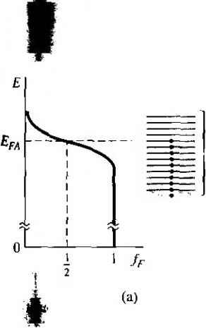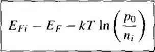 ![]() Figure 4.191 Position of Fermi level as a function of temperature for various doping concentrations. (From Sze (13j.) Fermi-level position no longer apply. At the low temperature where freeze-out occurs, the Fermi level goes above Ej for the n-type material and below E for the p-type material. At absolute zero degrees, all energy states below Ef are full and all, energy states above Ef are empty. j 4.6.3 Relevance of the Fermi Energy We have been calculating the position of the Fermi energy level as a function of doping concentrations and temperature. This analysis may seem somewhat arbitrary and fictitious. However, these relations do become significant later in our discussion of pn junctions and the other semiconductor devices we consider. An iinportant point is that, in thermal equilibrium, the Feriui energy level is a constant throughout a system. We will not prove this statement, but we can intuitively see its validity by considering the following example. Suppose we have a particular material. A, whose electrons are distributed in the energy states of an allowed band as shown in Figure 4.20a. Most of the energy states below EfA contain electrons and most of the energy states above Ef are empty ofj electrons. Consider another material, B, whose electrons are distributed in the enq ergy states of an allowed band as shown in Figure 4.20b. The energy states below EfB are mostly full and the energy states above Effi are mosriy empty. If these Х^/щ materials are brought into intimate contact, the electrons in the entire system will tend to seek the lowest possible energy. Electrons from material A will flow into the lower energy states of material B, as indicated in Figure 4.20c, until thermal equilibrium is reached. Thennal equilibrium occurs when the distribution of electrons, Щ ![]() Allowed - energy states 4.7 Summary ![]() A По wed energy states fa = ;---E Figure 4.20 i The Fermi energy of (a) material A in thermal equilibrium, (b) material В in thermal equilibrium, (c) materials A and В at the instant they are placed in contact, and (d) materials A and В in contact at thermal equilibrium. a function of energy, is the same in the two materials. This equilibrium state occurs when the Fermi energy is the same in the two materials as shown in Figure 4.20d. The Fermi energy, important in the physics of the semiconductor also provides a good pictorial representation of the characteristics of the semiconductor materials and devices. 4.7 I SUMMARY The concentration of electrons in the conduction band is the integral over the conduction band energy of the product of the density of states function in the conduction band and the Fermi-Dirac probability function. The concentration of holes in the valence band is the integral over the valence band energy of the product of the density of states function in the valence band and the probability of a state being empty, which is[l - ff{E)\. Ш Using the MaxweJt-Boltzmann approximation, the thermal equilibrium concentration of electrons in the conduction band is given by По N,. exp -JE, - Ef) kT where iV is the effective density of states in the conduction band. 7671 Using the Maxwell-Boltzmann approximation, the thermal equilibrium concentration of holes in the valence band is given by po Nl, exp where Nj, is the effective density of states in the valence band. The intrinsic carrier concentration is found from ; = N /V,; exp The concept of doping the semiconductor with donor (group V elements) impurities and acceptor (group III elements) impurities to form n-type and p-type extrinsic semiconductors was discussed. The fundamental relationship of = 7 was derived. Using the concepts of complete ionization and charge neutrality, equations for the electron and hole concentratiotis as a function of impurity doping concentrations wei derived. The position of the Fermi energy level as a function of impurity doping concentrati( was derived. The relevance of the Fermi energy was discussed. The Fermi energy is a constant throughout a semiconductor that is in thermal equilibrium. GLOSSARY OF IMPORTANT TERMS acceptor atoms Impurity atoms added to a semiconductor to create a p-type material. charge carrier The electron and/or hole that moves inside the semiconductor and gives rise to electrical currents. compensated semiconductor A semiconductor that contains both donors and acceptors ij the same semiconductor region. complete ionization The condition when all donor atoms are positively charged by givij up their donor electrons and all acceptor atoms are negatively charged by accepting electrc degenerate semiconductor A semiconductor whose eleclron concentration or hole com tration is greater than the effective density of states, so that the Fermi level is in ihe con< tion band (n type) or in the valence band (p type). donor atoms Impurity atoms added to a semiconductor to create an n-type material. effective density of states The parameter , which results from integrating the densit quantum states gdE) times the Fermi function fy(E) over the conduction-band energy, the parameter /V , which results from integrating the density of quantum states gdE) lit [1 - friE)] over the valence-band energy. extrinsic semiconductor A semiconductor in which controlled amounts of donors anc acceptors have been added so that the electron and hole concentrations change from the ij trinsic carrier concentration and a preponderance of either electrons (n type) or holes (p t) is created. freeze-out The condition that occurs in a semiconductor when the temperature is low( and the donors and acceptors become neutrally charged. The electron and hole concenut become very small. Review Questions 147 mtrinsic carrier concentration tii The electron concentration in the conduction band and the hole concentration in the valence band (equal values) in an intrinsic semiconductor. intrinsic Fermi level Epi The position of the Fermi level in an intrinsic semiconductor. intrinsic s