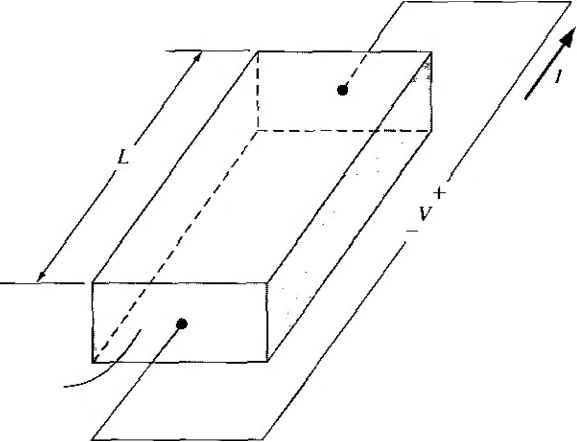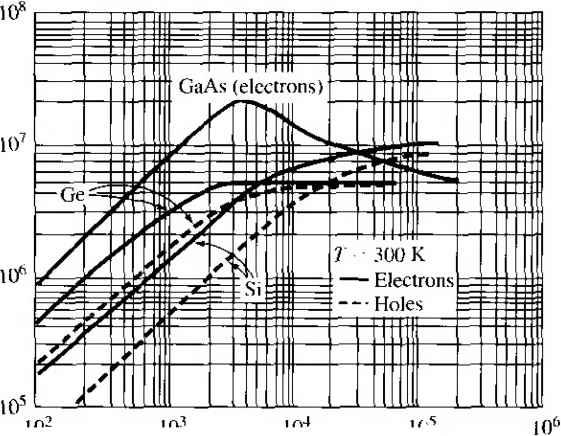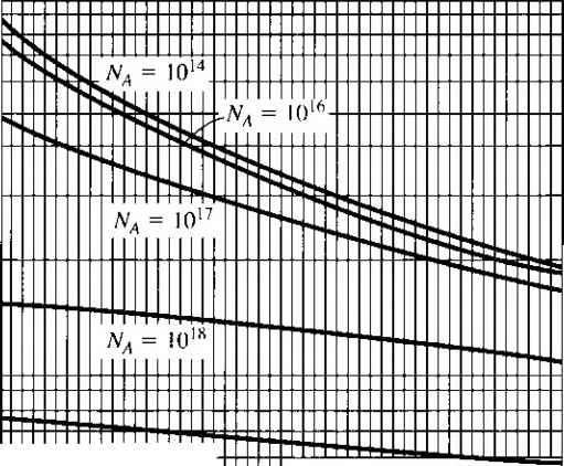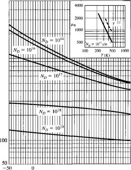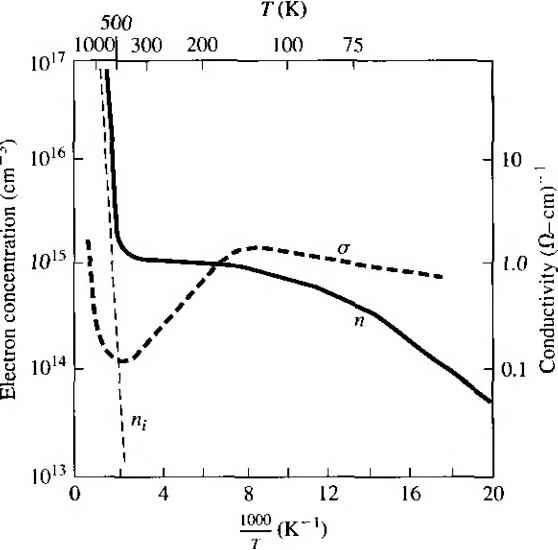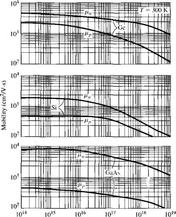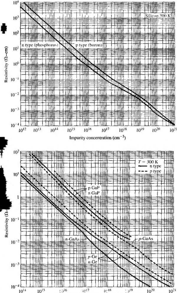 ПК) 200 500 lono о 50 100 Figure 5.2 flrrirtin and {ЬНпок- mnliliiiL-s in silicon versus temperature for various doping concentrations. Inserts show lempcraUirc lI h > I JIJ11 к > Ч t I i I ML I ![]() ![]() Impurity concentration (СТП -) Figure 5.3 I Electron and hole mobilities versus impurity concentrations for germanium, silicon, and gallium arsenide at Г = 300 К. (FromSzefllJ.) TEST YOUR UNDERSTANDING E5.3 (a) Using Figure 5.2, find the electron mobility for (i) N,{ = W cmKT = 15(ГС and 00 = I0 cm\ T = OC. (h) Find the hole mobilities for (/) N, = 104m-\ T = 50 C; and ( ) N, = 10 cm-\ T = \50C. [s-A/jUiDOoZ- 0.0 -A/uio 08£- 0) (q) -A/oool- (./) -душо oo£ 0) 0) *иу] E5.4 Using Figure 5.3, determine the electron and hole mobihties in (a) silicon for Af = 10 cm--\ Л^ = 0; (b) silicon for Nj = 10 cm-\ N, = 5 x 10 cm ; (c) silicon for Ni = cm- Л^, = 10 cm -\ and (d) GaAs for Nj = N = 10 cm-\ [-Л/шэ qzz rl Qogp ri (/?) ioie )08 P) ooe тУ w (я) mv = Ъя£\ (?) -suvj If Ti is the mean time between collisions due to lattice scattering, then clt/zt is the probability of a lattice scattering event occurring in a differential time dt. Likewise, if г/ is the mean time between collisions due to ionized impurity scattering, then dt/ti is the probabiUty of an ionized impurity scattering event occurring in ifi. differential time Л If these two scattering processes are independent, then the tot;i probability of a scattering event occurring in the differential time dt\s the sum of tfi individual events, or dt dt dt - = - + - T Г/ Tl where r is the mean time between any scattering event. Comparing Equation (5.17) with the definitions of mobility given by Equa tion (5.13) or (5.14), we can write (5. IS where д/ is the mobility due to the ionized impurity scattering process and fii isth mobility due to the lattice scattering process. The parameter is the net mobilit} With two or more independent scattering mechanisms, the inverse mobilides adu which means that the net mobility decreases. 5.1.3 Conductivity The drift current density, given by Equation (5.9), may be written as Jdrf = (ДнП + Mp/?)E = aE (5.1V where a is the conductivity of the semiconductor material. The conducrivity is give: in units of (Q-cm)~ and is a function of the electron and hole concentrations and mo bilities. We have just seen that the mobilities are functions of impurity concentration conductivity, then is a somewhat complicated function of impurity concentration. The reciprocal of conductivity is resistivity, which is denoted by p and is give in units of ohm-cm. We can write the formula for resistivity as a е{р.пП + PpP) (5.2i Figure 5.4 is a plot of resistivity as a function of impurity concentration in silicor germanium, gallium arsenide, and gallium phosphide at Г = 300 К. Obviously, th curves are not linear functions of Nj or /V because of mobility effects. If we have a bar of semiconductor material as shown in Figure 5.5 with a vo age applied that produces a current /, then we can write (5.21a (5.21bj ![]() 1016 ,017 loK lo Impurity concentration (cm~-) Figure 5.4 I Resistivity versus impurity concentration at 7 = 300 К in (a) silicon and (b) gennanium, gallium arsenide, and gallium phosphide. (From Szellll) ![]() Area л Figure 5.5 I Bar of semiconductor material as a resistor We can now rewrite Equation (5.19) as ![]() (52: Equation (5.22b) is Ohms law for a semiconductor. The resistance is a function of resistivity, or conductivity, as well as the geometry of the semiconductor If we consider, for example, a p-type semiconductor with an acceptor doping [Nj - 0) in which Na ft/, and if we assume that the electron and hole mobilities are of the same order of magnitude, then the conductivity becomes If we also assume complete ionization, then Equation (5.23) becomes (5.23): (5.24) The conductivity and resistivity of an extrinsic semiconductor are a function pri-luarily of the majority carrier parameters. We may plot the carrier concentration and conductivity of a semiconductor as a funcrion of temperature for a particular doping concentration. Figure 5.6 shows the electron concentration and conductivity of silicon as a function of inverse temperature for the case when Ni = Ю^* cm\ In the midtemperature range, or extrinsic range, as shown, we have complete ionization-the electron concentration remains essentially constant. However, the mobility is a function of temperature so the conductivity ![]() Figure 5.6 I Electron concentration and conductivity versus inverse temperature for silicon. (After Szefll].) varies with temperature in this range. At higher temperatures, the intrinsic carrier concentration increases and begins to dominate the electron concentration as well as the conductivity. In the lower temperature range, freeze-out begins to occur; the electron concentration and conductivity decrease with decreasing temperature. Objectivl EXAMPLE 5.2 To determine the doping concentration and majority carrier mobility given the type and conductivity of a compensated semiconductor. Consider compensated n-type silicon at Г = 300 К, with a conductivity of rr 16(-cm)~ and an acceptor doping concentration of 10 cm~-. Determine the donor с centration and the electron mobility. con- Solution For n-type silicon at 7 = 300 K, we can assume complete ionization; therefore the conductivity, assuming - N. > , is given by We have that 16 = (1.6 X 10-) ,(AV - 10) Since mobility is a function of the ionized impurity concentration, we can use Figure 5.3 along with trial and error to detennine Pn and A. For example, if we choose Ni =2 x 10, then Nj = + =3x10 so that fi 510 cm/V-s which gives a = 8.16 (Q-cm)-If we choose N,i = 5 к J0\ then Nf = 6 x 10 so that ju 325 cmVV-s, which gii fT = 20.8 (-cm)~V The doping is bounded between these two values. Further trial and yields 3.5 X 10 cm- which gives д„ 400cmVV-s (716 (-cm) Comment We can see from this example that, in high-conductivity semico