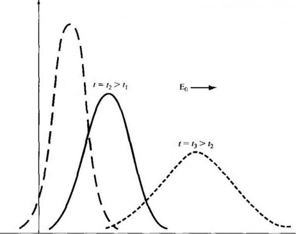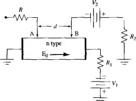 Главная » Журналы » Absorbing materialorganic polymer 1 ... 19 20 21 22 23 24 25 ... 55 dp(x, t) jc = 0 ![]() Distance, X Figure 6.9 i Excess-hole concentration versus distance at various times for a constant applied electric held. with the excess electrons so that at f = oo the excess hole concentration is zero. In this particular example, both diffusion and recombination processes are occurring at the same time. Figure 6.9 shows a plot of Equation (6.70) as a function of distance x at various times for the case when the applied electric field is not zero. In this case, the pulse of excess minority carrier holes is drifting in the -\-x direction, which is the direction of the electric field. We still have the same diffusion and recombination processes as we had before. An important point to consider is that, with charge neutrality, Su - SpuX any instant of time and at any point in space. The excess-electron concentration is equal to the excess-hole concentration. In this case, then, the excess-electron pulse is moving in the same direction as the applied electric field even though the electrons have a negative charge. In the ambipolar transport process, the excess carriers are characterized by the minority carrier parameters. In this example, the excess carriers behave according to the minority carrier hole parameters, which include Dp, p, and TpQ. The excess majority carrier electrons are being pulled along by the excess minority carrier holes. TEST YOUR UNDERSTANDING E6.7 As a good approximation, the peak value of a normalized excess carrier concentration, given by Equafion (6.70), occurs aix = ppEot, Assume the following parameters: TpQ 5 /xs. Dp = 10 cm/s, Др = 386 cm/V-s, and Eq - 10 V/cm. Calculate the peak value at times of {o)t = 1 /xs, {h)t 5 /xs, (c) т = 15 Д8, and () r = 25 /xs. What are the corresponding values of jc for parts {a) to f £96 = *0l 0 (Я) E6.8 The excess carrier concentration, given by Equation (6 JO), is to be calculated at distances of one diffusion length away from the peak value. Using the parameters given in E6.7, calculate the values ofSp for (й) / = 1 psat U) 1.093 x 10- cm and iii)x = -3.21 X 10- cm; ib)t =5 ms at (0 x = 2.64 x 10 cm and (ii) X = 1.22 X 10~ cm; (c) r = 15 /xs at ii)x = 6.50 x 10 - cin and 07) .V = 5.08 X 10- cm. [eOT (..0 gOT (.0 P) tTI (.0 Vll (.0 {Я) -вЖ (/.0 бОг (.0 Н suvl Еб.9 Using the parameters given in E6.7, (a) plot Sp(x,f) from Equation (6.70) versus x for (i)t 1 /xs, {ii) t - 5 fis, and (Hi) t = 15 s, and {b) plot Sp{x. t) versus time for {i)x = 10 cm, iii)x 3 x 10 cm, and (Hi) .v 6 x 10 ctn. ![]() 6.3.4 Dielectric Relaxation Time Constant We have assumed in the previous analysis that a quasi-neutrality conditions exists- that is, the concentration of excess holes is balanced by an equal concentration of excess electrons. Suppose that we have a situation as shown in Figure 6.10, in which a uniform concentration of holes Sp is suddenly injected into a portion of the surface of a semiconductor. We will instantly have a concentration of excess holes and a net positive charge density that is not balanced by a concentration of excess electrons. How is charge neutrality achieved and how fast? There are three defining equations to be considered. Poissons equation is (6.71) The current equation. Ohms law, is I J =aE (6,72) The continuity equation, neglecting the effects of generation and recombination, is Эр St (6.73) holes ![]() Figure 6Л01 The injection of a concentration of holes into a small region at the surface of an n-type semwonductor. Substituting Equation (6.74) into the continuity equation, we have op dp dp (6.75) Since Equation (6.75) is a function of time only, we can write the equation as a total derivative. Equation (6.75) can be rearranged as + I-!p = o (6.76) Equauon (6.76) is a first-order differential equation whose solution is pit) p{0)e- (6.77) where Td = - (6.78) and is called the dielectric relaxation time constant EXAMPLE 6,5 Objecrive Calculate the dielectric relaxation time constant for a particular semiconductor. Assume an n-type semiconductor with a donor impurity concentration of Nj = 10 cm Solution The conductivity is found as о eii N = (1.6 X 10-)(1200)00) = 1.92 (П-ст) where the value of mobility is the approximate value found from Figure 53. The permittivity of silicon is € = = (11.7)(8.85 X 10-) F/cm The dielectric relaxation time constant is then € (11.7)(8.85x 10-) - =----= 5.39 X 10 s a 1.92 = 0.539 ps The parameter f> is the net charge density and the initial value is given by е{Ьр). We will assume that bp is uniform over a short distance at the surface. The parameter e is the permittivity of the semiconductor. Taking the divergence of Ohms law and using Poissons equation, we find V J = aV-E- (6.74) Comment Equation (6.77) then predicts that in approximately four time constants, or in approximately 2 ps, the net charge density is essentially zero; that is, quasi-neutrahty has been achieved. Since the continuity equation, Equation (6.73), does not contain any generation or recombination terms, the initial positive charge is then neutralized by pulling in electrons from the bulk n-type material to create excess elecU-ons. This process occurs very quickly compared to the normal excess carrier lifetimes of approximately 0Л /is. The condition of quasi-charge-neutral ity is then justified. *6.3.5 Haynes-Shockley Experiment We have derived the mathematics describing the behavior of excess carriers in a semiconductor. The Haynes-Shockley experiment was one of the first experiments to actually measure excess-carrier behavior. Figure 6.11 shows the basic experimental arrangement. The voltage source Vi establishes an applied electric field Eq in the -fx direction in the n-type semiconductor sample. Excess carriers are effecrively injected into the semiconductor at contact A. Contact В is a recrifying contact that is under reverse bias by the voltage source V2- 