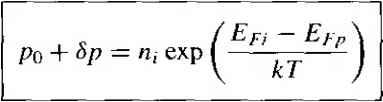 Figure 6.15 1 (a) Thermal-equilibriura energy-band diagram for = 10 cm and . (b) Quasi-Fermi levels for electrons and holes if lO cm excess hi = 10 cm carriers are present. concentration has increased significantly so that the quasi-Fermi level for holes has moved much closer to the valence band. We will consider the quasi-Fermi energy levels again when we discuss forward-biased pn junctions. TEST YOUR UNDERSTANDING E6.10 Silicon aiT - 300 К is doped at impurity concentrations of Л^ = 10 cm- and = 0. Excess carriers are generated such that the steady-state values are Sn = Sp - 5 x W cm~-\ (a) Calculate the thermal equilibrium Fermi level with respect io Efi, (b) Determine Ef and Efp with respect to Efi. lA A693*0 - - -.7 4 98K0 - - 3 (Я) -ЛЭ ШГО = -3 - 3 Н suy] E6.11 Impurity concentrations of = 10 cm and ~6 x 10 * cm are added to silicon at Г = 300 К. Excess carriers are generated in the material such that the steady-state concentrations are 6/7 = 2 x 10 * cm. (a) Find the thermal equilibrium Fermi level with respect to Ef/. (b) Calculate Ef and Efp with respect to Efi, [ЛЭ toeeo = - -3 a 09fto = - -я № A t6£-0 = - 3 W -suvl 6.5 I EXCESS-CARRIER LIFETIME The rate at which excess electrons and holes recombine is an important characteristic of the semiconductor and influences many of the device characteristics, as we will see in later chapters. We considered recombination briefly at the beginning of this chapter and argued that the recombination rate is inversely proportional to the mean carrier lifetime. We have assumed up to this point that the mean carrier liferime is simply a parameter of the semiconductor material. We have been considering an ideal semiconductor in which electronic energy states do not exist within the forbidden-energy bandgap. This ideal effect is present in a perfect single-crystal material with an ideal periodic-potential function. In a real semiconductor material, defects occur within the crystal and disrupt the perfect periodic-potential function. If the density of these defects is not too great, the defects will create discrete electronic energy states within the forbidden-energy band. These allowed energy states may be the dominant effect in determining the mean carrier lifetime. The mean carrier lifetime may be determined from the Shockley-Read-Hall theory of recombination. 6.5.1 Shockley-Read-Hall Theory of Recombination An allowed energy state, also called a trap, within the forbidden bandgap may act as a recombination center, capturing both electrons and holes with almost equal probability. This equal probability of capture means that the capture cross sections for electrons and holes are approximately equal. The Shockley-Read-Hall theory of recombinarion assumes that a single recombination center, or trap, exists at an energy Ef within the bandgap. There are four basic processes, shown in Figure 6.16, that may occur at this single trap. We will assume that the trap is an acceptor-type trap; that is, it is negatively charged when it contains an electron and is neutral when it does not contain an electron. The four basic processes are as follows: Process 1: The capture of an electron from the conduction band by an inirially neutral empty trap. Process 1 Process 2 EJeciron capture Elccrroj] emission Process 3 Process 4 Hole capture Hole emission Figure 6.161 The four basic trapping and emission processes for the case of an acceptor-type trap. 1 ... 19 20 21 22 23 24 25 ... 55 |