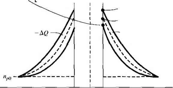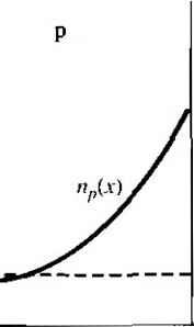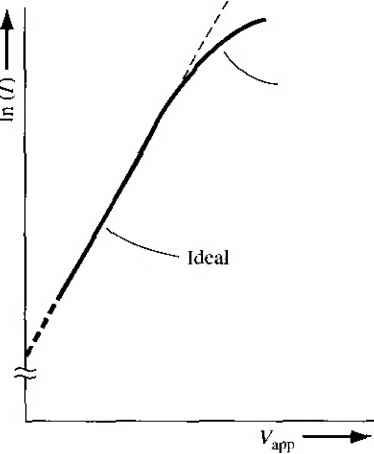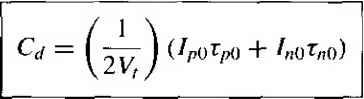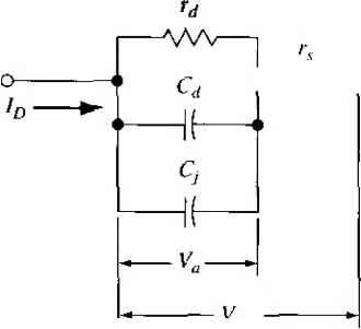 where Jp is the current density phasor. Combining Equations (8.57), (8.51), and (8.52), we have Jp -eOpi-Cp) (8.58) We can write the total ac hole current phasor as ip -- AJp eADpCpP, (8.59) where A is the cross-sectional area of the pn junction. Substituting the expression for Cp, we obtain P eADpPdc rr---- (8.60) If we define eADpP (8.61) then Equation (8.60) becomes We can go through the same type of analysis for the minority carrier electrons in the p region. We will obtain where fnO - (8.63) (8.64) The total ac current phasor is the sum of , and / . The pn junction admittance is the total ac current phasor divided by the ac voltage phasor, or / + / / 1 \ г /-- у-~- (8.65) There is not a linear, lumped, finite, passive, bilateral network that can be synthesized to give this admittance funcrion. However, we may make the following approximations. Assume that ОУТрО < 1 (8.66a) <УТ о < 1 (8.66b) These two assumptions imply that the frequency of the ac signal is not too large. Then we may write (8.67a) yj 1 -h 7 tt>r o 1 + (8.67b) Substituting Equations (8.67a) and (8.67b) into the admittance Equarion (8.65) yields (8.68) If we combine the real and imaginary portions, we get ( 70 + / o) + Jo) (8.69) Equation (8.69) may be written in the form p region ГФ) = Pm exp ![]() n region ЛДО) = p o exp - Pni) Figure 8.14 I Minority carrier concentration ctiangcs with changing forward-bias voltage. The parameter is called the diffusion conductance and is given by gd - j У'рО -г / оу - yo,i where Ioq is the dc bias current. Equation (8.71) is exactly the same conductance we obtained previously in Equation (8.34). The parameter is called the diffusU capacitance and is given by (/,0 + Аю) = (8.71) usiofu ![]() (8.72) The physics of the diffusion capacitance may be seen in Figure 8.14. The dc values of the minority carrier concentrations are shown along with the changes due to the ac component of voltage. The Д Q charge is alternately being charged and discharged through the junction as the voltage across the junction changes. The change in the stored minority carrier charge as a function of the change in voltage is the diffusion capacitance. One consequence of the approximations шго 1 and о>т^о < 1 is that there are no wiggles in the minority carrier curves. The sinusoidal frequency is low enough so that the exponential curves are maintained at all times. EXAMPLE 8.6 Objective To calculate the small-signal admittance of a pn junction diode. This example is intended to give an indication of the magnitude of the diffusion capacitance as compared with the junction capacitance considered in the last chapter. The diffusion resistance will also be calculated. Assume that Nj so that p o px> This assumpiton implies that ,(> > / o- Let T = 300 K, tq = \0~ s, and /,0 = Ioq = 1 niA. Solution The diffusion capacitance, with these assumptions, is given by 10-)(10-) = 1.93 X 10 F The diffusion resistance is V, 0.0259 V - =---- 25.9 12 Ioq 1mA Comment The value of J.93 nF for the diffusion capachance of a forward-biased pn junction is 3 to 4 orders of magnitude larger than the junction capacitance of the reverse-biased pn junction, which we calculated in Example 7.5. The diffusion capacitance tends to dominate the capacitance terms in a forward-biased pn junction. The small-signal diffusion resistance can be fairly small if the diode current is a fairly large value. As the diode current decreases, the diffusion resistance increases. We will consider the impedance of forward-biased pn junctions again when we discuss bipolar transistors. TEST YOUR UNDERSTANDING E8.8 A silicon pn junction diode at T = 300 К has the following parameters: = 8 x 10 cm--\ N,=2x 10 cm-\D = 25 cmVs, = 10 cmVs, r,o = 5x 10 s, and Xpo = \0~ s. The cross-sectional area is Л = 10 cm. Determine the diffusion resistance and diffusion capacitance if the diode is forward biased at (a) = 0.550 V and Ф) Va =0.610 V. № вЖ = о 9 11 = (Ф - ju LOZ =0*811 = *suVl E8.9 A GaAs pn junction diode at T = 300 К has the same parameters given in E8.8 except that D = 207 cm/s and Dp =9.80 cm/s. Determine the diffusion resistance and diffusion capacitance if the diode is forward biased at (й) Va = 0.970 V and (b)Va = 1.045 V. lJu OYI = Ъ 9V\ = -Ju 0t6 0 = £9Z = - () Vl 8.2.3 Equivalent Circuit The small-signal equivalent circuit of the forward-biased pn junction is derived from Equation (8.70). This circuit is shown in Figure 8.15a. We need to add the junction capacitance, which will be in parallel with the diffusion resistance and diffusion capac- itance. The last element we add, to complete the equivalent circuit, is a series resistance. The neutral n and p regions have finite resistances so the actual pn junction will include a series resistance. The complete equivalent circuit is given in Figure 8.15b. The voltage across the actual junction is Va and the total voltage applied to .the pn diode is given by Vapp The junction voltage Va is the voltage in the ideal ![]() Figure 8Л51 (a) Small-signal equivalent circuit of ideal forward-biased pn junction diode; (b) Complete small-signal equivalent circuit of pn junction. Effect of ![]() Figure 8Л61 Forward-biased /-V characteristics of a pn junction diode showing the effect of series resistance. current-voltage expression. We can write the expression (8.73) Figure 8 Л 6 is a plot of the current-voltage characteristic fronn Equation (8.73) showing the effect of the series resistance. A larger applied voltage is required to achieve the same current value when a series resistance is included. In most diodes, the series resistance will be negligible. In some semiconductor devices with pn junctions, however, the series resistance will be in a feedback loop; in these cases, the resistance is multiplied by a gain factor and becomes non-negligible. TEST YOUR UNDERSTANDING E8.10 A silicon pn junction diode at Г = 300 К has the same parameters as those described in E8.8, The neutra