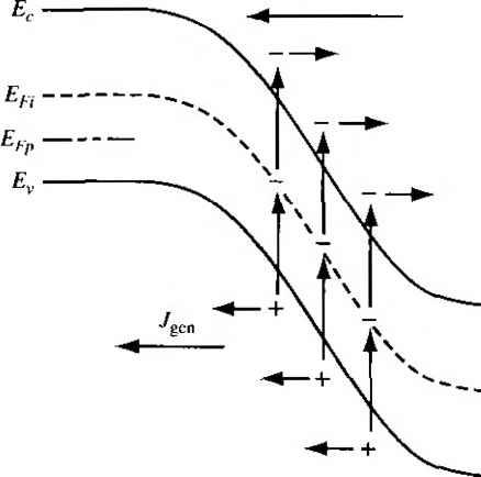 Главная » Журналы » Absorbing materialorganic polymer 1 ... 27 28 29 30 31 32 33 ... 55 Пы\--. ![]() = Pna exp ![]() Vkr\ л = 0 Figure 8.13 I The dc characteristics of a forward-biased pn junction used in the small-signal admittance calculations. Equation (8.37) may be written as where / ev](t) РпФ. 0 = Pdc expl Pdc = PnO exp (8.31 (8.3! If we assume that \vi(t)\ < (кТ/е) = VJ, then the exponential term in Equation (8.38) may be expanded into a Taylor series retaining only the linear terms, the minority carrier hole concentration at x = 0 can be written as (8> If we assume that the time-varying voltage ii(/) is a sinusoidal signal, we can] write Equation (8.40) as where V] is the phasor of the applied sinusoidal voltage. Equation (8.41) will be used as the boundary condition in the solution of the time-dependent diffusion equation for the minority carrier holes in the n region. In the neutral n region (jc > 0), the electric field is assumed to be zero, thus the behavior of the excess minority carrier holes is determined from the equation diSp ) 8pn S(8p ) (8.42) where 8pn is the excess hole concentration in the n region. We are assuming that the ac signal voltage v\(t) is sinusoidal. We then expect the steady-state solution for 5p to be of the form of a sinusoidal solution superimposed on the dc solution, or 8pAx,t)8poix) + p,ix)e (843) where 5po{x) is the dc excess carrier concentration and /?i (.v) is the magnitude of the ac component of the excess carrier concentration. The expression for Spoix) is the same as that given in Equation (8.14). Substituting Equation (8.43) into the differential Equation (8.42), we obtain S(Spo(x)) dpi(x) j dx- dx PoCv) + Pi() = j(P\{x)e (8.44) We may rewrite this equation, combining the time-dependent and time-independent terms, as a(%)(x)) SpoixY -jo)pi(x) jO)l (8.45) If the ac component, piix), is zero, then the first bracketed term is just the differential Equation (8. JO), which is identically zero. Then we have, from the second bracketed term. - j(op\(x) = 0 looting that L, = Equation (8.46) may be rewritten in the form pdx)=0 (8.46) (8.47) dp\(x) dx- CIp,(x)=Q where 2 (1 + jgjrx)) The general solution to Equation (8.48) is (8.48) (8.49) (8.50) One boundary condition is that /?] (x +oc) = 0, which implies that the coefficient K2 = 0. Then P{(x) = Kie (8.51) Applying the boundary condititm at x - 0 from Equation (8.41) we obtain pi(0) = ATi = Ale (8.52) The hole diffusion current density can be calculated at л =0. This will be giv (8.53) x = 0 If we consider a homogeneous semiconductor, the derivative of the hole concentration will be just the derivative of the excess hole concentration. Then = -cD, x = 0 x = 0 dx We can write this equation in the form = JpO -b jpU) dpi (x) (8.54) (8.55) where BjSpoix)) dx exp I - I - 1 (8.56) Equation (8.56) is the dc component of the hole diffusion current density and is exactly the same as in the ideal /-V relation derived previously. The sinusoidal component of the diffusion current density is then found from dpi(jO dx (8.57)