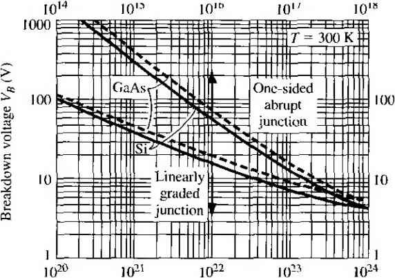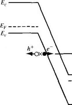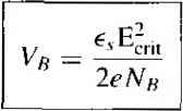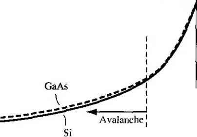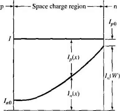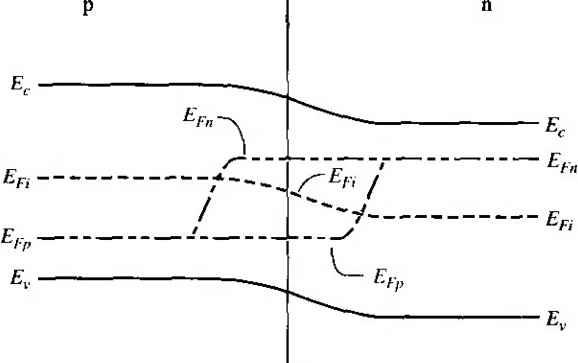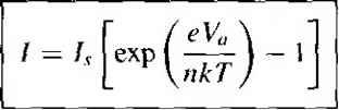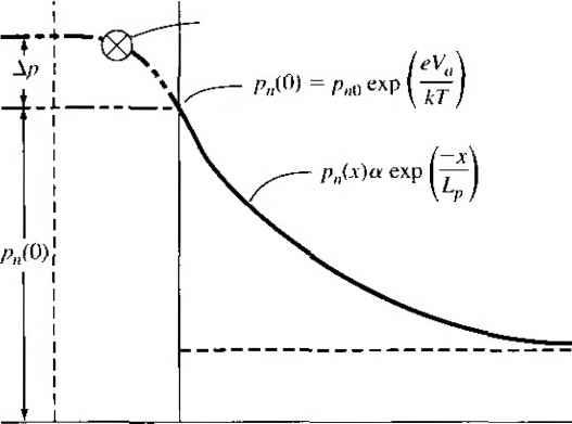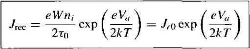 Главная » Журналы » Absorbing materialorganic polymer 1 ... 28 29 30 31 32 33 34 ... 55 TEST YOUR UNDERSTANDING Е8Л1 A GaAs pn junction diode has the same parameters as described in E8.9. (a) Calculate the reverse-bias generation current if the diode is reverse biased at K/? = 5 V. (b) Determine the ratio of /gen calculated in part (a) to the ideal reverse-saturation current /s- [i Ql X £6*1 Й) V t-Ol x eOT = H suv] 8.3,2 Forward-Bias Recombination Current For the reverse-biased pn junction, electrons and holes are essentially completel; svept out of the space charge region so that n p 0. Under forward bias, how ever, electrons and holes are injected across the space charge region, so we do, i] fact, have some excess carriers in the space charge region. The possibility exists some of these electrons and holes will recombine within the space charge region not become part of the minority carrier distribution. The recombinarion rate of electrons and holes is again given from Equ tion (8.74) as C,{n+n)-hCp(pp) Dividing both numerator and denominator by CnCpNt and using the definitions о T o and Tpo, we may write the recombination rate as \ np - nf Tpo(n -h n) + r o(/7 + p) (8.1 Figure 8.18 shows the energy-band diagram of the forward-biased pn junctic Shown in the figure are the intrinsic Fermi level and the quasi-Fermi levels foj ![]() Figure 8Л81 Energy-band diagram of a forward-biased pn junction including quasi-Fermi levels. electrons and holes. From the results of Chapter 6, we may write the electron concentration as n = exp Fn (8.84) and the hole concentration as p - Hi exp Efi - E (8.85) where Efu and Efp are the quasi-Fermi levels for electrons and holes, respectively. From Figure 8.18, we may note that {EFn - Ef,) -h (Efi - Efp) = eV (8.86) where is the applied forward-bias voltage. Again, if we assume that the trap level is at the intrinsic Fermi level, then n = p = n Figure 8.19 shows a plot of the relative magnitude of the recombination rate as a function of distance through the space charge region. This plot was generated using Equations (8.83), (8.84), (8.85), and (8.86). A very sharp peak occurs at the metallurgical junction (x = 0). At the center of the space charge region, we have Efi - (8.87) Relative A Tecombination rate ![]() -6 -5 -4 -3-2 -10 1 2 3 4 5 6 Relative distance ttiroijgh space charge region Figure 8.19 I Relative magnitude of the recombination rate through the space charge region of a forward-biased pn junction. Equations (8.84) and (8.85) then become n - fij exp 2k T ![]() (8.89) If we assume that n - p = and that т„о - = tq, then Equation (8.83) becomes fU [ехр(еК, :П-1] (8.90) 2to [exp(V /2r)+ 1] which is the maximum recombination rate for electrons and holes that occurs at tl center of the forward-biased pn junction. If we assume that V, кТ/е, we maj neglect the (-1) term in the numerator and the (+1) term in the denomii Equation (8.90) then becomes 2го \2кТ The recombination current density may be calculated from Лес I eR Jo (8.92) where again the integral is over the entire space charge region. In this case, however, the recombination rate is not a constant through the space charge region. We have calculated the maximum recombination rate at the center of the space charge region, so we may write i/fec - X (8.93) where л' is a length over which the maximum recombination rate is effective. However, since to may not be a well-defined or known parameter, it is customary to write (8.94 ![]() where W is the space charge width. TEST YOUR UNDERSTANDING Е8Л2 Consider a silicon pn junction diode at Г = 300 К with the same parameters given in E8.8. The diode is forward biased at l/ = 0.50 V. (й) Calculate the forward-biased recombination current, (h) Detennine the ratio of /ret.- calculated in part (a) to the ideal diffusion current. [-01 x ]ZL () у 01 x qVZ = 7 () Vl Recom bination ![]() Figure 8.20 I Because of recombination, additional holes from the p region must be injected into the space charge region to cstabHsh the minority carrier hole concentration in the n region. 8.3.3 Total Forward-Bias Current The total forward-bias current density in the pn junction is the sum of the recombination and the ideal diffusion current densities. Figure 8.20 shows a plot of the minority carrier hole concentrarion in the neutral n region. This distribution yields the ideal hole diffusion current density and is a function of the minority carrier hole diffusion length and the applied junction voltage. The distribution is established as a result of holes being injected across the space charge region. If, now, some of the injected holes in the space charge region are lost due to recombination, then additional holes must be injected from the p region to make up for this loss. The flow of these additional injected carriers, per unit time, results in the recombination current. This added component is schematically shown in the figure. The total forward-bias current density is the sum of the recombination and the ideal diffusion current densities, so we can write J - Лес + where У^с is given by Equation (8.94) and Jo is given by (8.95) (8.96) The (-1) term in Equation (8.23) has been neglected. The parameter J, is the ideal reverse saturation current density, and from previous discussion, the value of Ло from the recombination current is larger than the value of Jj, In ( го) Г Total current ![]() Reeombinaiion current, J (slope = ) Ideal diffusion current, (siope - 1) Figure 8.21 I Ideal diffusion, recombination, and total current in a forward-biased pn junction. If we take the natural log of Equations (8.94) and (8.96), we obtain In Угес - In (8.97a; In Jo - In + = In Л + (8.97b Figure 8.21 .shows the recombination and diffusion current components plotted on a log current scale as a function of V/ V. The slopes of the two curves are not the same. Also shown in the figure is the total current density-the sum of the two 