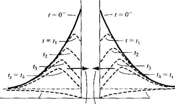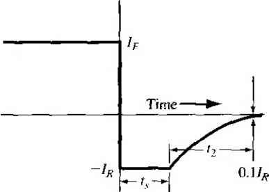 Главная » Журналы » Absorbing materialorganic polymer 1 ... 29 30 31 32 33 34 35 ... 55 ![]() Figure 8.26 1 Simple circuit for switching a diode from forward to reverse bias. reverse-bias direction. If we assume, for the moment, that the vohage across diode junction is small compared with Vk, then the reverse-bias current is limited approximately (8.113] The junction capacitances do not allow the junction vohage to change instantaneously. If the current Ir were larger than this value, there would be a forward-bias voltage across the junction, which would violate our assumption of a reverse-bias current. If the current Ir were smaller than this value, there would be a reverse-bias voltage across the junction, which means that the junction voltage would have changed instantaneously. Since the reverse current is limited to the value given by Equation (8.113), the reverse-bias density gradient is constant; thus, the minority carrier concentrations at the space charge edge decrease with time as shown in Figure 8.27b. This reverse current Ir will be approximately constant for 0+ <t < , where is called the storage time. The storage time is the length of time required for the minority carrier concentrations at the space charge edge to reach the thermal-equilibrium values. After this time, the voltage across the junction will begin to change. The current characteristic is shown in Figure 8.28. The reverse current is the flow of the stored minority carrier charge, which is the difference between the minority carrier concentrations ait - 0~ and r - oo, as was shown in Figure 8.27b. The storage time t can be determined by solving the time-dependent continuity equarion. If we consider a one-sided p+n junction, the storage time is determined 8 ш 5 Charge Storage and Diode Transients Пр(х' =0) rtpQ exp Forward bias diffusion of eiectrons ![]() Forward bias diffusion of hoJes ![]() 0 JC- 0 (a) ![]() t Reverse bias \ diffusion electrons Reverse bias diffusion of holes Figure 8.27 1 (a) Steady-state forward-bias minority carrier concentrations; (b) minority carrier concentrations at various limes during switching. ![]() Figure 8.28 I Current characteristic versus time during diode switching. from the equation T/;o If h (8.1h where erf (л') is known as the error function. An approximate solution for the stoi time can be obtained as The recovery phase for / > is the time required for the junction to reach its steady-state reverse-bias condition. The remainder of the excess charge is hei removed and the space charge width is increasing to the reverse-bias value. 1.,. decay time Ь is determined from exp i-t2/Tpo) = 1+0.1 (8.116) The total turn-off time is the sum of and Гт- To switch the diode quickly, we need to be able to produce a large reverse cui-rent as well as have a small minority carrier lifetime. In the design of diode circuits, then, the designer must provide a path for the transient re verse-bias current pulse in order to be able to switch the diode quickly. These same effects will be considered when we discuss the switching of bipolar transistors. TEST YOUR UNDERSTAMDiNG Е8Л5 A one-sided pn silicon diode, that has a forward-bias current of . = 1.75 mA, is switched to reverse bias with an effective reverse-bias voltage of = 2 V and an effective series resistance of Rh =4 k. The minority carrier hole lifetime is 10~ s. (a) Determine the storage time f,. {b) Calculate the decay time . (c) What is the tum-off time of the diode? [s 01 X 3 (J) *s oi X gr I iq) *s . oi x 9170 0) suyl 8.5Д The Turn-on Transient The turn-on transient occurs when the diode is switched from its off*- state into the] forward-bias on state. The turn-on can be accomplished by applying a forward-bias current pulse. The first stage of turn-on occurs very quickly and is the length of rime required to narrow the space charge width from the reverse-bias value to its thermal-equilibrium value when Va = 0. During this time, ionized donors and ceptors are neutralized as the space charge width narrows. The second stage of the turn-on process is the time required to establish the minority-carrier distributions. During this time the voltage across the junction is increasing toward its steady-state value. A small turn-on time is achieved if the ininor- ity carrier lifetime is small and if the forward-bias current is small. 8 - 6 The Tunnel Diode 8.6 I THE TUNNEL DIODE The tunuel diode is a pn junction in which both the n and p regions are degenerately doped. As we discuss the operation of this device, we will find a region that exhibits a negative differential resistance. The tunnel diode was used in oscillator circuits in the past, but other types of solid-state devices are now used as high-frequency oscillators; thus, the tunnel diode is really only of academic interest. Nevertheless, this device does demonstrate the phenomenon of tunneling we discussed in Chapter 2. Recall the degenerately doped semiconductors we discussed in Chapter 4: the Fermi level is in the conduction band of a degenerately doped n-type material and in the valence band of a degenerately doped p-type material. Then, even at 7 = 0 K, electrons will exist in the conduction band of the n-type material, and holes (empty states) will exist in the p-type material. Figure 8.29 shows the energy-band diagram of a pn junction in thermal equilibrium for the case when both the n and p regions are degenerately doped. The deplefion region width decreases as the doping increases and may be on the order of approximately 100 A for the case shown in Figure 8.29. The potential barrier at the juncrion can be approximated by a triangular potenrial barrier, as is shown in Figure 8.30. This potential barrier is similar to the potential barrier used in Chapter 2 to illustrate the tunneling phenomenon. The barrier width is small and the electric field in the space charge region is quite large; thus, a finite probability exists that an electron may tunnel through 