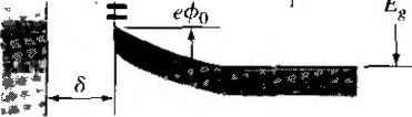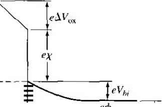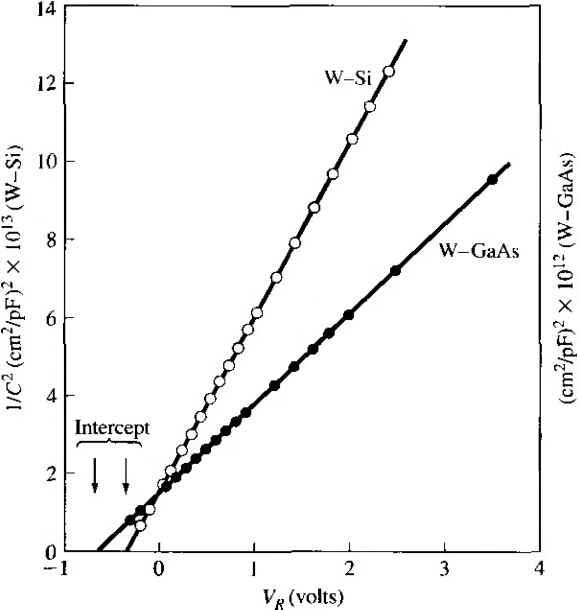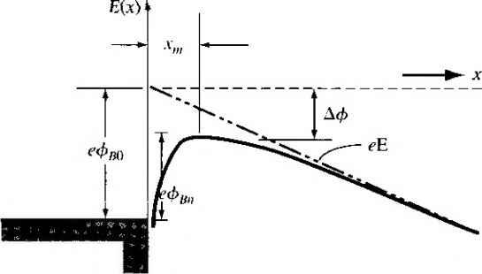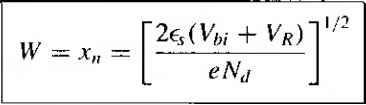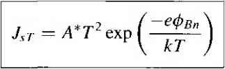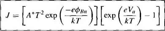 4.0 5.0 Metal work function, еф (eV) Figure 9.5 1 Experimental barrier heights as a function of metal work functions for GaAs and Si. (From Crowley and Sze [2}.) ![]() ![]() ![]() Figure 9.6 I Energy-band diagram of a metal-semiconductor junction with an interfacial layer and interface states. metal-semiconductor junction is determined by both the metal work function and semiconductor surface or interface states. A more detailed energy-band diagram of a metal to n-type semiconductor cont in thermal equilibrium is shown in Figure 9.6. We will assume that a narrow interfa layer of insulator exists between the metal and semiconductor. The interfacial layer i support a potential difference, but will be transparent to the flow of electrons betwe< the metal and semiconductor. The semiconductor also shows a distriburion of surf a states at the metal-semiconductor interface. We will assume that all states below surface potential фо are donor states, which will be neutral if the state contains an ek Iron and positively charged if the state does not contain an electron. We will also sume that all states above фо are acceptor states, which will be neutral if the state d( not contain an electron and negatively charged if the state contains an electron. The diagram in Figure 9.6 shows some acceptor states above фо and below Ер\ These states will tend to contain electrons and will be negatively charged. We assume that the surface state density is constant and equal to Djj states/cm-eV. relation between the surface potential, surface state density, and other sem icon duct( parameters is found to be I /-------- €( (9.16) We will consider two limiting cases. Case 1 Let Dit oc. In this case, the right side of Equation (9.16) goes to zero. We then have Ф fit} (9.1 The barrier height is now fixed by the bandgap energy and the potential фо- The barrier height is totally independent of the metal work function and the semiconductor electron affinity. The Fermi level becomes pinned at the surface, at the surface potential фо- Case 2 Let DjfS 0. Equation (9.16) reduces to Фви - (Фт - X) which is the original ideal expression. The Schottky barrier height is a function of the electric field in the semiconductor through the barrier lowering effect. The barrier height is also a function of the sur-face states in the semiconductor. The barrier height, then, is modified from the ideal theoretical value. Since the surface state density is not predictable with any degree of certainty, the barrier height must be an experimentally determined parameter. 9.1.4 Current-Voltage Relationship The current transpoil in a metaJ-semiconductor junction is due mainly to majority carriers as opposed to minority carriers in a pn junction. The basic process in the recrifying contact with an n-type semiconductor is by transport of electrons over the potential barrier, which can be described by the thermionic emission theory. The thermionic emission characteristics arc derived by using the assumptions that the barrier height is much larger than kT, so that the Maxwell-Boltzmann approximation applies and that thermal equilibrium is not affected by this process. Figure 9.7 shows the one-diinensional barrier with an applied forward-bias voltage Va and shows two electron current density components. The current Jsm is the electron current density due to the flow of electrons from the semiconductor into the metal, and the current J is is the electron current density due to the flow of electrons from the metal into the seiniconductor. The subscripts of the currents indicate the direction of electron flow. The conventional current direction is opposite to electron flow. The current density Л , is a function of the concentrarion of electrons which have ji-directed velocities sufficient to overcome the barrier. We may write dn (9.18) where E is the minimum energy required for thermionic emission into the metal, Vj, is the carrier velocity in the direction of transport, and e is the magnitude of the electronic charge. The incremental electron concentrarion is given by dn=gAE)ff(E)dE (9.19) where gc(E) is the density of states in the conduction band and fr(E) is the Fermi-Dirac probability function. Assuming that the Maxwell-Boltzmann approximation applies, we may write 4я(2т*)/ dn -- sIe - Ec exp -JE-Ef) kT dE (9.20) ![]() ![]() + Va - Figure 9,7 I Energy-band diagram of a forward-biased metal-semiconductor junction including the image lowering effect- If all of the electron energy above Ec is assumed to be kineric energy, then wehai (9.21 The net current density in the metal-to-semiconductor junction can be written as which is defined to be positive in the direction from the metal to the semiconductor. We find that ![]() (9.23) where ![]() The parameter A* is called the effective Richardson constant for thermionic emission. Equation (9.23) can be written in the usual diode form as (9.25) ![]() where Л? is the reverse-saturation current density and is given by ![]() (9.26) We may recall that the Schottky barrier height changes because of the image-force lowering. We have that фвп - Фно A0. Then we can write Equation (9.26) as T л*2 ( -Фво\ (е1\ф Jj - AT exp [ -\ exp (927) The change in barrier height, Аф, will increase with an increase in the electric field, or with an increase in the applied reverse-bias voltage. Figure 9.8 shows a typical reverse-bias current-voltage characteristic of a Schottky barrier diode. The reverse-bias current increases with reverse-bias voltage because of the barrier lowering effect. This figure also shows the Schottky barrier diode going into breakdown. 10- - i 10-* k Expcrimentili result ![]() Theoretical result 10 10 10 Vr (volts) Figure 9.81 Experimental and theoretical reverse-bias currents in a PtSi-Si diode. (From Sze [Ml) 1 ... 31 32 33 34 35 36 37 ... 55 |