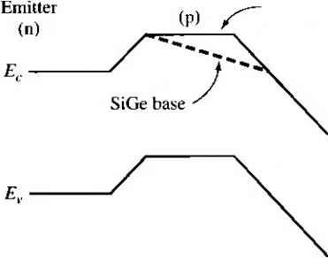 Главная » Журналы » Absorbing materialorganic polymer 1 ... 41 42 43 44 45 46 47 ... 55 С н А Р т Е R 10 The Bipolar 1 ransistor *10.8 I OTHER BIPOLAR TRANSISTOR STRUCTURES This section is intended to briefly introduce three specialized bipolar transistor structures. The first structure is the polysilicon emitter bipolar juncrion transistor (BJT), the second is the SiGe-base transistor, and the third is the heterojunction bipolar transistor (HBT). The polysilicon emitter BJT is being used in some recent integrated circuits, and the SiGe-base transistor and HBT are intended for high-frequency/highspeed applications. 10,8,1 Polysilicon Emitter BJT The emitter injection efficiency is degraded by the carriers injected from the base back into the emitter. The emitter width, in general, is thin, which increases speed and reduces parasitic resistance. However, a thin emitter increases the gradient in the minority carrier concentration, as indicated in Figure 10.19. The increase in the gradient increases the B-E junction current, which in turn decreases the emitter injection efficiency and decreases the common emitter current gain. This effect is also shown in the summary of Table 10.3. Figure 10.46 shows the idealized cross section of an npn bipolar transistor with a polysilicon emitter. As shown in the figure, there is a very thin n single crystal silicon region between the p-type base and the n-type polysilicon. As a first approximation to the analysis, we may treat the polysilicon portion of the emitter as low-mobility silicon, which ineans that the corresponding diffusion coefficient is small. Assuming that the neutral widths of both the polysilicon and single-crystal portions of the emitter are much smaller than the respective diffusion lengths, then the minority carrier distribution functions will be linear in each region. Both the minonty carrier concentration and diffusion current must be continuous across the polysilicon/ silicon interface. We can therefore write (10Л< ![]() p base ![]() n * polysilicon SiO, n coUc\;tor Figure 10.46 I Siinplified cross section of an npn polysilicon emitter BJT. Metal n poly emitter ![]() Figure 10,47 I Excess minority carrier hole concentrations in n polysilicon and n+ silicon emitter d{8pE(n-)) /Г(ро1у) d{8pE(po]y)) (ЮЛОбЬ) Since Д:(ро[>) < £*е(п+), then the gradient of the minority carrier concentration at the emitter edge of the B-E depletion region in the n+ region is reduced as Figure 10.47 shows. This implies that the current back-injected from the base into the emitter is reduced so that the common-emitter current gain is increased. 10.8.2 Silicon-Germanium Base Transistor ТЪе bandgap energy of Ge ( 0.67 eV) is significantly smaller than the bandgap energy of Si(1.12eV). By incorporating Ge into Si, the bandgap energy will decrease compared to pure Si. If Ge is incoфorated into the base region of a Si bipolar transistor, the decrease in bandgap energy will influence the device characterisfics. The desired Ge concentration proflle is to have the largest amount of Ge near the base-collector junction and the least amount of Ge near the base-emitter junction. Figure 10.48a shows an ideal uniform boron doping concentration in the p-type base and a linear Ge concentration profile. The energy bands of a SiOe-base npn transistor compared to a Si-base npn transistor, assuming the boron and Ge concentrations given in Figure 10.48a, are shown in Figure 10.48b. The emitter-base junctions of the two transistors are essentially idemical, since the Ge concentration is very small in this region. However, the bandgap energy of the SiGe-base transistor near the base 4;ollector junction is smaller than that of the Si-base transistor. The base current is determined by the base-emitter junction parameters and hence will be essentially the same in the two transistors. This change in bandgap energy will influence the collector current. Concentration Boron ![]() Base Si base ![]() Collector (n) Figure 10.48 f (a) Assumed boron and germanium concentradons in the base of the SiGe-base transistor (b) Energy band diagram of the Si- and SiGe-base transistors. Collector Current and Current Gain Effects Figure 10.49 shows the therms equilibrium minority carrier electron concentration through the base region of SiGe and Si transistors. This concentration is given by (lO.li в where Nb is assumed to be constant. The intrinsic concentration, however, is a func- tion of the bandgap energy. We may write /7 (SiGe) (AE. = exp I nfiSi) (10.1081 where л,-(SiGe) is the intrinsic carrier concentration in the SiGe material, ,(Si) is the intrinsic carrier concentration in the Si material, and AE is the change in the bandgap energy of the SiGe material compared to that of Si. The collector current in a SiGe-base transistor will increase. As a first approximation, we can see this from the previous analysis. The collector current was found from Equation (10.36a), in which the derivative was evaluated at the base-collector Electron concentration Emitter Base no SiGc base ![]() Collector Figure 10.49 I Thermal equiUbrium minority carrier electron concentration through the base of the Si- and SiGe-base transistors. junction. This means that the value of n in the collector current expression in Equation (10.37) is the value at the base-collector junction. Since this value is larger for the SiGe-base transistor (Figure 10.49), the collector current will be larger compared to the Si base transistor. Since the base currents are the same in the two transistors, the increase in collector current then implies that the current gain in the SiGe-base transistor is larger. If the bandgap narrowing is 100 meV, then the increase in the collector current and current gain will be approximately a factor of four. Early Voltage Effects The Early voltage in a SiGe-base transistor is larger than that of the Si-base transistor. The explanation for this effect is less obvio