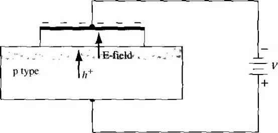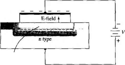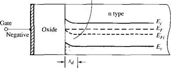 Главная » Журналы » Absorbing materialorganic polymer 1 ... 43 44 45 46 47 48 49 ... 55 an inversion charge density at the semiconductor surface. The threshold voltage is defined as the applied gate voltage required to create the inversion layer charge and is one of the important parameters of the MOSFET. The various types of MOSFETs are examined and a qualitative discussion of the current-voltage characteristics is initially presented. A mathematical derivation Qf the current-voltage relation is then covered in detail. The frequency response and limitations of the MOSFET are also considered. Although we have not discussed fabrication processes in any detail in this text, there is an MOS technology that should be considered, since it directly influences the characteristics and properties of the MOS devices and circuits. We will consider the complementary MOS (CMOS) process. The discussion of this technology will be brief, but should provide a good base for further in-depth study. 11.1 I THE TWO-TERMINAL MOS STRUCTURE The heart of the MOSFET is the metal-oxide-semiconductor capacitor shown in Figure 11.1. The metal may be aluminum or some other type of metal, although in many cases, it is actually a high-conductivity polycrystalline silicon that has been deposited on the oxide; however, the term metal is usually still used. The parameter tj in the figure is the thickness of the oxide and tox is the permittivity of the oxide. 11ЛЛ Energy-Band Diagrams The physics of the MOS structure can be more easily explained with the aid of the simple parallel-plate capacitor. Figure 11,2a shows a parallel-plate capacitor with the top plate at a negative voltage with respect to the bottom plate. An insulator material separates the two plates. With this bias, a negative charge exists on the top plate, a positive charge exists on the bottom plate, and an electric field is induced between the two plates as shown. The capacitance per unit area for this geometry is (11Л) .V Semiconductor substrate Metal Insulator (oxide) О Figure 11.1 I The basic MOS capacitor structure. ![]() E field P type ![]() Accumulation layer of holes Figure 11.2 I (a) A parallel-plate capacitor showing the electric field and conductor charges, (b) A corresponding MOS capacitor with a negafive gate bias showing the electric field and charge flow, (c) The MOS capacitor with an accumulafion layer of holes. where € is the permittivity of the insulator and d is the distance between the two plates. The magnitude of the charge per unit area on either plate is e-cv (11.2) where the prime indicates charge or capacitance per unit area. The magnitude of the electric field is Figure 11.2b shows an MOS capacitor with a p-type semiconductor substrate. The top metal gate is at a negative voltage with respect to the semiconductor substrate. From the example of the parallel-pi ate capacitor, we can see that a negative charge will exist on the top metal plate and an electric field will be induced with the direction shown in the figure. If the electric field were to penetrate into the semiconductor, the majority carrier holes would experience a force toward the oxide-semiconductor interface. Figure 11.2c shows the equilibrium distriburion of charge in the MOS capacitor with this particular applied voltage. An acciimidation layer of holes in the oxide-semiconductor juncrion corresponds to the positive charge on the bottom plate of the MOS capacitor. Figure 11.3a shows the same MOS capacitor in which the polarity of the appli( voltage is reversed. A positive charge now exists on the top metal plate and the ii duced electric field is in the opposite direction as shown. If the electric field pent trates the semiconductor in this case, majority carrier holes will experience a fore away from the oxide-semiconductor interface. As the holes are pushed away frot the interface, a negative space charge region is created because of the fixed ioni: acceptor atoms. The negative charge in the induced depletion region corresponds the negative charge on the bottom plate of the MOS capacitor. Figure 11.3b sho the equilibrium distribution of charge in the MOS capacitor with this applied voltaj The energy-band diagram of the MOS capacitor with the p-type substrate, for case when a negative voltage is applied to the top metal gate, is shown in Figure 11 j-The valence-band edge is closer to the Fermi level at the oxide-semiconductor interface than in the bulk material, which implies that there is an accumulation of hoU The semiconductor surface appears to be more p-type than the bulk material. Fermi level is a constant in the semiconductor since the MOS system is in thei equilibrium and there is no current through the oxide. Figure 11.4b shows the energy-band diagram of the MOS system when a tive voltage is applied to the gate. The conduction and valence band edges bend + + + + + + + + + + + + ![]() ![]() Induced space charge region Figure 11.3 I The MOS capacitor with a moderate positive gate bias, showing (a) the electric field and charge flow and (b) the induced space charge region. Gate Negative voltage applied -< Oxide ![]() ptype Accumulation layer of holes (a) Gale Positive voltage applied ![]() ptype Induced space charge region (b) Figure 11.41 The energy-band diagram of an MOS capacitor with a p-type substrate for (a) a negative gate bias and (b) a moderate positive gate bias. 11-1 The Two-Terminal MOS Structure hown in the figure, indicating a space charge region similar to that in a pn junction. The conduction band and intrinsic Fermi levels move closer to the Fermi level. The induced space charge width is x. Now consider the case when a still larger positive voltage is applied to the top metal gate of the MOS capacitor. We expect the induced electric field to increase in magnitude and the corresponding positive and negative charges on the MOS capacitor to increase. A larger negative charge in the MOS capacitor implies a larger induced spac