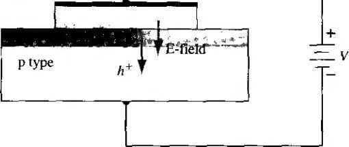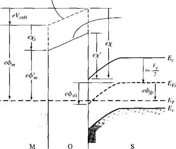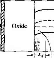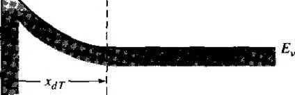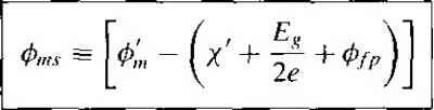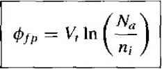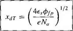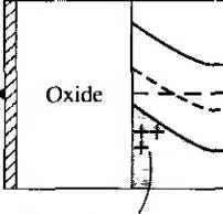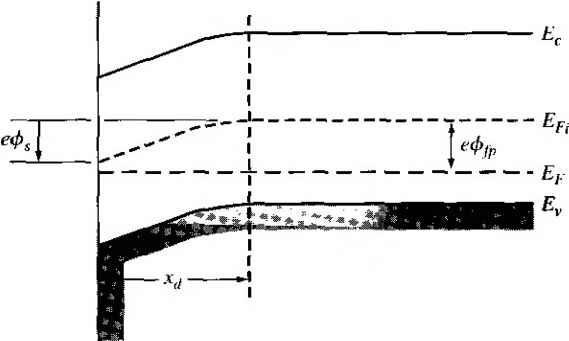 ![]() Figure 11.10 I The energy-band diagram in the n-type semiconductor at the threshold inversion point. 0,01 J i L U. 1 A 1. 1 7 - 300 К J I L. \ L 10 1qI6 iqJ7 V, semiconductor doping (cm ) Figure Н.И I Maximum induced space charge region width versus semiconductor doping. TEST YOUR UNDERSTANDING Ell.l (a) Consider as oxide-to-p-type siHcon junction at Г = 300 К. The impurity doping concentration in the siHcon is jV =3 x lO cmV Calculate the maximum space-charge width in the silicon, {b) Repeat part {a) for an impurity concentration of Л^ 10 cm- iwr/ ШЪ{Я) ш^08ГО(г^) Ell.2 Consider an oxide-to-n-type silicon junction at T = 300 K, The impurity doping concentration in the silicon is jVj = 8 x 10 cm~\ Calculate the maximum space-charge width in the siHcon. iiO UV) 11.1,3 Work Function Differences We have been concerned, so far, with the energy-band diagrams of the semiconduc- tor material. Figure 11.12a shows the energy levels in the metal, silicon dioxide, andj silicon relative to the vacuum level The metal work function is фщ and the electronj affinity is /. The parameter is the oxide electron affinity and, for silicon dioxiddj Xi = 0.9 V. 1 Figure 11.12b .shows the energy-band diagram of the entire metal-oxide-semiconductor structure with zero gate voltage applied. The Fermi level is a constant through the enrire system at thermal equilibrium. We may define as a modifiei metal work funcrion-the potenrial required to inject an electron from the metal int the conduction band of the oxide. Similarly, /is defined as a modified electron affinity. The voltage KiitO is the potential drop across the oxide for zero applied gal voltage and is not necessarily zero because of the difference between фщ and potenrial is the surface potential for this case. Metal , Уасиигп Jevel E.. - 9 eV -Epi Silicon dioxide p-typc silicon (a) Vacuum level Metal \ Oxide p-type semiconductor Oxide conduction band ![]() Figure 11Л2 I (a) Energy levels in an MOS system prior to contact and (b) energy-band diagram through the MOS structure in thermal equilibrium after contact. If we sum the energies from the Fermi level on the metal side to the Fermi level on the semiconductor side, we have eфso + еф/р (1E9) Equation (11.9) can be rewritten as We can define a potenrial 0 as ![]() (11.10) (IMl) which is known as the metal-semiconductor work function difference. Objecrive example 11.2 To calculate the metal-semiconductor work function difference <, , for a given MOS systein and semiconductor doping. 1 ... 43 44 45 46 47 48 49 ... 55 |