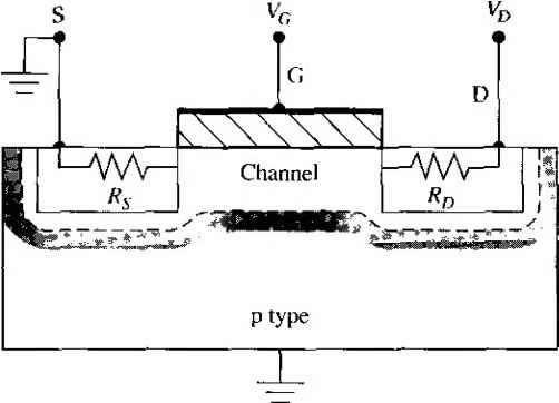 Главная » Журналы » Absorbing materialorganic polymer 1 ... 49 50 51 52 53 54 55 a negative gate voltage. Thus, an inversion Jayer of mobile charge сип be created adjacent to the oxide. The basic MOS field-effect action is the modulation of the inversion charge density, or channel conductance, by the gate voltage. The C- V characteristics of the MOS capacitor were considered. The amount of equivj oxide trapped charge and the density of interface states, for example, can be determii from the C-V measurements. Two basic types of MOSFFTs are the n channel, in which current is due to the flow of electrons in the inversion layer, and the p channel, in which current is due to the flow of holes in the inversion layer. Fach of these devices can be cither enhancement mode, in which the device is normally off and is turned on by applying a gate voltage, or depletion mode, in which the device is normally 4>n and is turned off by applying a gate voltage. The flat-band voltage is the gale voltage that must be applied to achieve the llat-band condition, in which the conduction and valence bands in the semiconductor do not ben and there is no space charge region in the semiconductor. The flat-band voltage is a function of the metal-oxide barrier height, the sem icond uctor-iixide hairier height, anc the amount of fixed trapped oxide charge. The threshold voltage is the applied gate voltage required to reach the threshold inversion point, which is the condition at which the inversion charge density is equal in magnitude to the semiconductor doping concentration. The threshold voltage is a function of the flat-band voltage, semiconductor doping concentration, and oxide thickness. The current in a MOSFFf is due to the flow of carriers m the inversion layer between the source and drain terminals. The inversion layer charge density and channel conductance are controlled by the gate voltage, which means that the channel currem is also controlled by the gate voltage. When the transistor is biased in the nonsaturation region {Vs < ViTsat)), the inversion charge extends completely across the channel from the source to the drain terminals. The drain current is a function of both the gate-to-source and drain-to-source voltages- When the transistor is biased in the saturation region (Vds > Vo.tsat)), the inversion charge density is pinched off near the drain terminal, and the ideal drain current is only a function of the gate-to-source voltage. The MOSFET is actually a four-terminal device, with the substrate or body being the fourth terminal. As the magnitude of the re verse-bias source-to-substrate voltage increases, the magnitude of the threshold voltage increases. The substrate bias effect may become important in integrated circuits in which the source and substrate are not electrically tied together , Asmail-signalequivalentcircuit,including capaci tances, of the MOS FET was developed The various physical factors in the MOSFET that affect the frequency limitations were considered. In particular, the drain overlap capacitance may be a limitmg factor in the frequency response of the MOSFET because of the Miller effect. The cutoff frequency, a figure of merit for the frequency response of the device, is inversely proportional to channel length: thus, a reduction in channel length results in an increased frequency \ capability of the MOSFET The CMOS technology, in which both n-channel and p-channel devices are fabricated in the same semiconductor chip, was briefly considered. Electrically isolated p- and n-substrate regions arc required to acconunodate the two types of transistors. Various processes are used to fabricate this structure. One potential problem encountered in the CMOS structure is latch-up-the high-cuiTcnt, low-voltage condition that may occur in a four-layer pnpn structure. Glossary of Important Terms 511 GLOSSARY OF IMPORTANT TERMS accumulation layer cliarge The induced charge directly under an oxide that is in excess of the thermal-equilibrium majority carrier concentration. bulk charge effect The deviation in drain current from the ideal due to the space charge width variation along the channel length caused by a drain-to-source vohage. channel conductance The ratio of drain current to drain-to-source voltage in the limit as channel conductance modulation The process whereby the channel conductance varies with gate-to-source voltage. CMOS Complementary MOS; the technology that uses both p- and n-channel devices in an electronic circuit fabricated in a single semiconductor chip. cutoff frequency The signal frequency at which the input ac gate current is equal to the output ac drain current. depletion mode MOSFET The type of MOSFET in which a gate voltage must be applied to turn the device off. enhancement mode MOSFET The type of MOSFET in which a gate voltage must be applied to turn the device on. equivalent fixed oxide charge The effective fixed charge in the oxide, g, directly adjacent to the oxide-semiconductor interface. flat-hand voltage The gate voltage that must be applied to create the flat-band condifion in which there is no space charge region in the semiconductor under the oxide, gate capacitance charging time The time during which the input gale capacitance is being charged or discharged because of a step change in the gate signal. interface states The allowed electronic energy states within the bandgap energy at the oxi de-sem iconductor in terface. inversion layer charge The induced charge direcdy under the oxide, which is the opposite type compared with the semiconductor doping. inversion layer mobility The mobility of carriers in the inversion layer latch-up The high-current, low-voltage condifion that may occur in a four-layer pnpn structure such as in CMOS. maximum induced space charge width The width of the induced space charge region under the oxide at the threshold inversion condition. metal-semiconductor work function difference The parameter ф, < a funct