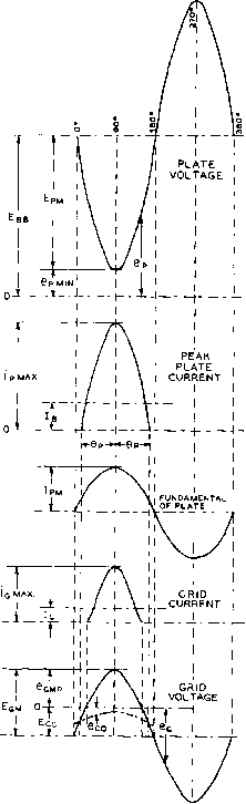 Ãëàâíàÿ » Æóðíàëû » Simple coaxial reflectometer 1 ... 12 13 14 15 16 17 18 ... 80 ance of a vacuum tube at higher frequencies is brought about by a number of factors. The first, and most obvious, is the fact that the dielectric loss in the internal insulators, and in the base and press of the tube increases with frequency. The second factor is due to the fact that a finite time is required for an electron to move from the space charge in the vicinity of the cathode, pass between the grid wires, and travel on to the plate. The fact that the electrostatic effect of the grid on the moving electron acts over an appreciable portion of a cycle at these high frequencies causes a current flow in the grid circuit which appears to the input circuit feeding the grid as a resistance. The decrease in input resistance of a tube due to electron transit time varies as the square of the frequency. The undesirable effects of transit time can be reduced in certain cases by the use of higher plate voltages. Transit time varies inversely as the square root of the applied plate voltage. Cathode lead inductance is an additional cause of reduced input resistance at high frequencies. This effect has been reduced in certain tubes such as the 6SH7 and the 6AK5 by providing two cathode leads on the tube base. One cathode lead should be connected to the input circuit of the tube and the other lead should be connected to the by-pass capacitor for the plate return of the tube. The reader is referred to the Radiation Laboratory Series, Volume 23: Microwave Receivers (McGraw-Hill, publishers) for additional information on noise factor and input loading of vacuum tubes. Plote-Circuit Considerations Noise is generated in a vacuum tube by the fact that the current flow within the tube is not a smooth flow but rather is made up of the continuous arrival of particles (electrons) at a very high rate. This shot effect is a source of noise in the tube, but its effect is referred back to the grid circuit of the tube since it is included in the equivalent noise resistance discussed in the preceding paragraphs. Plate Circuit For the purpose of this section, Coupling it will be considered that the function of the plate load circuit of a tuned vacuum-tube amplifier is to deliver energy to the next stage with the greatest efficiency over the required band of frequencies. Figure 1 shows three methods of interstage coupling for tuned r-f voltage amplifiers. In figure lA omega (cS) is 2n times the resonant frequency of the circuit in the plate of ![]() @ AMPLIFICATION AT RESONANCE(APPROX.) =GmU)LQ ![]() O+b © AMPLIFICATION AT RESONANCE CAPPROX.)=GmOUMQ ![]() Î / CP î î î î î î Lp Ls © AMPLIFICATION AT RESONANCEfAPPROHGMÊ QpQi WHEHEi 1. PHI. AND SEC. RESONANT AT SAME PREQUENCY 2. Ê IS COEPPICIENT OF COUPLING IF PRI. AND SEC. Q ARE APPROXIMATELY THE SAME. TOTAL BANDWIDTH - . , \t CENTER FREQUENCY MAXIMUM AMPLITUDE OCCURS AT CRITICAL COUPLING-1 WHEN Ê = /qTqs Figure 1 Goin equations for p e nta de r-f amplifier stages operating into a tuned load the amplifier tube, and L and Q are the inductance and Q of the inductor L. In figure IB the notation is the same and M is the mutual inductance between the primary coil and the secondary coil. In figure 1Ñ the notation is again the same and k is the coefficient of coupling between the two tuned circuits. As the coefficient of coupling between the circuits is increased the bandwidth becomes greater but the response over the band becomes progressively more double-humped. The response over the band is the most flat when the Qs of primary and secondary are approximately the same and the value of each Q is equal to 1.75/4. Variabie-Mu Tubes It is common practice to in R-F Stages control the gain of a suc- cession of r-f or i-f amplifier stages by varying the average bias on their control grids. However, as the bias is raised above the operating value on a conventional sharp-cutoff tube the tube becomes increasingly non-linear in operation as cutoff of plate current is approached. The effect of such non-linearity is to cause cross modulation between strong signals which appear on the grid of the tube. When a tube operating in such a manner is in one of the first stages of a receiver a number of signals are appearing on its grid simultaneously and cross modulation between them will take place. The result of this effect is to produce a large number of spurious signals in the output of the receiver-in most cases these signals will carry the modulation of both the carriers which have been cross modulated to produce the spurious signal. The undesirable effect of cross modulation can be eliminated in most cases and greatly reduced in the balance through the use of a variable-mu tube in all stages which have a-v-c voltage Or other large negative bias applied to their grids. The variable-mu tube has a characteristic which causes the cutoff of plate current to be gradual with an increase in grid bias, and the reduction in plate current is accompanied by a decrease in the effective amplification factor of the tube. Variable-mu tubes ordinarily have somewhat reduced G as compared to a sharp-cutoff tube of the same group. Hence the sharp-cutoff tube will perform best in stages to which a-v-c voltage is not applied. RADIO-FREQUENCY POWER AMPLIFIERS All modern transmitters in the medium-frequency range and an increasing percentage of those in the v-h-f and u-h-f ranges consist of a comparatively low-level soiirce of radio-frequency energy which is multiplied in frequency and successively amplified to the desired power level. Microwave transmitters are still predom-inatelv of the self-excited oscillator type, but when it is possible to use r-f amplifiers in s-h-f transmitters the flexibility of their application will be increased. The following portion of this chapter will be devoted, however, to the method of operation and calculation of operating characteristics of r-f power amplifiers 