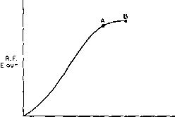 ![]() R.F. EiN Figure 14 Eg-lp CURVE Awplifier opsratian is confined to most linear portion of characteristic curve. The relationship between exciting voltage in a Class ABl amplifier and the r-f plate circuit voltage is shown in figure 15. With a small value of static plate current the lower portion of the line is curved. Maximum un-distorted output is limited by the point on the line (A) where the instantaneous plate voltage down to the screen voltage. This hook in the line is caused by current diverted from the plate to the grid and screen elements of the tube. The characteristic plot of the usual linear amplifier takes the shape of an S-curve. The lower portion of the curve is straightened out by using the proper value of static plate current, and the upper portion of the curve is avoided by limiting minimum plate voltage swing to a point substantially above the value of the screen voltage. Operating Parameters The approximate oper-for the Class ABl ating parameters may be Linear Amplifier obtained from the Con- stant Current curves (Eg-Ep) or the Eg-Ip curves of the tube in question. An operating load line is first approximated. One end of the load line is determined by the d-c operating voltage of the tube, and the required static plate current. As a starting point, let the product of the plate voltage and current equal the plate dissipation of the tube. Assuming we have a 4-400A tetrode, this end of the load line will fall on point A (figure 16). Plate power dissipation is 360 watts (3000V @ 120 ma). The opposite end of the load line will fall on a point determined by the minimum instantaneous plate voltage, and by the maximum instantaneous plate current. The minimum plate voltage, for best linearity should be considerably higher than Figure 15 LINEARITY CURVE OF TYPICAL TETRODE AMPLIFIER At point A the /nsfonfoneous plate voltage is svfinging down fo the value of screen voltage. Af point B it is swinging we be/ow fhe screen and is approaching the point where sofurofion, Or plate current limiting fakes place. the screen voltage. In this case, the screen voltage is 500, so the minimum plate voltage excursion should be limited to 600 volts. Class ABI operation implies no grid current, therefore the load line cannot cross the Eg=0 line. At the point Ep=600, Eg=0, the maximum plate current is 580 ma (Point B ). Each point the load line crosses a grid voltage axis may be taken as a point for construction of the Eg-Ip curve, just as was done in figure 22, chapter 6. A constructed curve shows that the approximate static bias voltage is-74 volts, which checks closely with point A of figure 16. In actual practice, the bias voltage is set to hold the actual dissipation slightly below the maximum figure of the tube. The single tone power output is: Emax-EminxIpmax. or ЗООР-бОО X. 58 = 348 watts The plate current-angle efficiency factor for this class of operation is 0.73, and the actual plate circuit efficiency is: ND=Emax-EminX0.73, ОГ ЗОООбОО X 0.73 = 58.4% Emax 3000 The power input to the stage is therefore Po X 100 or, 348 = 595 watts Np 58.4 The plate dissipation is: 595-348 = 247 watts. HANDBOOK AB, R.F. Power Amplifiers 167 + 2S о 0 -1S0