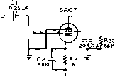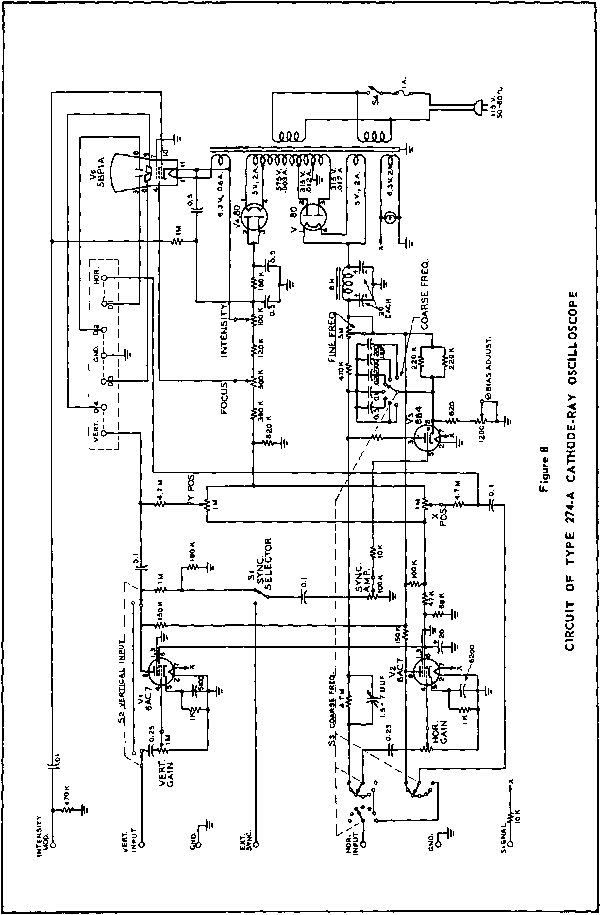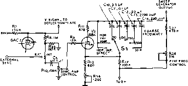 Главная » Журналы » Simple coaxial reflectometer 1 ... 14 15 16 17 18 19 20 ... 80 Time Base Generator VERT. AMP. r1 i. CONTROL 1M > ![]() ntensity mod. R15,47 К R 16.100 -O OUTPUT R7,1S0K Figure 2 TYPICAL AHflPLIFIER SCHEMATIC ![]() R2S R2 r23 R22 laoK leoK 0K 120K R2t lOOK the cathode-ray tube. Also, as shown in figure 1, S2 has been incorporated to by-pass the vertical amplifier and capacitively couple the input signal directly to the vertical deflection plate if so desired. In figure 2, V, is a 6AC7 pentode tube which is used as the vertical amplifier. As the signal variations appear on the grid of V, variations in the plate current of will take place. Thus signal variations will appear in opposite phase and greatly amplified across the plate resistor, Rj. Capacitor Cj has been added a-cross Rj in the cathode circuit of Vj to flatten the frequency response of the amplifier at the high frequencies. This capacitor because of its low value has very little effect at low input frequencies, but operates more effectively as the frequency of the signal increases. The amplified signal delivered by Vj is now applied through the second half of switch Sj and capacitor C4 to the free vertical deflection plate of the cathode-ray tube (figure 3). The Horizontol The circuit of the horizontal Amplifier amplifier and the circuit of the vertical amplifier, described in the above paragrh, are similar. A switch in the input circuit makes provision for the input from the Horizontal Input terminals to be capacitively coupled to the grid of the horizontal amplifier or to the free horizontal deflection plate thus by-passing the amplifier, or for the output of the sweep generator to be capacitively coupled to the amplifier, as shown in figure 1. The Time Base Investigation of electrical Generator wave forms by the use of a cathode-ray tube frequently requires that some means be readily available to determine the variation in these wave forms with respect to time. When such a time base is required, the patterns presented on the cathode-ray tube screen show the variation in amplitude of the input signal with respect to Figure 3 SCHEMATIC OF CATHODE-RAY TUBE CIRCUITS A 5BPIA caihoderay tube is used in this instrument. As shown, the necessary potentials for operating this tube are obtained from a voltage divider made up of resistors f21 through R26 inc/usiVe. The intensity of the beam is adjusted by moving the corrfoct on R21- This adjusts the potential on the cathode more or less negative with respect to the grid which is operated at the full negative voltage~1200 volts. Focusing to the desired sharpness is accomplished by adjusting the contact on Rjj to provide the correct poterttial for anode no. I. Interde-pendency between the focus and the, intensity controls is inherent in all electrostatically focused cathode-ray tubes. In short, there Is an optimum setting of the focus control for every setting of the intensity control. The second alюde of the SBP1A is operated at ground poterttial in this Instrument. Also one of each pair of deflection plates is operated at ground potential. The cathode is operated at a high negative potential (approximately 12(Ю volts) so that the total overall accelerating voltage of this tube is regarded as 1200 volts since the second artode is operated at ground poterttial. The vertical and horizontal positioning controls which are connected to their respective deflection plates are capable of supplying either a positive or negative d-c potential to the deflection plates. This permits the spot to be positioned at any desired place on the entire screen. time. Such an arrangement is made possible by the inclusion in the oscilloscope of a Time Base-Generator. Th6 function of this generator is to move the spot across the screen at a constant rate from left to right between two selected points, to return the spot almost instantaneously to its original position, and to ![]() Figure 4 SAWTOOTH WAVE FORM repeat this procedure at a specified rate. This action is accomplished by the voltage output from the time base (sweep) generator. The rate at which this voltage repeats the cycle of sweeping the spot across the screen is referred to as the sweep frequency. The sweep voltage necessary to produce the motion described above must be of a sawtooth waveform, such as that shown in figure 4. The sweep occurs as the voltage varies from A to B, and the return trace as the voltage varies from В to C. If A-B is a straight line, the sweep generated by this voltage will be linear. It should be realized that the sawtooth sweep signal is only used to plot variations in the vertical axis signal with respect to time. Specialized studies have made necessary the use of sweep signals of various shapes which are introduced from an external source through the Horizontal Input terminals. The Sowtooth The sawtooth voltage neces-Generator sary to obtain the linear time base is generated by the circuit of figure 5, which operates as follows: A type 884 gas triode (V,) is used for the sweep generator tube. This tube contains an inert gas which ionizes when the voltage between the cathode and the plate reaches a certain value. The ionizing voltage depends upon the bias voltage of the tube, which is determined by the voltage divider resistors Ri2-Ri7-With a specific negative bias applied to the 884 tube, the tube will ionize (or fire) at a specific plate voltage. Capacitors C10-c14 are selectively connected in parallel with the 884 tube. Resistor Rn limits the peak current drain of the gas triode. The plate voltage on this tube is obtained through resistors Rjg, R and R. The voltage applied to the plate of the 884 tube cannot reach the power supply voltage because of the charging effect this voltage has upon the capacitor which is connected across the tube. This capacitor charges until the plate voltage becomes high enough to ionize the gas in the tube. At this time, the 884 tube starts to conduct an