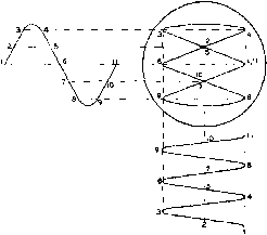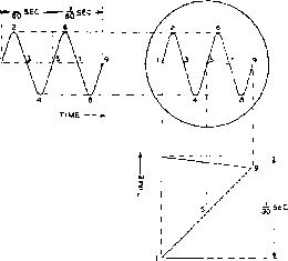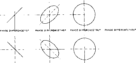 PHASE DIFFkRENCE ieO> PHASE Dl FFERENCE =225 PHASE DIFFERENCE 270- PHASE DIFFERENCE 3 I 5 Figure H LISSAJOUS PATTERNS OBTAINED FROM THE MAJOR PHASE DIFFERENCE ANGLES the number of loops which intersect ВС as the frequency of the horizontal signal is to the frequency of the vertical signal. Figure 13 shows other examples of Lissajous figures. In each case the frequency ratio shown is the frequency ratio of the signal on the horizontal axis to that on the vertical axis. Phase Differ- Coming under the heading of once Patterns Lissajous figures is the method used to determine the phase difference between signals of the same frequency. The patterns involved take on the form of ellipses with different degrees of eccentricity. The following steps should be taken to obtain a phase-difference pattern: 1. With no signal input to the oscilloscope, the spot should be centered on the screen of the tube. 2. Connect one signal to the vertical amplifier of the oscilloscope, and the other signal to the horizontal amplifier. 3. Connect a common ground between the two frequencies under investigation and the oscilloscope. 4. Adjust the vertical amplifier gain so as to give about 3 inches of deflection on a 5 inch tube, and adjust the calibrated scale of the oscilloscope so that the vertical axis of the scale coincides precisely with the vertical deflection of the spot. 5. Remove the signal from the vertical amplifier, being careful not to change the setting of the vertical gain control. 6. Increase the gain of the horizontal amplifier to give a deflection exactly the same as that to which the vertical am- plifier control is adjusted (3 inches). Reconnect the signal to the vertical amplifier. The resulting pattern will give an accurate picture of the exact phase difference between the two waves. If these two patterns are exactly the same frequency but different in phase and maintain that difference, the pattern on the screen will remain stationary. If, however, one of these frequencies is drifting slightly, the pattern will drift slowly through 360 . The phase angles of 0°, 45°, 90°, 135°, 180°, 225°, 270°, 315° are shown in figure 14. Each of the eight patterns in figure 14 can be analyzed separately by the previously used ![]() ![]() Figure 15 PROJECTION DRAWING SHOWING THE RESULTANT PHASE DIFFERENCE PATTERN OF TWO SINE WAVES 45° OUT OF PHASE