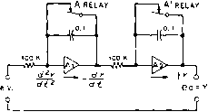 Главная » Журналы » Simple coaxial reflectometer 1 ... 17 18 19 20 21 22 23 ... 80 HANDBOOK Analog Problems 201 fit) > OPERATE RELAY -wv- OPERATE RELAY 1 m -iW- set voltage to Y = YO at time t=0 (initial displacement) -C-Kr+fii) TO DISPLAY OSCILLOSCOPE Figure 20 ANALOG SOLUTION FOR MASS-SPRING-DAMPER PROBLEM OF FIGURE 19. output of the summing amplifier (A3) to the input of the first as shown in figure 20 satisfies the equation. To obtain a solution to the problem, the initial displacement and velocity must be specified. This is done by charging the integrating capacitors to the proper voltages. Three operational amplifiers and a summing amplifier are required. A second problem that may be solved by the analog computer is the example of a freely falling body. Disregarding air resistance, the body will fall (due to the action of gravity) with a constant acceleration. The equation describing this action is: F mg-m (18) Integration of equation (18) will give the velocity, or ~~ , and integration a second time dt will give displacement, or y. The block diagram of a suitable computer for this problem is shown in figure 21. If a voltage proportional to g and hence to is introduced into the first amplifier, the output of that unit will be -A, dt or the :d±V