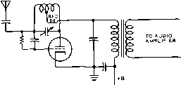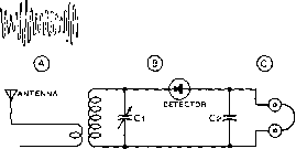 TENSILE STRENGTH BUT CANNOT BE FLATTENED OR BENT. CHAPTER TWELVE Radio Receiver Fundamentals A conventional reproducing device such as a loudspeaker or a pair of earphones is incapable of receiving directly the intelligence carried by the carrier wave of a radio transmitting station. It is necessary that an additional device, called a radio receiver, be placed between the receiving antenna and the loudspeaker or headphones. Radio receivers vary widely in their complexity and basic design, depending upon the intended application and upon economic factors. A simple radio receiver for reception of radiotelephone signals can consist of an earphone, a silicon or germanium crystal as a carrier rectifier or demodulator, and a length of wire as an antenna. However, such a receiver is highly insensitive, and offers no significant discrimination between two signals in the same portion of the spectrum. On the other hand, a dual-diversity receiver designed for single-sideband reception and employing double or triple detection might occupy several relay racks and would cost many thousands of dollars. However, conventional communications receivers are intermediate in complexity and performance between the two extremes. This chapter is devoted to the principles underlying the operation of such conventional communications receivers. 12-1 Detection or Demodulation A detector or demodulator is a device for removing the modulation (demodulating) or detecting the intelligence carried by an incoming radio wave. Radiotelephony Figure 1 illustrates an ele-Demodulatlon mentary form of radiotelephony receiver employing a diode detector. Energy from a passing radio wave will induce a voltage in the antenna and cause a radio-frequency current to flow from antenna to ground through coil Lj. The alternating magnetic field set up around L, links with the turns of Lj and causes an t-f current to flow through the parallel-tuned circuit, l2-C1, When variable capacitor Cj is adjusted so that the tuned circuit is resonant at the frequency of the applied signal, the r-f voltage is maximum. This r-f voltage is applied to the diode detector where it is rectified into a varying direct current and passed through the earphones. The variations in this current correspond to the voice modulation placed on the signal at the transmitter. As the earphone diaphragms vibrate back and forth in accord- ![]() X Lt Lz - GROUND Figure 1 ELEMENTARY FORM OF RECEIVER This is t/ e basis of the crystal set type of receiver, although a vacuum diode may be used in place of the crystal diode. The tank circuit Lj-Cj IS tuned to the frequency it is desired to receive. The by-pass capacitor across the phones should have a low reactance to fhe carrier frequency being received, but a high reactance to the modulation on the received signal. О О О О О 7г Е МЛЛг- COILS WOUND IN SAME DIRECTION ![]() AUDIO OUTPUT PLATE-TICKLER REGENERATION WITH THROTTLE* CONDENSER REGENERATION CONTROL. О о о о о 7Г AUDIO OUTPUT ![]() CATHODE-TAP REGENERATION WITH SCREEN VOLTAGE REGENERATION CONTROL. ance with the pulsating current they audibly reproduce the modulation which was placed upon the carrier wave. The operation of the derecror circuir is shown graphically above the detector circuit in figure 1. The modulated carrier is shown at A, as it is applied to the antenna. В represents the same carrier, increased in amplitude, as it appears across the tuned circuit. In С rhe varying d-c output from the detector is seen. Figure 2 REGENERATIVE DETECTOR CIRCUITS Regeneroffve defectors are seldom used at fhe pre-sertt time due fo their poor selectivity. However, they do illustrate fhe sinplesf type of receiver which may be used either for radiophone or radio-telegraph reception. Radiotelegraph/ Since a c-w Telegraphy sig-Reception nal consists of an unmodu- lated carrier which is interrupted to form dots and dashes, it is apparenr thar such a signal would not be made audible by detection alone. While the keying is a form of modulation, it is composed of such low frequency components that rhe keying envelope itself is below the audible range for hand keying speeds. Some means must be provided whereby an audible tone is heard while the unmodulated carrier is being received, the tone sropping immediately when the carrier is interrupted. The most simple means of accomplishing this is ro feed a locally generated carrier of a slighrly different frequency into the same detector, so that the incoming signal will mix wirh ic to form an audible beat note. The difference frequency, or heterodyne as the beat note is known, will of course stop and start in accordance with rhe incoming c-w radiotelegraph signal, because the audible heterodyne can exist only when both rhe incoming and the locally generared carriers are present. The Autodyne The local signal which is used Detector to beat with the desired c-w signal in the detector may be supplied by a separate low-power oscillaror in the receiver itself, or the detector may be made to self-oscillate, and rhus serve the dual purpose of detector and oscillator. A detector which self-oscillates to provide a bear note is known as an autodyne detector, and the process of obtaining feedback between the detector plate and grid is called regeneration. An autodyne detector is most sensitive when it is barely oscillating, and for this reason a regenerarion conrrol is always included in the circuit to adjust the feedback to the proper amounr. The regeneration control may be either a variable capaciror or a variable resistor, as shown in figure 2. With the detector regenerative but not os-cillaring, it is also quite sensitive. When the circuit is adjusted to operate in this manner, modulated signals may be received with considerably greater strengrh dian wirh a non-regenerative detector. HANDBOOK Superregenerative Detectors 209 12-2 Superregenerative Receivers At ultra-high frequencies, when it is desired to keep weight and cost at a mi