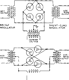 Главная » Журналы » Simple coaxial reflectometer 1 ... 30 31 32 33 34 35 36 ... 80 in amplitude modulation is of no practical value in SSB because the SSB r-f envelopes are so different than the audio envelopes. A heavily clipped wave approaches a square wave and a square wave gives a SSB envelope with peaks of infinite amplitude as shown in figure 7B. Carrier Frequency Stability Requirements Reception of a SSB signal is accomplished by simply heterodyning the carrier down to zero frequency. (The conversion frequency used in the last heterodyne step is often called the reinserted carrier). If the SSB signal is not heterodyned down to exactly zero frequency, each frequency component of the detected audio signal will be high or low by the amount of this error. An error of 10 to 20 c.p s. for speech signals is acceptable from an intelligibihty standpoint, but an error of the order of 50 c.p.s. seriously degrades the intelligibility. An error of 20 c.p.s. is not acceptable for the transmission of music, however, because the harmonic relationship of the notes would be destroyed. For example, the harmonics of 220 c.p.s. are 440, 660, 880, etc., but a 10 c.p s. error gives 230, 450, 670, 890, etc., or 210, 430, 650, 870, etc., if the original error is on the other side. This error would destroy the original sound of the tones, and the harmony between the tones. Suppression of the carrier is common in amateur SSB work, so the combined frequency stabilities of all oscillators in both the transmitting and receiving equipment add together to give the frequency error found in detection. In order to overcome much of the frequency stability problem, it is common commercial practice to transmit a pilot carrier at a reduced amplitude. This is usually 20 db below one tone of a two-tone signal, or 26 db below the peak envelope power rating of the transmitter. This pilot carrier is filtered out from the other signals at the receiver and either amplified and used for the reinserted carrier or used to control the frequency of a local oscillator. By this means, the frequency drift of the carrier is eliminated as an error in detection. Advantage of SSB with Selective Fading On long distance communication circuits using a-m, selective fading often causes severe distortion and at times makes the signal unintelligible. When one sideband is weaker than the other, distor- ![]() PUSH-PULL AUDIO IN Figure 8 SHOWING TWO COMMON TYPES OF BALANCED MODULATORS Notice that a balanced modulator changes the circuit condition from single ended to push-pull, or vice versa. Choice of circuit depends upon external circuit conditions since both the (A) and (B) arrangements can give satisfactory generation of a double-sideband suppressed-carrier signal. tion results; but when the carrier becomes weak and the sidebands are strong, the distortion is extremely severe and the signal may sound hke monkey chatter. This is because a carrier of at least twice the amplitude of either sideband is necessary to demodulate the signal properly. This can be overcome by using exalted carrier reception in which the carrier is amplified separately and then reinserted before the signal is demodulated or detected. This is a great help, but the reinserted carrier must be very close to the same phase as the original carrier. For example, if the reinserted carrier were 90 degrees from the original source, the a-m signal would be converted to phase modulation and the usual a-m detector would deliver no output. The phase of the reinserted carrier is of no importance in SSB reception and by using a strong reinserted carrier, exalted carrier reception is in effect realized. Selective fading with one sideband simply changes the amplimde md the frequency response of the system and very seldom causes the signal to become unintelligible. Thus the receiving techniques used with SSB are those which inherently greatly minimize distortion due to selective fading. ![]() RING MODULATOR DOUBLE-BALANCED -fjJ MODULATOR CARRIER VOLTACE Figure 9 TWO TYPES OF DIODE BALANCED MODULATOR Such balanced modulaior circuits are com-manly used in carrier telephone work and in single-sideband systems where the carrier frequency and modulating frequency are relatively close together. Vacuum diodes, copper-oxide rectifiers, or crystal diodes may be used in the circuits. 17-3 Carrier Elimination Circuits Various circuits may be employed to eliminate the carrier to provide a double sideband signal. A selective filter may follow the carrier elimination circuit to produce a single sideband signal. Two modulated amplifiers may be connected with the carrier inputs 180° out of phase, and with the carrier outputs in parallel. The car- rier will be balanced out of the output circuit, leaving only the two sidebands. Such a circuit is called a balanced modulator. Any non-linear element will produce modulation. That is, if two signals are put in, sum and difference frequencies as well as the original frequencies appear in the output. This phenomenon is objectionable in amplifiers and desirable in modulators or mixers. In addition to the sum and difference frequencies, other outputs (such as twice one frequency plus the other) may appear. All combinations of all harmonics of each input frequency may appear, but in general these are of decreasing amplitude with increasing order of harmonic. These outputs are usually rejected by selective circuits following the modulator. All modulators are not alike in the magnitude of these higher order outputs. Balanced diode rings operating in the square law region are fairly good and pentagrid converters much poorer. Excessive carrier level in tube mixers will increase the relative magnitude of the higher order outputs. Two types of triode balanced modulators are shown in figure 8, and two types of diode modulators in figure 9. Balanced modulators employing vacuum tubes may be made to work very easily to a point. Circuits may be devised wherein 