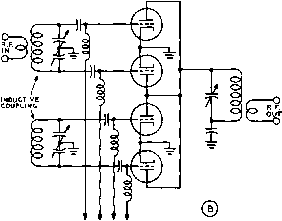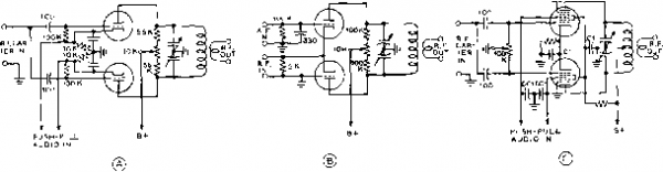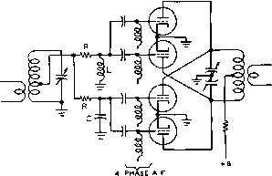 200-3000 AUDIO PHASE SPLITTING NETWORKS PHASe difper£nc€ between St and 2 = 90 phase difference between 1 and 2 = 90 BALANCED MODULATOR MODULATOHl- RADIO FREQ. PHASE SPLITTING NETWORK RADIO FREQ. SIGNAL AT CARRIER FREQ. TO POWER AMPLIFIER STAGES OH DIRECTLY TO ANTENNA SYSTEM Figure 20 BLOCK DIAGRAM OF THE PHASING METHOD The phasing method of obtaining a single-sideband signal is simpler than the filter system in regard to the number of tubes and circuits required. The system is also less expensive In regard to the components required, bat is more critical in regard to adiustments for the transmission of a pure single-sideband signal. at center frequencies of 250 kc. and 455 kc. The 250 kc. series is specifically intended for sideband selection. The selectivity attained by these filters is intermediate between good LC filters at low center frequencies and engineered quartz crystal filters- A passband of two 250 kc. filters is shown in figure 19- In application of the mechanical filters some special precautions are necessary. The driving and pick-up coils should be carefully resonated to the operating frequency. If circuit capacities are unknown, trimmer capacitors should be used across the coils. Maladjustment of these tuned coils will increase insertion loss and the peak-to-valley ratio. On high impedance filters (ten to twenty thousand ohms) signals greater than 2 volts at the input should be avoided. D-c should be blocked out of the end coils. While the filters are rated for 5 ma. of coil current, they are not rated for d-c plate voltage. The Phasing There are a number of points System of view from which the op- eration of the phasing system of SSB generation may be described. We may state that we generate two double-sideband suppressed carrier signals, each in its own balanced modulator, that both the r-f phase and the audio phase of the two signals differ by 90 degrees, and that the outputs of the two balanced modulators are added with the result that one sideband is increased in amplitude and the other one is cancelled. This, of course, is a true description of the action that takes place. But it is much easier to consider the phasing system as a method simply of adding (or of subtracting) the desired modulation frequency and the nominal carrier frequency. The carrier frequency of course is not trans- mitted, as is the case with all SSB transmissions, but only the sum or the difference of the modulation band from the nominal carrier is transmitted (figure 20) - The phasing system has the obvious advantage that all the electrical circuits which give rise to the single sideband can operate in a practical transmitter at the nominal output frequency of the transmiter. That is to say that if we desire to produce a single sideband whose nominal carrier frequency is 3-9 Mc-, the balanced modulators are fed with a З-9-Мс. signal and with the audio signal from the phase splitters. It is not necessary to go through several frequency conversions in order to obtain a sideband at the desired output frequency, as in the case with the filter method of sideband generation. Assuming that we feed a speech signal to the balanced modulators along witti the 3900-kc. carrier (3-9 Mc.) we will obtain in the output of the balanced modulators a signal which is either the sum of the carrier signal and the speech band, or the difference between the carrier and the speech band- Thus if our speech signal covers the band from 200 to 3000 cycles, we will obtain in the output a band of frequencies from 3900.2 to 3903 kc. (the sum of the two, or the upper sideband), or a band from 3897 to 3899.8 kc (the difference between the two or the lower sideband). A further advantage of the phasing system of sideband generation is the fact that it is a very simple matter to select either the upper sideband or the lower sideband for transmission. A simple double-pole double-throw reversing switch in two of the four audio leads to the balanced modulators is all that is required. ![]() 0 ie0 90 270 FOUR-PHASE A F. ![]() 0 teO 90 270 -.-/ FOUR-PHASE A.F. Figure 21 TWO CIRCUITS FOR SINGLE SIDEBAND GENERATION BY THE PHASING METHOD. The circuit of (A) offers the advantages of simplicity in the single-ended input circuits plus a push-pull output circuit. Circuit (B) requires double-ended input circuits but allows all the plates io be connected in parallel tor the output circuit. High-Level Phasing Vs. Low-Level Phasing The piate-circuit efficiency of the four tubes usually used to make up the two balanced modulators of the phasing system may run as high as 50 to 70 per cent, depending upon the operating angle of plate current flow. Hence it is possible to operate the double balanced modulator directly into the antenna system as the output stage of the transmitter. The alternative arrangement is to generate the SSB signal at a lower level and then to amplify this signal to the level desired by means of class A or class В r-f power amplifiers. If the SSB signal is generated at a level of a few milliwatts it is most common to make the first stage in the amplifier chain a class A amplifier, then to use one or more class В linear amplifiers to bring the output up to the desired level. Balanced Modulator Circuits Illustrated in figure 8 are the two basic balanced modulator circuits which give good results with a radio frequency carrier and an audio modulating signal. Note that one push-pull and one single ended tank circuit is required, but that the push-pull circuit may be placed either in the plate or the grid circuit. Also, the audio modulating voltage always is fed into the stage in push-pull, and the tubes normally are operated Class A. When combining two balanced modulators to make up a double balanced modulator as used in the generation of an SSB signal by the phasing system, only one plate circuit is required for the two balanced modulators. However, separate grid circuits are required since the grid circuits of the two bal