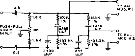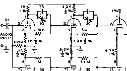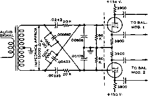 irSO-1950 KC. OSCILLATOR HIGH-Q TUNEDCIRCUIT FOR OUTPUT IN l 00-aOOOKC.BAND Figure 14 BLOCK DIAGRAM OF FILTER EXCITER EMPLOYING A 50-K.C. SIDEBAND FILTER 6AU6 I2AU7 6AL5 -laAU? SHUNT-DIODE imODULATOK K.F. AMPLIFIER .Ot 0.1 7 MH 250jLIUF 6C4 PHASe-INVERfTER 01 ![]() PUSH-PULL R.F. TO BALANCED MODULATOR FOR CONVERSION TO leo METERS Wyr: UNLESS OTHERWISE SPECIFIED; RESISTORS ARE O.S WATT. CAPACITORS IN jjf. Figure 16 OPERATIONAL CIRCUIT FOR SSB EXCITER USING THE BURNELL 50-KC. SIDEBAND FILTER component in tiie whole system-the first sideband filter. It is the function of this first sideband filter to separate the desired 47 to 50 kc. sideband from the unneeded and undesired 50 to 53 kc. sideband. Hence this filter must have low attenuation in the region between 47 and 50 kc, a very rapid slope in the vicinity of 50 kc, and a very high attenuation to the sideband components falling between 50 and 53 kilocycles. Burnell & Co., Inc., of Yonkers, New York produce such a filter, designated as Burnell S-15,ООО. The passband of this filter is shown in figure 15. Appearing, then, at the output of the filter is a single sideband of 47 kc. to 50 kc. This sideband may be passed through a phase inverter to obtain a balanced output, and then fed to a balanced mixer. A local oscillator operating in the range of 1750 kc to 1950 kc is used as the conversion oscillator. Additional conversion stages may now be added to trans- late the SSB signal to the desired frequency. Since only linear amplification may be used, it is not possible to use frequency multiplying stages. Any frequency changing must be done by the beating-oscillator technique. An operational circuit of this type of SSB exciter is shown in figure 16. A second type of filter-exciter for SSB may be built around the Collins Mechanical Filter. Such an exciter is diagrammed in figure 17. Voice frequencies in the range of 200-3000 cycles are amplified and fed to a low impedance phase-inverter to furnish balanced audio. This audio, together with a suitably chosen r-f signal, is mixed in a ring modulator, made up of small germanium diodes. Depending upon the choice of frequency of the r-f oscillator, either the upper or lower sideband may be applied to the input of the mechanical filter. The carrier, to some extent, has been rejected by the ring modulator. Additional carrier rejection is afforded by the excellent passband гоо-зооо 1 гоо-зооо ъ 4S3-4SeKC. SPEECH AMPLIFIER LOW Z PHASE INVERTER 453-4 seKC. SHUNT-QUAD RIN MODULATOR 4SiK.C. MECHANICAL FILTER CONVERTER 4S0-453KC. S3 K.C. OSCILLATOR 3S00 K.C. OSCILLATOR R.F. AMPLIFIER WITH HICH-Q TUNED CIRCUIT FOR OUTPUT ON 3953 KC. Figure 17 BLOCK DIAGRAM OF FILTER EXCITER EMPLOYING A 455-KC. MECHANICAL FILTER FOR SIDEBAND SELECTION 336 Sideband Transnnission THE RADIO l,r.TRAN3 LF. TRANS. ![]() FT-24I CHAHHEL 49 CnySTAL 4ei. I KC. FT-!4I CHANNEL 50 CRySTAL = 4вг.ЯКС. Figure 18 SIMPLE CRYSTAL LATTICE FILTER ш z о э z ш 1-I- < I