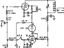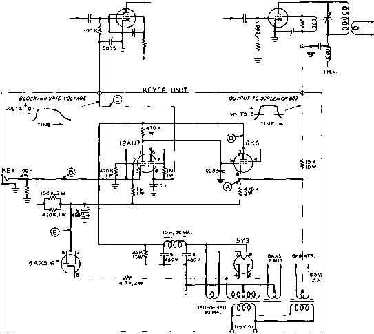 ![]() Figure 16 TWO-STAGE SCREEN GRID KEYER UNIT guished, removing the screen voltage from the tetrode r-f tube. At the same time, rectified grid bias is applied to the screen of the tetrode through the 1 megohm resistor between screen and key. This voltage effectively cuts off the screen of the tetrode until the key is closed again. The RC circuit in the grid of the 6L6 tube determines the keying characteristic of the tetrode tube. A more elaborate screen grid keyer is shown in figures 15 and 16. This keyer is designed to block-grid key the oscillator or a low powered buffer stage, and to screen key a medium powered tetrode tube such as an 807, 2E26 or 6146. The unit described includes a simple dual voltage power supply for the positive screen voltage of the tetrode, and a negative supply for the keyer stages, A бКб is used as the screen keyer, and a 12AU7 is used as a cathode follower and grid block keyer. As in the WIDX keyer, this keyer turns on the exciter a moment before the tetrode stage is turned on. The tetrode stage goes off an instant before the exciter does. Thus any keying chirp of the oscillator is effectively removed from the keyed signal. By listening in the receiver one can hear the exciter stop operating a fraction of a second after the tetrode stage goes off. In fact, during rapid keying, the exciter may be heard as a steady signal in the receiver, as it has appreciable time lag in the keying circuit. The clipping effect of following stages has a definite hardening effect on this, however. 20-8 Differential Keying Circuits Excellent waveshaping may be obtained by a differential keying system whereby the master oscillator of the transmitter is turned 1 ... 36 37 38 39 40 41 42 ... 80 |