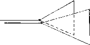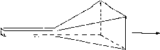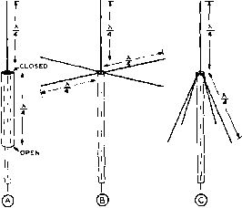 NOTE: Refer fo figure 7 for construction of corner-reflector antenna. ![]() WAVE UUIDE (A) UHF HORN ANTENNA ![]() 450-ohm LINE (D VHF HORIZONTALLY POLARIZED HORN Figure 8 TWO TYPES OF HORN ANTENNAS The two sided horn of Figure 8B may be fed by meons of an open-wire transmission line. Copper screen may also be used for the reflecting planes. The values of spacing given in the corner-reflector chart have been chosen such that the center impedance of the driven element would be approximately 70 ohms. This means that the element may be fed directly with 70-ohm coaxial line, or a quarter-wave matching transformer such as a Q section may be used to provide an impedance match between the center-impedance of the element and a 460-ohm line constructedof no. 12 wire spaced 2 inches. In many v-h-f antenna systems, waveguide transmission lines are terminated by pyramidal horn antennas. These horn antennas (figure 8A) will transmit and receive either horizontally or vertically polarized waves. The use of waveguides at 144 Mc. and 235 Mc, however, is out of the question because of the relatively large dimensions needed for a waveguide operating at these low frequencies. A modified type of horn antenna may still be used on these frequencies, since only one particular plane of polarization is of interest to the amateur. In this case, the horn antenna can be simplified to two triangular sides of the pyramidal horn. When these two sides are insulated from each other, direct excitation at the apex of the horn by a two-wire transmission line is possible. In a normal pyramidal horn, all four triangular sides are covered with conducting material, but when horizontal polarization alone is of interest (as in amateur work) only the vertical areas of the horn need be used. If vertical polarization is required, only the horizontal areas ![]() ANGLE BETWEEN SIDES OF HORN = eO D.