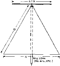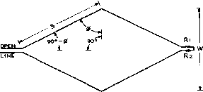 two sides made of wire mesh Figure 9 THE 60° HORN ANTENNA FOR USE ON FREQUENCIES ABOVE 144 MC of the horn are employed. In either case, the system is unidirectional, away from the apex of the horn. A typical horn of this type is shown in figure 8B. The two metallic sides of the horn are insulated from each other, and the sides of the horn are made of small mesh chicken wire or copper window screening. A pyramidal horn is essentially a high-pass device whose low frequency cut-off is reached when a side of the horn is 14 wavelength. It will work up to infinitely high frequencies, the gain of the horn increasing by 6 db every time the operating frequency is doubled. The power gain of such a horn compared to a 14 wave dipole at frequencies higher than cutoff is; 8.4 A Power gain (db) =- where A is the frontal area of the mouth of the hocn. For the 60 degree horn shown in figure 88 the formula simplifies to: Powet gain (db) = 8.4 D, when D is expressed in terms of wavelength When D is equal to one wavelength, the power gain of the horn is approximately 9 db. The gain and feed point impedance of the 60 degree horn are shown in figure 9. A 450 ohm open wire TV-type line may be used to feed the horn. 24-7 VHF Horizontal Rhombic Antenna For v-h-f transmission and reception in a fixed direction, a horizontal rhombic permits HANDBOOK VHF Rhombic 487 ш l d Z < э 55° О 50< TOP VIEW 4Л 64 ex SIDE LENGTH, S 10Л ![]() 0 = TILT ANGLE Rl. Нг= 390 OHMS EACH NON-inducnve Figure 10 V-H-F RHOMBIC ANTENNA DESIGN CHART The optimum tilt angle (see figure ii) for zero-angle radiation depends upon the length of the sides. 10 to 16 db gain with a simpler construction than does a phased dipole array, and has the further advantage of being usehil over a wide frequency range. Except at the upper end of the v-h-f range a rhombic array having a worthwhile gain is too large to be rotated. However, in locations 75 to 150 miles from a large metropolitan area a rhombic array is ideally suited for working into the city on extended (horizontally polarized) ground-wave while at the same time making an ideal antenna for TV reception. The useful frequency range of a v-h-f rhombic array is about 2 to 1, or about plus 40% and minus 30% from the design frequency. This coverage is somewhat less than that of a high-frequency rhombic used for sky-wave communication. For ground-wave transmission or reception the only effective vertical angle is that of the horizon, and a frequency range greater than 2 to 1 cannot be covered with a rhombic array without an excessive change in the vertical angle of maximum radiation or response. The dimensions of a v-h-f rhombic array are determined from the design frequency and figure 10, which shows the proper tilt angle (see figure 11) for a given leg length. The gain of a rhombic array increases with leg length. There is not much point in constructing a v-h-f rhombic array with legs shorter than about 4 wavelengths, and the beam width begins to become excessively вЬаф for leg lengths greater than about 8 wavelengths. Л leg length of 6 wavelengths is a good compromise between beam width and gain. The tilt angle given in figure 10 is based upon a wave angle of zero degrees. For leg lengths of 4 wavelengths or longer, it will be Figure 11 V-H-F RHOMBIC ANTENNA CONSTRUCTION necessary to elongate the array a few per cent (pulling in the sides slightly) if the horizon elevation exceeds about 3 degrees. Table I gives dimensions for two dual purpose rhombic arrays. One covers the 6-meter amateur band and the low television band. The other covers the 2-meter amateur band, the high television band, and the ly-meter amateur band. The gain is approximately 12 db over a matched half wave dipole and the beam width is about 6 degrees. The Feed Line The recommended feed line is an open-wire line having a surge impedance between 450 and 600 ohms. With such a line the VSWR will be less than 2 to 1. A line with two-inch spacing is suitable for frequencies below 100 Mc, but one-inch spacing (such as used in the Gonset Line for TV installations) is recommended for higher frequencies. The Termination If the array is to be used only for reception, a suitable termination consists of two 390-ohm carbon re-