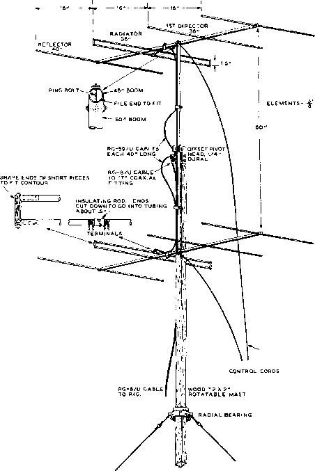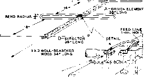 R-REFLECTOR 40 LONG ![]() 6AIN 7.5DB (20L0NG FOR 1-METERS) FLATTEN ENDS OF TUBING AND DRILL FOR 6/32 SCREWS CJi> WOOD BOOM У/ ![]() The rotary multi-element beam is undoubtedly the most popular type of v-h-f antenna in use. In general, the design, assembly and tuning of these antennas follows a pattern similar to the larger types of rotary beam antennas used on the lower frequency amateur bands. The characteristics of these low frequency beam antennas are discussed in the next chapter of this Handbook, and the information contained in that chapter applies in general to the v-h-f beam antennas discussed herewith. A Simple Three The simplest v-h-f beam for Element Beom the beginner is the three-ele-Antenna ment Yagi array illustrated in figure 12. Dimensions are given for Yagis cut for the 2-meter and \Vir meter bands. The supporting boom for the Yagi may be made from a smoothed piece of 1 x 2 wood. The wood should be reasonably dry and should be painted to prevent warpage from exposure to sun and rain. The director and reflector are cut from lengths of copper tubing, obtainable from any appliance store that does service work on refrigerators. They should be cut to length as noted in figure 12. The elements should then be given a coat of aluminum paint. Two small holes are drilled at the center of the reflector and director and these elements are bolted to the wood boom by means of two 1 wood screws. These screws should be of the plated, or rust-proof variety. The driven element is made of a 78 length of /i copper tubing, the ends bent back upon each other to form a folded dipole. If the tubing is packed with fine sand and the bending points heated over a torch, no trouble will be had in the bending process. If the tubing does collapse when it is bent, the break may be repaired with a heavy-duty soldering iron. The Figure 12 SIMPLE 3.ELEMENT BEAM FOR 2 AND IW METERS driven element is next attached to the center of the wood boom, mounted atop a small insulating plate made of bakelite, micarta or some other non-conducting material. It is held in place in the same manner as the parasitic elements. The two free ends of the folded dipole are hammered flat and drilled for a 6-32 bolt. These bolts pass through both the insulating block and the boom, and hold the free tips of the element in place. A length of 75-ohm Twin-Lead TV-type line should be used with this beam antenna. It is connected to each of the free ends of the folded dipole. If the .antenna is mounted in the vertical plane, the 75-ohm line should be brought away from the antenna for a distance of four to six feet before it drops down the tower to lessen interaction between the antenna elements and the feed line. The complete antenna is light enough to be turned by a TV rotator. A simple Yagi antenna of this type will provide a gain of 7 db over the entire 2-meter or ly-meter band, and is highly recommended as an easy-to-build beam for the no vice or beginner. An 8-Element Tippable Array for 144 Mc. Figures 13 and 14 illustrate an 8-eIement rotary array for use on the 144-Mc. amateur band. This array is tippable to obtain either horizontal or vertical polarization. It is necessary that the transmitting and receiving station use the same polarization for the ground-wave signal propagation which is characteristic of this fre- 2ND DIRECTOR 35.5 MAIN BOOMS - APPROX. O.D. ![]() ENDS OF TUBING WOOD DOWELS INSIDE FOR STRENGTH AS SHOWN, ANTENMA IS HORIZONTALLY POLARIZED. PULL TO SWI MG MAIN BOOM 90° FOR VERTICAL POLARITY. CONSTRUCTIONAL DRAWING OF Figure 13 AN EIGHT-ELEMENT TIPPABLE 144-MC. ARRAY quency range. Although polarization has been loosely standardized in various areas of the country, exceptions are frequent enough so that it is desirable that the polarization of antenna radiation be easily changeable from horizontal to vertical. The antenna illustrated has shown a signal gain of about 11 db, representing a power gain of about 13. Although the signal gain of the antenna is the same whether it is oriented for vertical or horizontal polarization, the horizontal beam width is smaller when the antenna is oriented for vertical polarization. Conversely, the vertical pattern is the sharper when the antenna system is oriented for horizontal polarization. The changeover from one polarization to the other is accomplished simply by pulling on the ![]() Figure 14 THE EIGHT-ELEMENT 144.MC ARRAY IN A HORIZONTAL POSITION appropriate cord. Hence, the operation is based on the offset head sketched in figure 13- Although a wood mast has been used, the same system may be used with a pipe mast. The 40-inch lengths of RG-59/U cable (electrically wavelength) running from the center of each folded dipole driven element to the coaxial T-junction allow enough slack to permit free movement of the main boom when changing polarity. Type RG-8/U cable is run from the T-junction to the operating position. Measured standing-wave ratio was less than 2:1 over the 144 to 148 Mc. band, with the lengths and spacings given in figure 13. Construction of the Array Most of the constructional aspects of the antenna array are self-evident from figure 13. However, the pointers given in the following paragraphs will be of assistance to those wishing to reproduce the array. The drilling of holes for the small elements should be done carefully on accurately marked centers. A small angular error in the drilling of these holes will result in a considerable misalignment of the elements after the array is assembled. The same consideration is true of the filing out of the rounded notches in the ends of the main boom for the fitting of the two antenna booms. Short lengths of wood dowel are used freely in the construction of the array. The ends of the small elements are plugged with an inch or so of dowel, and the ends of the antenna booms are similarly treated with larger discs pressed into place. 1 ... 45 46 47 48 49 50 51 ... 80 |