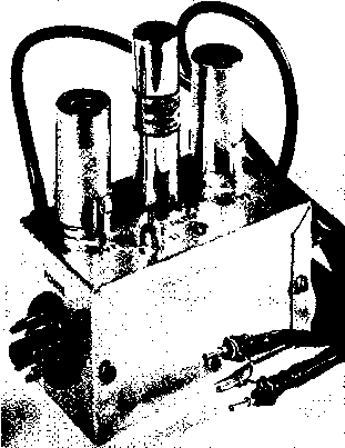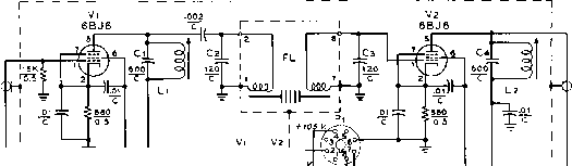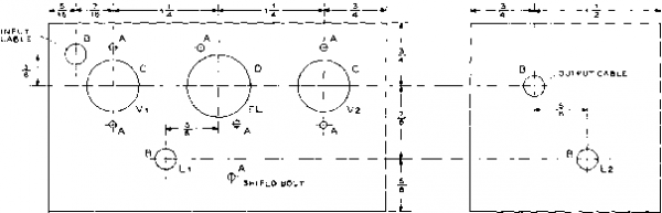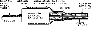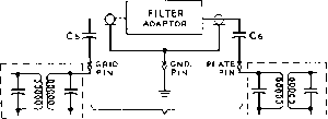 то GRI D PIN l-F TUBE SOCKET Figure 11 OPTIONAL A-V-C CONNECTIONS FOR THE ADAPTER overloading when no plate current flows through the input coil. Both filter coils are tuned to resonance at the intermediate frequency by fixed capacitors Cs and Сз. The output terminals of the mechanical filter are connected directly to the input circuit of the second 6BJ6 tube. The output signal from this tube is again capacitively coupled back into the plate circuit of the first i-f stage of the receiver through a second coaxial line and coupling capacitor The 455 kc. tuned circuits connected to the plate of Vi and V: are composed of loopstick -type coils Li and Ls, shunted by fixed capacitors Ci and Ct. The input and output coaxial cables are 16-inch lengths of RG-58/U line. This cable forms a 40 ju,/afd. ground leg of a capacitor voltage divider (C5 being the other leg) that reduces the signal voltage applied to Vi to about one-quarter of the voltage developed across the secondary of the first i-f transformer of the receiver. The overall signal amplification of the adapter has been held down to a few decibels more than the 10 db insertion loss of the filter through the use of small input and output coupling capacitors and large cathode bias resistors in both amplifier stages. This is suitable for receivers having two or more i-f amplifier stages, but additional gain from the adapter may be obtained by reducing the value of one or both cathode resistors to 270 ohms. This may be desirable when the adapter is operated with a receiver having only one i-f amplifier stage. Power is brought into the adapter unit through an eight-pin male plug. Connections to this plug are made so that the plug may be inserted into the NBFM adapter socket on certain National receiver models- Many communications receivers have an accessory power socket on the rear of the chassis from which power may be obtained. Adapter requirements are 6.3 volts at О.З amperes, and 105-250 volts at 10 milliamperes. This is little more than the power requirements of the i-f tube replaced by the adapter. A 250-volt supply source requires that an 18K, 12-watt screen voltage dropping resistor (Ri) be connected between pins 4 and 8 of the power plug receptacle. When the d-c supply is 130-volts or less, a jumper may be placed directly between pins 4 and 8 (see figure 10). A method of applying automatic volume control voltage from the receiver to the second amplifier stage in the adapter is shown in figure 11. This modification is mainly useful when the adapter is connected to a receiver that has few a-v-c controlled stages. The automatic volume control voltage is taken from the control grid pin of the i-f amplifier tube socket through a simple R-C filter and is applied to the control grid of through the output coil of the mechanical filter. ![]() 2- X 4 MINIBOX (BUD CU-3003 OR EQUIVALENT) Figure 12 CHASSIS DRILLING TEMPLATE FOR ADAPTER A; #32 diiU, B: 9/32 МП, С; 5/8 dinmeter socket punch, D: 3/4 diameter socket punch Con$trucHon The adapter is constructed ef Ae Adapter on an aluminum box measuring 214 X 214 X 4 , a good compromise size that is compact, yet not too small for easy wiring. The primary design and construction consideration of this adapter is to completely isolate the input and output circuits. Any stray coupling can cause signal leakage around the filter unit, thus imparing its effectiveness. The construction shown allows maximum isolation, yet permits simplicity of construction. A drilling template for the box is given in figure 12, and the placement of the major components may be seen in figures 8, 13, and 14. Note that the input and output circuits are isolated within the box by a shield passing across the center of the filter socket. After drilling and punching all holes, the tube and mechanical filter sockets, power plug, and rubber grommets may be assembled. Place solder lugs under all socket retaining bolts for ground connections- Before any wiring is done a 3 x 3 piece of perforated alumimmi {Reynolds Do-it-yourself aluminum, available at large hardware stores) is formed into the shield shown in figures 13 and 14. A Ys flange is bent along all edges of this shield except where it crosses the center of the 9-pin filter socket. A small notch is cut in the shield next to the socket to pass the heater and plate power leads to the socket. The shield passes across the filter socket between pins 3 and 4, and 8 and 9, then is bolted to a soldering lug that has been soldered to pin 1 of the filter socket. The flange is also bolted to the top of the box directly above coil L2, and two self-tapping sheet metal screws are driven into the side flanges of the shield when the other half of the box is assembled. Cable Constructing the two i-f tube Assembly socket cables takes litde time if the assembly shown in figure 15 is followed. First, cut two lengths of RG-58/U coaxial cable 17 inches long and remove 1V2 inches of the vinyl cover on one end of each piece. Slide the braided outer shield back over the outer cover and trim the insulation and center conductor so that V2 inch protrudes beyond the shield. Next cut the insulation to expose 14 inch of the center conductor and trim one lead of the coupling capacitor Cs soldering it to the center conductor with a 14 inch overlap. Cut narrow strips of plastic insulating tape and wrap them around this joint up to the body diameter of the capacitor as shown in figure 15. Finally, slide the braided shield over the capacitor, pull it tight and wrap a short length of tinned copper wire twice around the middle of the capacitor. Solder the wire to the shield and trim off the excess shielding. The tinned wires from each cable are then soldered to a pin taken from an octal tube base, making a plug-in ground connection as shown in figure 8. Similar tube base pins are soldered to the other leads, and rhe excess lead trimmed off. The exposed cable shield is then wrapped with plastic tape. If the recei