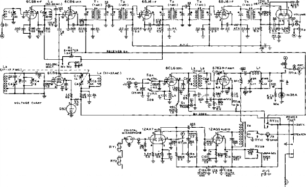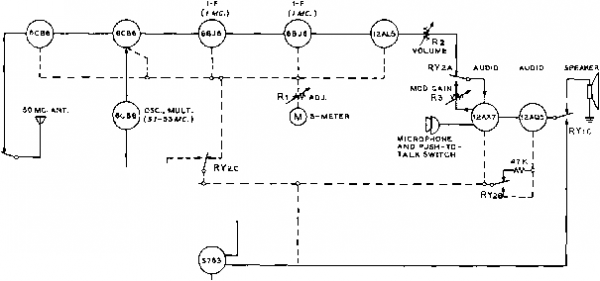 SEE FieuKB 35 DUMMY LOAD BASE VIEW ![]() CND. [-6,12 V.I SOLDER SIX S.3 VOLT, ISO MA. BULBS TOGETHER. JUMPER CENTER TERMINALS TOGETHER. r4 2,3 бСВй OSC. Figure 32 SCHEMATIC, SIX METER TRANSCEIVER Coil data and i-t iranstormer nmditication it given in figure 35. Relay and meter connections are given in figure 31. Cj-Ct-Cs-6-30 /4ifd. Centralab 827C RYi, RYi-3 pole, double throw with 6.3 volt d-c coil. Advance #MG-3C6VA Ci-C,-Sg-C,-3-12 liiifd. Centralab 827B Ti-Ti-7500 kc. if transformer. J. W. Miller Co. 72-W7 C-Ca-75 fiiifd. per section. All-Star Products Co., Defiance, Ohio. Model C3 (see figure 35 for moditieation) C, -7 lifLtd. variable piston-type . Crie 532B T,-5 К pri., 6.7 К sec, and 4 ohm winding. Triad M5-Z - - ..t м,.мтлг1ип<1 HF-35 -Amperlte Ballast Tube #3TF-4A mounted to the chassis and may be tuned from the top of the unit, with the exception of the receiver oscillator trimmer Ct which is mounted below chassis to conserve space. Below the chassis, a small aluminum shield measuring VA long and 1й high is positioned between the oscillator output coil and the receiver r-f amplifier plate coil L2, This is the only interstage shield required in the transceiver. The two transfer relays RY-1 and RY-2 are mounted in the under-chassis area beneath the modulation transformer Tg. Between the relays is placed an 8-terminal phenolic mounting strip. To the side of this strip is placed the midget S-meter potentiometer Ri. All sockets and trimming capacitors are mounted in place using 4-40 hardware with soldering lugs placed beneath the nuts in various convenient locations. Transceiver The wiring of the unit is quite Wiring simple if done in the proper sequence. The underchassis area contains many small components but these need not be crowded, provided proper care is taken in the layout and installation of parts. Be sure the i-f transformers have been modified accord- ing to the data of figure 35 before wiring is started. The majority of components are installed between the socket pins of the various tubes and five large phenolic terminal strips. One of these strips (previously mentioned) is placed between the two transfer relays. A four terminal and a six terminal tie-point strip are mounted in line running parallel to the i-f tube sockets of the receiver, towards the chassis-edge side of the sockets. The i-f stage components mount between these tie-points and the pins of the 6BJ6 and 12AL5 tube sockets. A fourth terminal strip (8 tie-points) is parallel to and directly beside the edge of the chassis adjacent to the r-f tube sockets of the receiver. The smaller components of the r-f section mount between this strip and the pins of the 6CB6 sockets. The r-f coils of the receiver section (Li, L2, La, and L4) are mounted directly to the ceramic trimming capacitors associated with each coil. The interstage coupling coils (Ls and Le) of the transmitter section are mounted to their respective trimming capacitors and may be seen in the center of the chassis in figure 34. ![]() Figure 33 REAR VIEW OF SIX METER TRANSCEIVER CHASSIS Receiver section of unit is ai rigfii witft trimmer capacitors seen on cftas-sis cfecfc. Center section of tftree gang variable capacitor is unused. Transmitter output controls are located at upper left. Filament voltage regulator tube is at rear of chassis, just above modulation level control potentiometer. 5763 amplifier tube is behind modulation transformer, with shielded 6CL6 tube io right. I-f strip runs along center of chassis. Antenna and speaker plugs and power receptacle are along rear lip of chassis. Receiver audio control is at upper right of front panel. After all major components have been mounted to the chassis the various socket ground connections should be made, followed by the filament wiring. The speech amplifier should be wired next, taking care to place small components directly between socket pins to conserve space. All the small components of the i-f system can be mounted above the tube sockets, and in the space between the sockets and the tie-point strips. The power leads from the wired sections of the transceiver should now be run to the two relays. The next step is to complete the receiver wiring. Shielded leads are run to the volume control Rs mounted in the upper-left hand corner of the receiver panel (as viewed from the front). The S-meter wiring circuit should be completed as the final wiring step. Note that the case of potentiometer Ri is hot and should be insulated from the chassis with fibre bushings. Receiver The receiver may be tested be-Check-out fore the transmitter wiring is done. Relays RY-l and RY-2 are in an unenergized position during reception. Examine both relays to make sure that the back contacts (normally closed) are in good operating condition. FIGURE 35 COIL TABLE FOR six METER TRANSCEIVER Ll, Lz, l4-BTUBNS NleE., 3/8 DIAM., 1/2 LONG. l3-7turns №16 E., 1/2 DIAM., 1/2 LONG. Csetv COIL STOCK) Ls, L6- 10 TURNS №226., 5/16 DIAM., 5/16 LONG. ADJUST SPACING BETWEEN COILS FOR MAXIMUM GRID DRIVE, COILS MOUNTEND TC END. l7-6turns № le 1/2 DIAM.. 5/8 LONG. AIRWOUND, Tl,T5-REPLACE lOOJUUFD PADDING CAPACITORS WITH SOOililFD CAPACITORS TO RESONATE Wl NDINGS TO 1 MC. A pov/er supply capable of delivering 250 volts at 100 milliamperes and 12.6 volts at 3 amperes is required to test the transceiver. A 4-ohm loudspeaker is also required- The receiver is energized and the important voltage points are checked with a high resistance voltmeter and should comply closely with the values of figure 32. When the receiver section is determined to be in operational order, a tone modulated 1 megacycle signal should be loosely coupled to the plate circuit of the 6CB6 mixer tube (pin 5) and the slug cores of all i-f transformers tuned for maximum audio signal. As the stages are bought into resonance, the input signal to the mixer tube should be reduced to prevent over-excitation of the stages. Figure 34 UNDER-CHASSIS VIEW OF TRANSCE