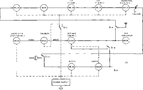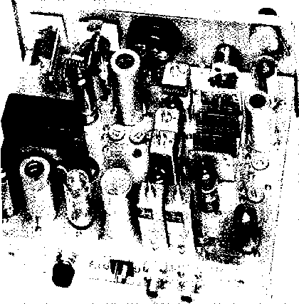Главная » Журналы » Simple coaxial reflectometer 1 ... 52 53 54 55 56 57 58 ... 80 Figure 27 UNDER-CHASSIS VIEW OF WALKIE-TALKIE SHOWING MAJOR COMPONENTS Cbaais of transceiver is specially bent to fit components in smallest possible space. Oscillator coil Li is at left separated from tripler coil Ls by small shield. Output coil Ls is to rear. 5676 detector tube is at right rear, flanked by 20 jxtd. filter capacitor. Audio tubes are under chassis partition at right. Quench filter capacitors are to right of coil Ls. ![]() These adjustments may be done quickly and easily with the aid of a grid dip oscillator. After the r-f circuits are adjusted the rest of the transceiver may be wired- Short, direct leads should be used in the r-f circuits and all wires should be routed in the shortest possible paths. Transceiver After all wiring has been check-Alignment ed, the tubes should be removed from their sockets and the filament batteries connected to the unit- The filament voltage at each tube socket should be checked in all three operating positions of switch Sl. JVlake sure the second filament section of the 3Q4 (pin #7) is energized in the transmit position of Si. The bias batteries and B-plus batteries may now be attached to the proper leads. Be sure of the correct battery polarity before inserting the tubes in the sockets. Test the handie-talkie for proper reception first. The slug of coil Ь should be adjust- ed for best reception after the transceiver is assembled and the whip antenna placed in the coaxial receptacle. However, it is possible to place a short piece of wire in the antenna receptacle to pick up a test signal while the transceiver is dissembled on the bench. The coupling between Ь and La should be adjusted for best super-regenerative action and sensitivity . After the receiver is operating, the transmitter should be energized- Tune the slug of coil L4 for reliable crystal operation. A grid dip oscillator held in the proximity of L4 will serve as a r-f indicator. Remove the plate voltage from the grid dip oscillator for this test. Alternatively, oscillator operation may be monitored in a nearby receiver tuned to the 24 Mc. overtone frequency of the crystal. The 3A4 tripler stage may now be tuned for maximum output on 72 Mc. as indicated on the grid dip oscillator. Finally, the grid dip oscillator (or wavemeter) is held in close proximity Figure 28 TRANSCEIVER CHASSIS BOLTED TO PANEL OF WALKIE-TALKIE The chassis is held in place by bolts passed through frame of small speaker. Modulation transformer Tt is visible in foreground with Centralab Couplate at rear of audio tube sockets. Batteries occupy space to left above microphone. Crystal socket is at far right, which is top end ot transceiver. ![]() to the 144 Mc. doubler plate coil, Le. This coil is tuned for maximum output at 2 meters. After this preliminary alignment is completed the chassis of the transceiver may be placed in the case, along with the battery power pack. Finol Experience with several of these Alignmeni- units has shown that maximum output is obtained with a whip antenna slightly longer than quarter wavelength. The transmitter stages should be retuned for maximum field strength in a nearby wavemeter and different length whip antennas should be tried. The quarter wavelength whip is nineteen inches long, but whip lengths up to twenty-seven inches should be tried. In general, whip lengths of twenty-four inches or so seem to produce best results with this little transceiver. Input to the final stage of the 3A5 is approximately )2-watt under optimum loading conditions. The operating range between two of these units varies from a thousand feet or so over obstructed terrain to better than three miles over smooth ground. Communication between the handie-talkie and a base station equipped with a sensitive receiver and a high gain beam can be maintained over greater range. 27-6 Six Meter Transceiver for Home or Car The six meter band has become extremely popular within the past few years. The pinnacle of the sunspot cycle, combined with the influx of new amateurs has brought life to an otherwise neglected amateur band. Most of the stations operating on this band employ relatively low power and the amateur having modest power suffers no handicap if he has a good antenna. The growth of mobile operation on the six meter band has been rapid and the need has arisen for a compact transceiver that will work well either in the car or at home. The unit described in this section has been designed to meet this need. This compact transceiver operates in the 50-54 Mc. range. It employs a stable, superheterodyne type receiver and a 10 watt transmitter. The transmitter may be either crystal controlled, or driven with an external variable frequency oscillator. A 5-watt audio system operates from a high impedance crystal microphone and provides 100% modulation of the transmitter. In the receiver mode, the audio system delivers sufficient power to drive an external speaker well above the noise level of the automobile. Small enough to fit comfortably under the dash of todays car, the transceiver delivers a well modulated signal at a total plate power drain of 100 milliamperes at 250 volts potential. Voltage regulation of the plate and filament voltages of the receiver oscillator ensures the maximum stability required for mobile work. Transceiver A block diagram of the trans-Circuit ceiver is shown in figure 30. Eleven tubes are employed, plus a filament voltage regulator. Change-over from receive to transmit is accomplished by a push-to-talk circuit that operates two d-c relays from the microphone control button. The receiver employs a broad-band r-f stage and two i-f stages. The r-f stage uses a 6CB6 television-type pentode with pre-tuned grid and plate circuits. This stage is capacity coupled to a second бСВб mixer operating with grid injection. The variable frequency oscillator is a third бСВб in a Tri-tet configu