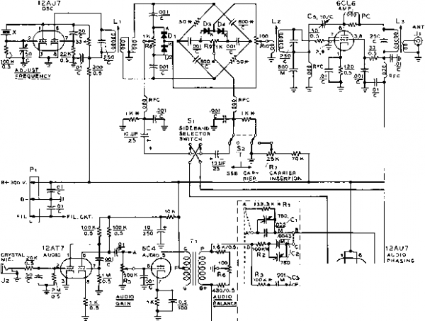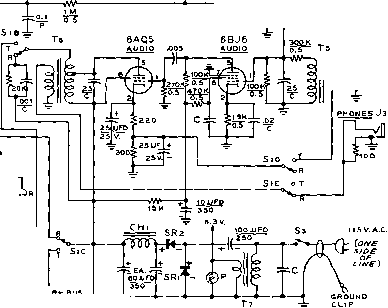 CAIN У CONTROL Figure 2 BLOCK DIAGRAM OF PHASING-TYPE SIDEBAND EXCITER Only five tubes are required in this simple phosing-type sideband exciter. Audio system has sufficient gain to operate from crystal microphone. ohms in the center of the 80 meter phone band. Bridge balance and carrier eUmination is achieved by adjustment of the variable potentiometers (Re, Ra, Rio) in the bridge circuit. Four selenium diodes are used in the modulator circuit. A 1N82 multiple diode assembly may be employed, or four 1N81 diodes whose front/back ratios are equal may be used. The output of the balanced modulator network is coupled by a low impedance link to the grid circuit of a neutralized 6CL6 linear amplifier. This stage operates class ABi with cathode bias, delivering a 3 watt peak SSB signal to a low impedance load circuit. All circuits are tuned by adjustable slug-tuned coils (Ll, Ъ, and La). A cascade 12AU7 and a 6C4 comprise the speech amplifier which may be driven from a crystal microphone. The output of the 6C4 is transformer coupled into the audio phase shift network PS-1. An interstage transformer is connected backwards for Ti, providing a relatively low impedance secondary winding delivering two equal audio voltages that are 180° out of phase. These voltages are applied to the special audio network whose output circuits drive separate triode sections of the 12AU7 audio phasing amplifier. The 12AU7 tube functions as a dual cathode fol- Figure T THE GLOVE COMPARTMENT SIDEBAND EXCITER This miniature phasing-type SSB exciter may be mounted in the glove compartment of a car with room io spare! Using only four tubes the exciter delivers a 3 watt peafc sideband signal capable of driving a kilowatt tetrode amplifier to full output. The J2AU7 and 6CL6 r-f tubes are at the right end of the chassis, along with the crystal. Major tuning controls are on the right end of the chassis. Entire unit is bolted to the roof of the glove compartment. lower which provides the necessary low impedance required to match the r-f phasing network. Sideband switching is accomplished by reversal of polarity of the audio channels by switch Sl. The diode modulator may be unbalanced to pass a carrier for tune-up purposes by throwing carrier insertion switch Ss to the right pjid biasing the diode modulators by means of carrier insertion control R?. Power requirements for the transmitter are 300 volts at a current drain of 100 milliamperes, and 6.3 volts d-c at 1-85 amperes. When the filaments are connected for 12.6 volt op- ![]() FILAMENT CONNECTIONS -----TJUJoj 7C4 S 300