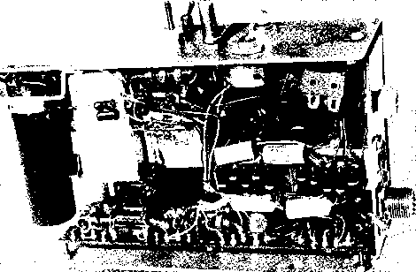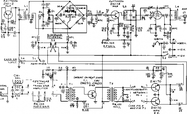 Figure 10 SCHEMATIC OF TRANSISTORIZED FORTY METER SSB EXCITER Cj-2Sjj.jj.fd. Variable ceramic capacitor. Centralab 823-DZ L,-35 turns #22 enamel, /3 diam., elosewound on Hational XR-50 form. Start with two turn bifilar winding (see figure 8, section 28-1 for bifilar detail). Mount coil assembly in small shield can. Lz, L.-Some OS L,. Mount 1.. in small shield can. Lj-Same as L,. Tap 18 turns from cold end. Mount in small shield can. RFC-2.5 mh. miniature r-f choke. Millen J300 - 2500 T,- IK pri., 60 ohm see. transistor transformer, Chicago UM-111 Тг-95K sec, ISK pri. [use bdckwords; VrC-07 CH,-200K pri., 1 К sec. transistor transformer. Use primary only. Chicago UM-112 X-7.2 - 7.3 Mc crystal Di-D -Matched 1N81 Diodes; see text. dition. The concept of transistor action is new and novel to many amateurs; it is not easy to run to the corner radio store and test a transistor to make sure it is operating properly. Exciter The complete schematic of the Circuitry transistorized exciter is shown in figure 10. It is derived from the vacuum tube exciter circuit of figure 3, section 1, and employs phasing technique on the frequency of operation. A 2N112 transistor is used as a grounded emitter crystal oscillator employing crystals in the 7.2 - 7.3 Mc. range. The r-f output is coupled through a tuned circuit and a bifilar winding to the crystal diode balanced modulator. The output in turn drives a 2N114 r-f amplifier stage, operating in grounded emitter configuration. A base bias potentiometer Ki is included in this stage which permits parameter adjustment for maximum output. The collector of the transistor is tapped at a point on the grid inductor of the linear amplifier stage providing maximum drive without exceeding the transistor ratings. A 12BY7A is used as the linear amplifier stage. Neutralization is employed for greatest circuit stability, and VHF parasitic oscillations are eliminated by the use of a parasitic suppressor in the plate circuit. The subminiature transistorized audio amplifier used in this exciter has a rising frequency characteristic that is well suited for SSB work. However, the rising response carries well into the upper audio range wherein the phase shift networks of the PS-1 unit cease to function properly. It is therefore nec- essary to incorporate a simple low-pass filter that will substantially eliminate all audio frequencies above 3000 cycles. Such a filter is incorporated in the circuit between the microphone input jack J2 and the transistorized audio amplifier. The filter consists of the primary winding of a small audio transformer (CHi) and two 250 ju.ju.fd capacitors. The output signal from the encapsulated transistorized amplifier is transformer coupled to a 2N250 (or a 2N255) power transistor which serves as a driver for the phase shift network. The 2N250 transistor requires a heat sink for the collector to allow maximum collector dissipation rating to be achieved. The transistor may therefore be mounted on ano-dized aluminum discs or mica wafers (supplied by the manufacturer of the transistor), thus insulating the case of the transistor (the collector terminal) from the chassis of the exciter. The phase shift network driven by this transistor is identical to that described in section 28-1 and illustrated in figure 7- Two 2N170 NPN type transistors are base driven by the phase shift network, and serve as emitter followers, providing a low impedance driving source for the balanced modulator. Sideband selection is accomplished by switch S2 whose purpose is to reverse the phase of the audio signals applied to the balanced modulator. Carrier injection is accomplished by potentiometer Rs and switch Si which apply conducting bias to the modulator diodes. A voltage dropping network is employed ![]() Figure 11 UNDER-CHASSIS VIEW OF TRANSISTORIZED SSB EXCITER The audio and r-f networks are mounted on a phenolic sheet attached ta the bottom of ihe chassis. The I2BY7A linear amplifier and shield are mounted on a small aluminum bracket ai ihe left of the assembly. Grid coil L3 is beside the tube, and plate coil Li is behind the tube. Coil Ll is to the right of Lj with sideband switch St behind it. The two r-f balancing controls Ri and Rt are at the extreme right of the chassis panel. to reduce the 12.6 volt primary supply to 9 volts for the 2N170 stage, and to 4 volts and 2У2 volts for the preamplifier stage. The exciter is designed for use with a primary supply having the positive terminal of the battery grounded. Exciter The exciter is built within Construction an aluminum case measuring 71Д x 4 x IV2 in size. Miniaturization of the audio phase shift network was accomplished by measuring a quantity of resistors and capacitors on a bridge. Final selection was made from those having the closest tolerances. These hand picked components are mounted on a phenolic terminal strip. This same sheet is used to support the small r-f chokes as well as the balanced modulator components. It is a good idea when building equipment to fit in a limited space to construct everything in the form of sub-assemblies. This will permit the components to be mounted in the open, facilitating wiring. In this particular unit, the audio components and the r-f modulator are mounted on a phenolic board on one side of the box and the r-f components are attached to the opposite wall of the box. The oscillator coil Ll is placed within an old i-f transformer can as is the linear amplifier grid coil Ls. The 12BY7A tube is mounted on a small bracket at one end of the box, and has a tube shield placed over it. The plate coil Li of the amplifier stage is directly behind the tube (figure 11). Various voltage dropping resistors are mounted on a small terminal board at the center of the chassis, and the audio transistors are placed in the area between the lower terminal board and the rear wall of the case. The r-f circuits are wired after the component boards are mounted in place. Wiring is straightforward and 