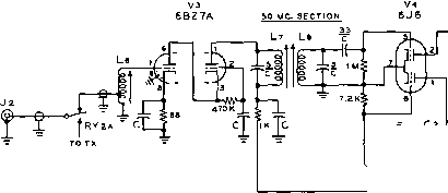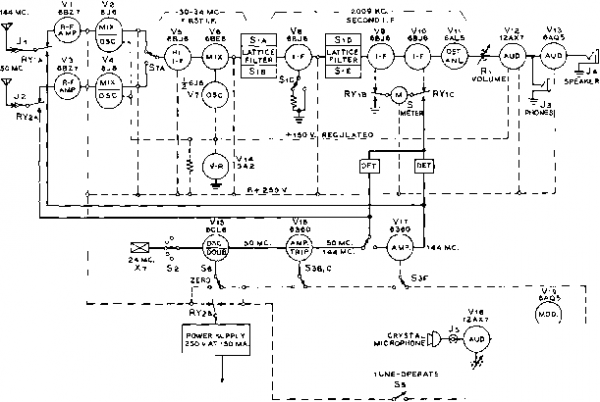 Figure 13 BLOCK DIAGRAM OF 2-6 METER TRANSCEIVER Twenty lubes plus selenium rectifier power supply provide de-luxe operation for the advanced VHF enthusiast. Power supply may be operated from either automobile electrical system or 115 volts, a.c. 6AL5 (Vii) is employed as detector, a-v-c, and a-n-1 tube. The noise limiter is of the low distortion type and is left in the circuit at all times. One section of the 6AL5 serves as the a-v-c rectifier, and the resulting voltage is applied to four i-f tubes for smooth a-v-c action on strong signals. The last i-f stage (Vm) is left off the a-v-c line, and the S-meter is connected between the plate supply return of this tube and an adjacent controlled tube. A change in the plate current of the controlled tube (Va) upsets the balance of the bridge circuit, and a meter reading is produced that is proportional to the a-v-c voltage. This voltage is also applied to one section of a double triode audio tube (V12) which functions as a squelch tube. This circuit renders the audio section of the receiver inoperative until the receiver a-v-c circuit is activated, thus eliminating a large portion of the background noise commonly associated with VHF reception. The squelch circuit may be disabled by switch Sa. Two audio stages (V]2 and Угг) deliver sufficient audio power to fully drive a loudspeaker and to overcome the motor and wind noises of a car in motion. An auxiliary jack (]з) provides earphone reception if desired. The receiver is inactivated during transmission periods by relay contacts RY2B which remove the high voltage from the plates and screens of the receiver tubes. The Transmitter Section. Shown in figure 17 is the transmitter section of the transceiver. Six tubes are used, three for the audio portion of the unit and three for the r-f portion. Crystals in the 24 - 25 Mc. region are employed for both 6- and 2-meter operation. Any one of eleven crystals may be selected by switch S2. The oscillator is a 6CL6 (Vu) in a hot-cathode doubler circuit, delivering energy in the 48 - 50 Mc. region. A split-stator tuning capacitor is employed in the plate circuit to provide a balanced output configuration. The oscillator stage may be turned on during re- 144MC, 50 MC Vi 6BZ7A 1ДД MC. SECTION Ls l4 с 470K 1 7.2 к]; ikJc mj ti Ls С с -bte£t. bth.y- ![]() NOTES; 1. see Fis. fe for filament wiring. a. с- .001 disc ceramic 3. ALL resistors гул watt l9 LZ- b± 0* S7A c -oS7D (see fis. le for sections bsc ) - l-F OUT О ® see figure >s Figure 14 SCHEMATIC/ R-F PORTION OF RECEIVER SECTION С-.001 дМ. disc ceramic capacitor. Centralab DD-I02 Cj, Cl-20 /ifitd. Johnson 20M11 J Jl-BNC-type coaxial receptacle L,-Ls-See figure 21 for coil information S7A, D-Pari of 57 (Centralab wafer PA-9} See figure 18. RYiA, RYiA-See figure 19 Xl-114 Mc. overtone crystal. Precision Crystal Lab., Santa Monica, Calif. X,-84 Mc. crystal (see Xj) 1 ... 54 55 56 57 58 59 60 ... 80 |